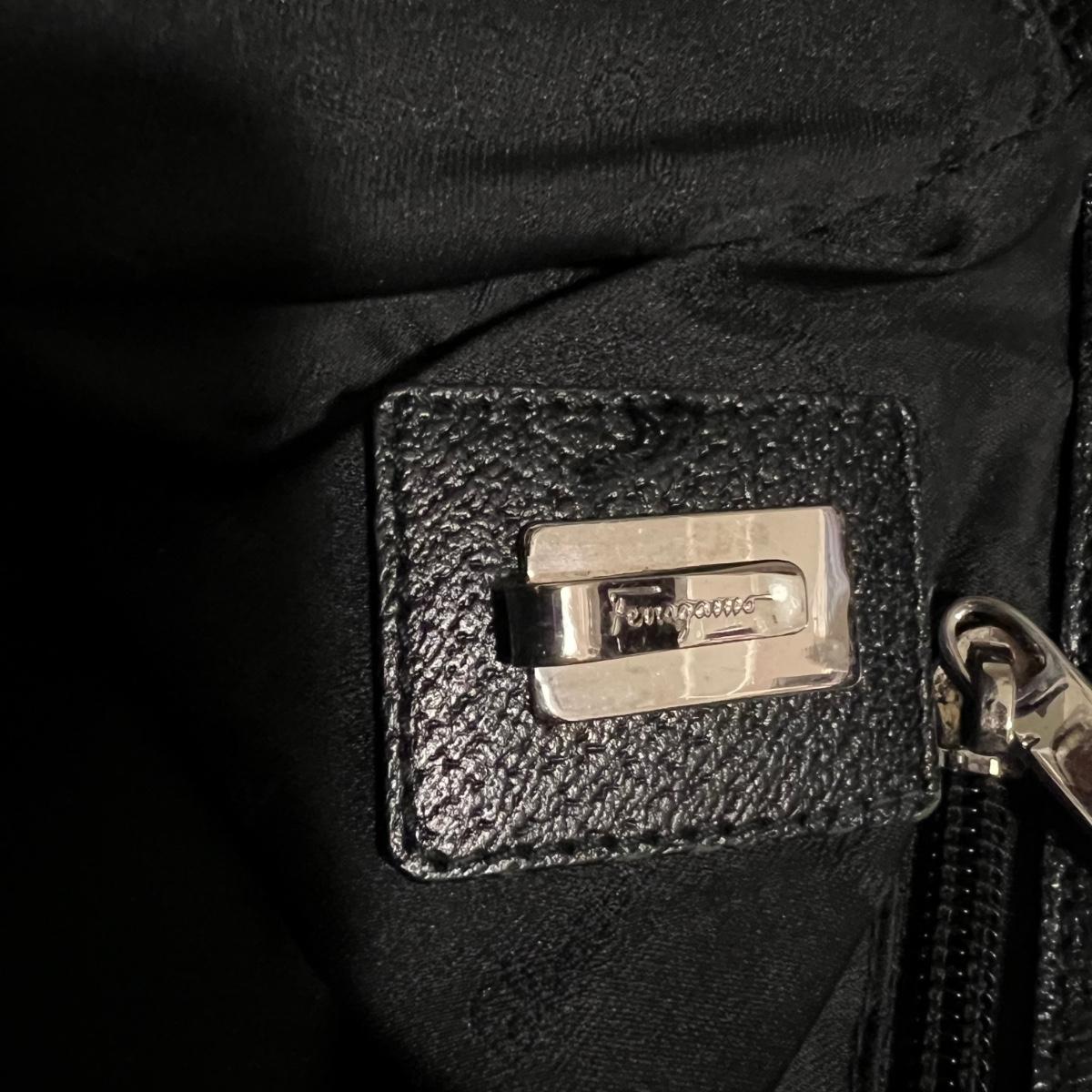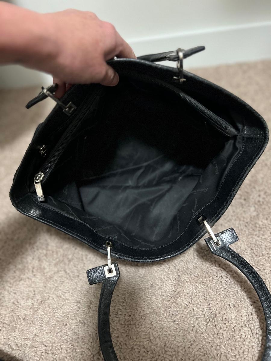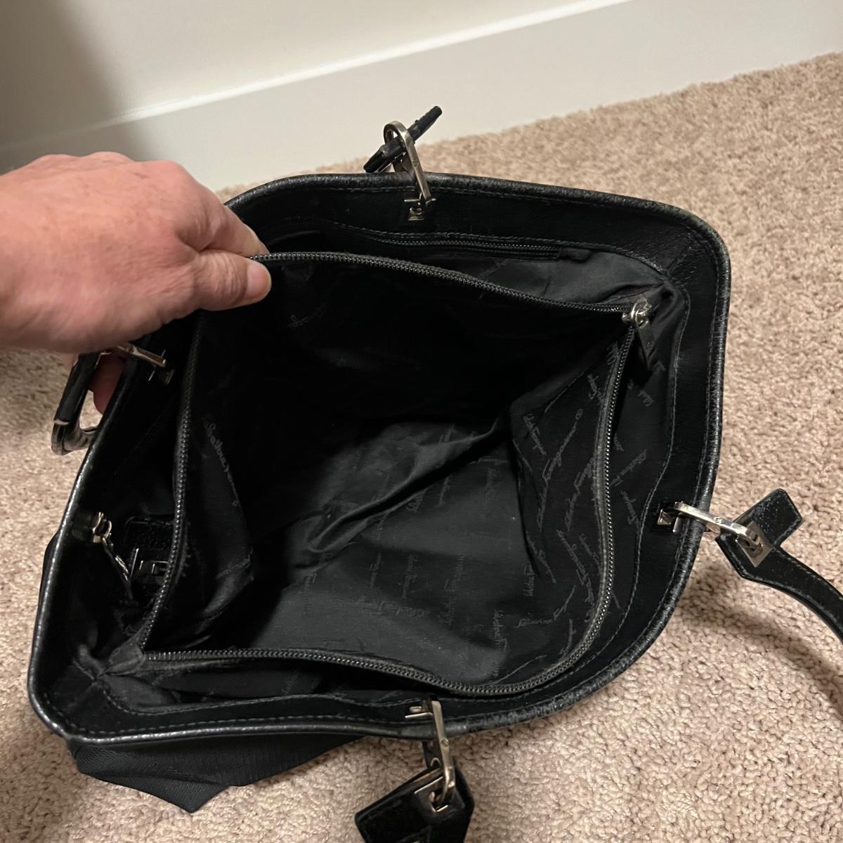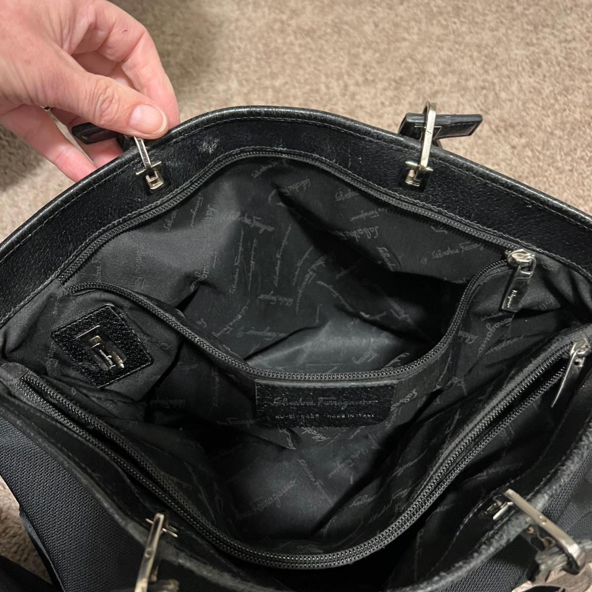 This Tutilo black satin bag is a small backpack with a grey interior, perfect size for a laptop and other workday essentials. We have paired it with a nice sized small tote bag made by Salvatore Ferragamo. Also black, this purse has a lined black interior with plenty of compartments to stay organized. Both bags each have a few light marks that could possibly come clean, see images.