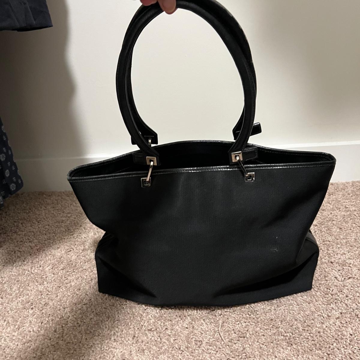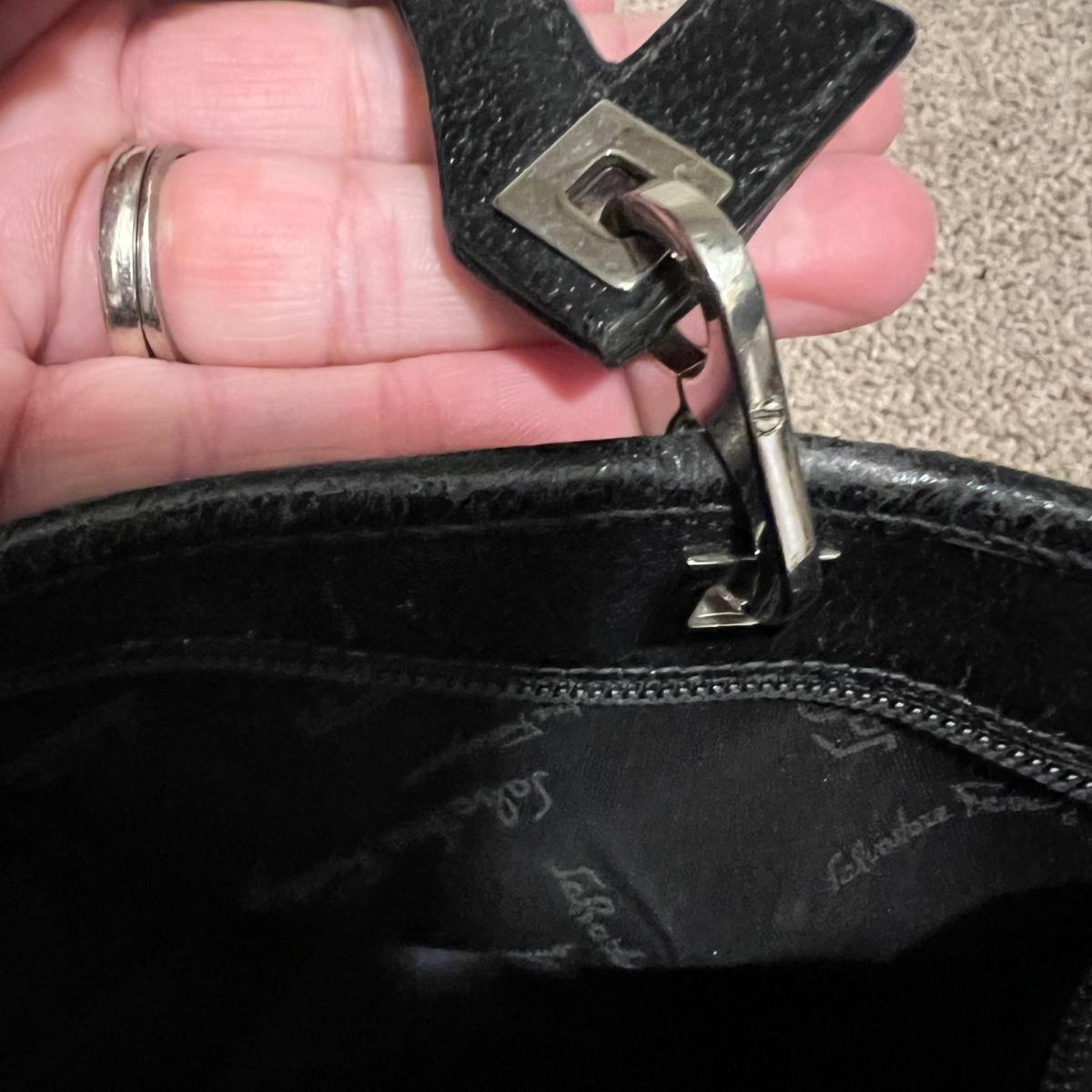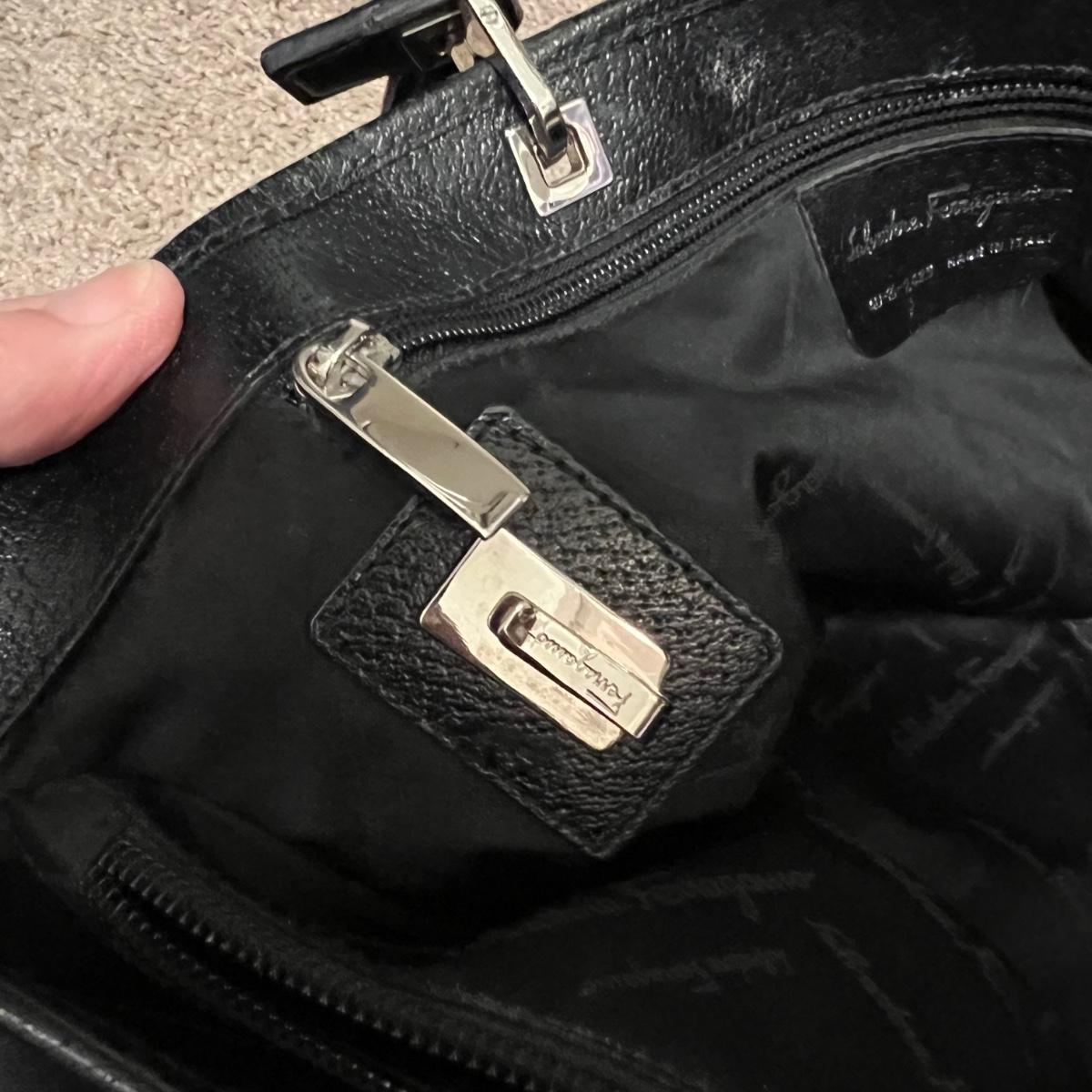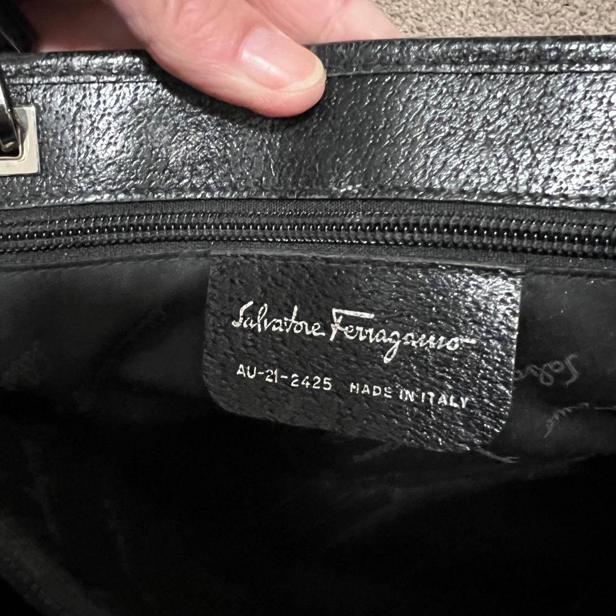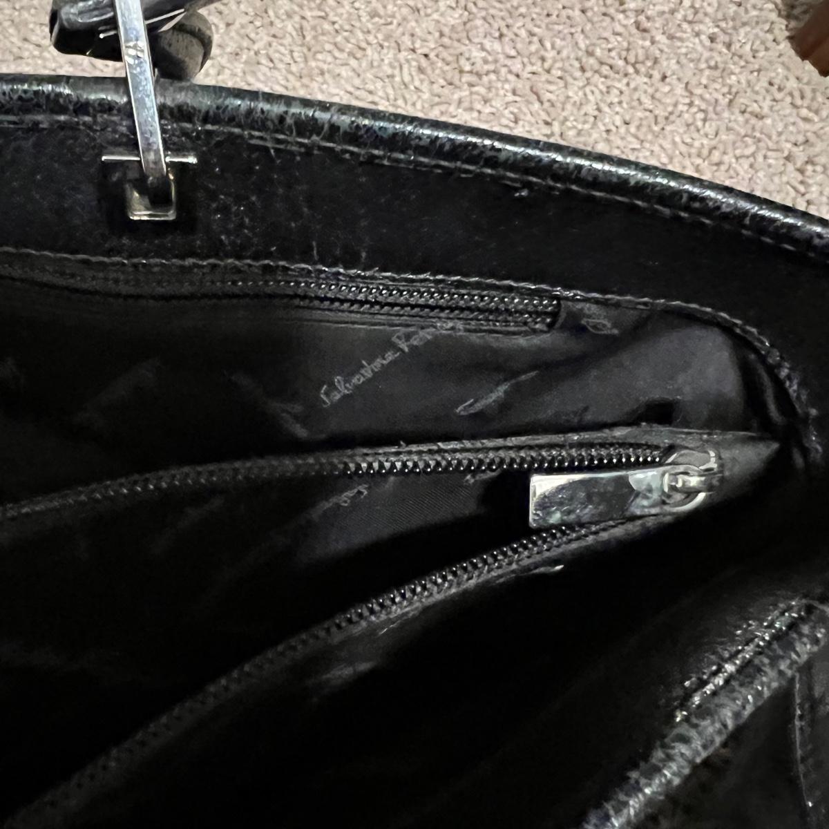 This Tutilo black satin bag is a small backpack with a grey interior, perfect size for a laptop and other workday essentials. We have paired it with a nice sized small tote bag made by Salvatore Ferragamo. Also black, this purse has a lined black interior with plenty of compartments to stay organized. Both bags each have a few light marks that could possibly come clean, see images.