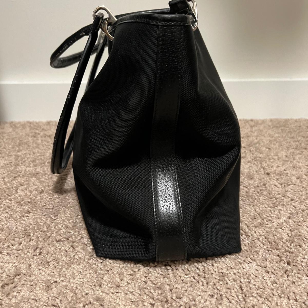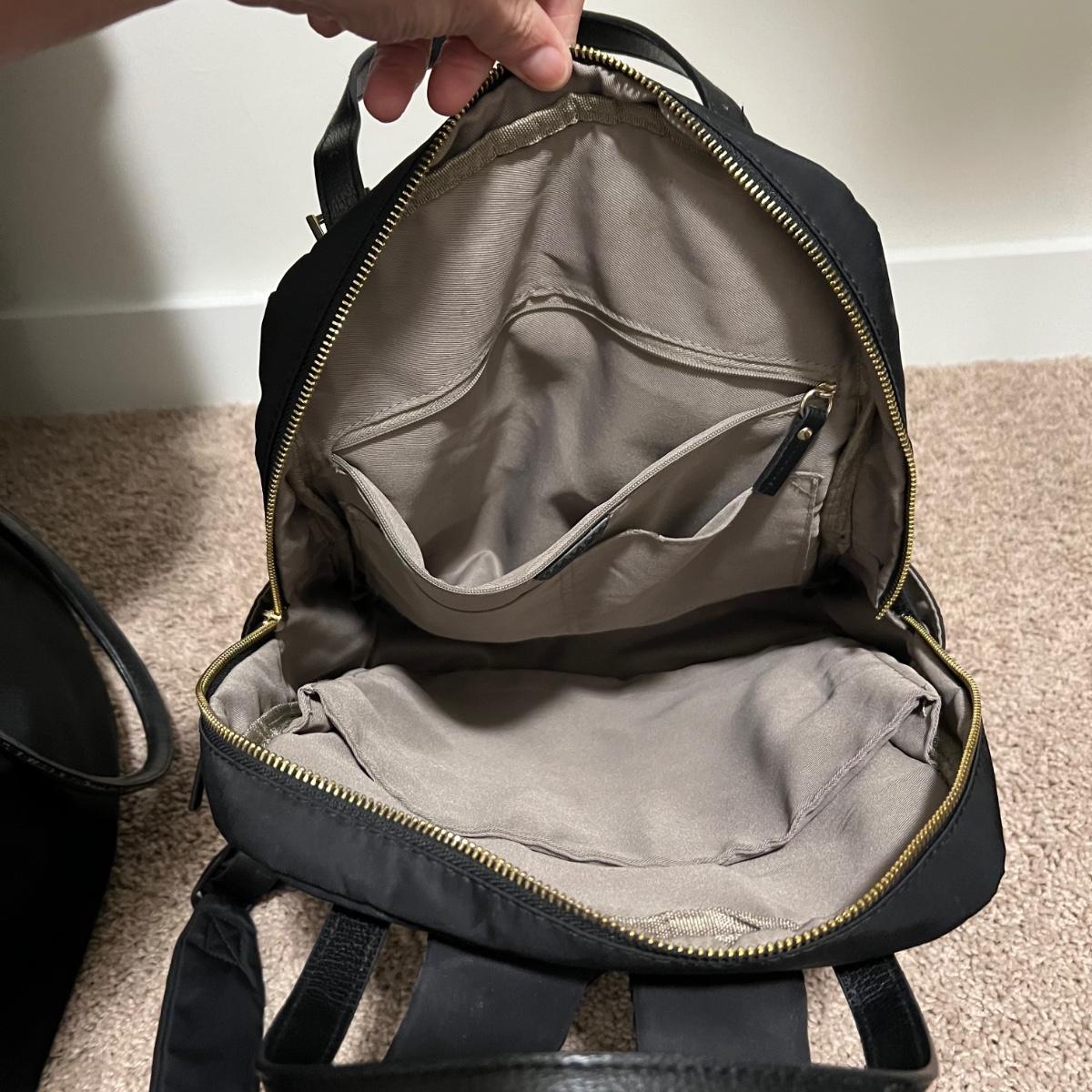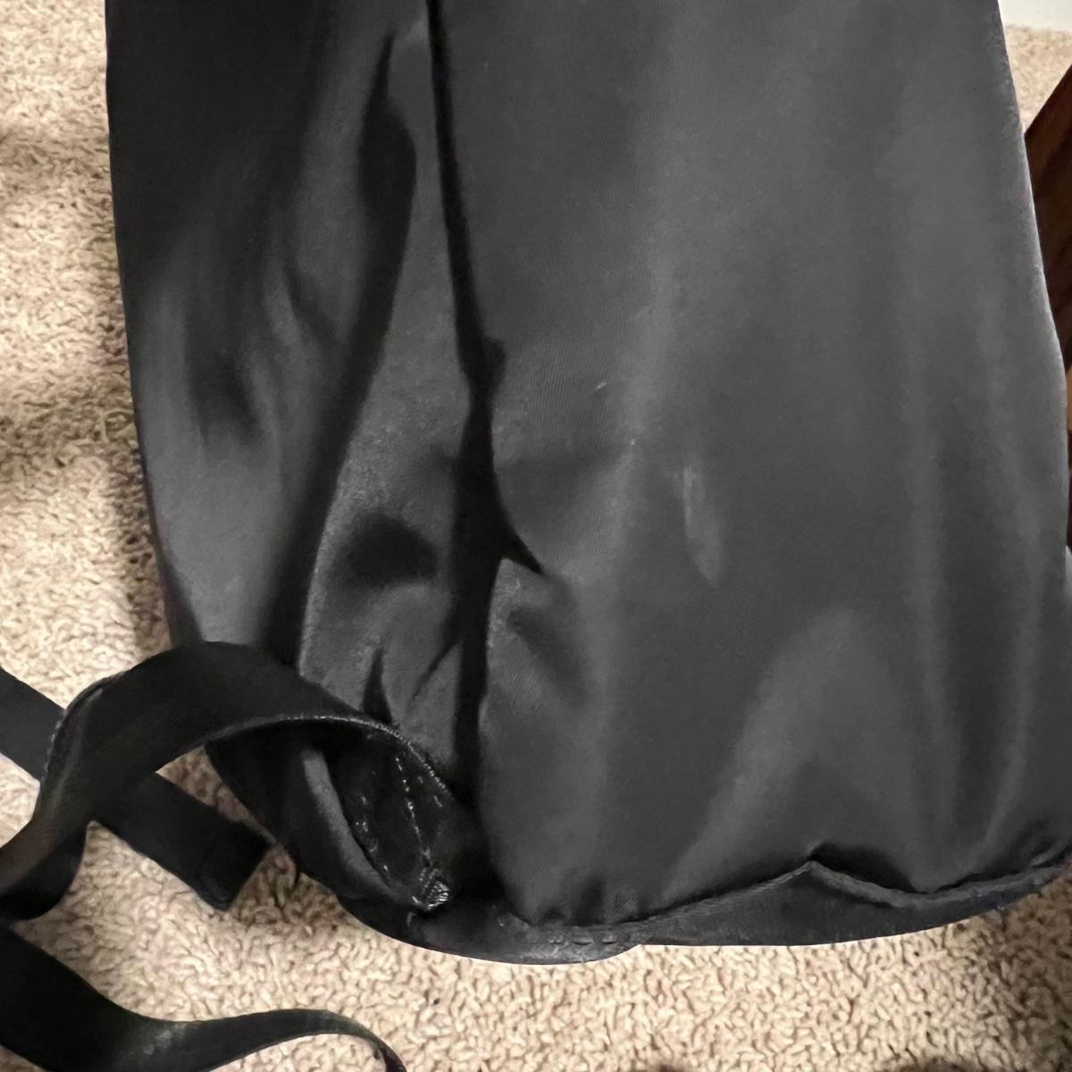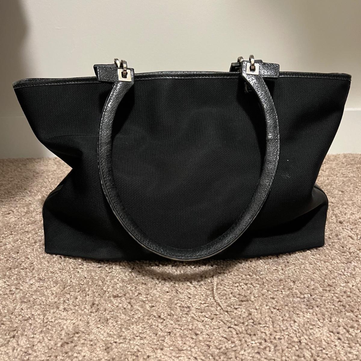 This Tutilo black satin bag is a small backpack with a grey interior, perfect size for a laptop and other workday essentials. We have paired it with a nice sized small tote bag made by Salvatore Ferragamo. Also black, this purse has a lined black interior with plenty of compartments to stay organized. Both bags each have a few light marks that could possibly come clean, see images.