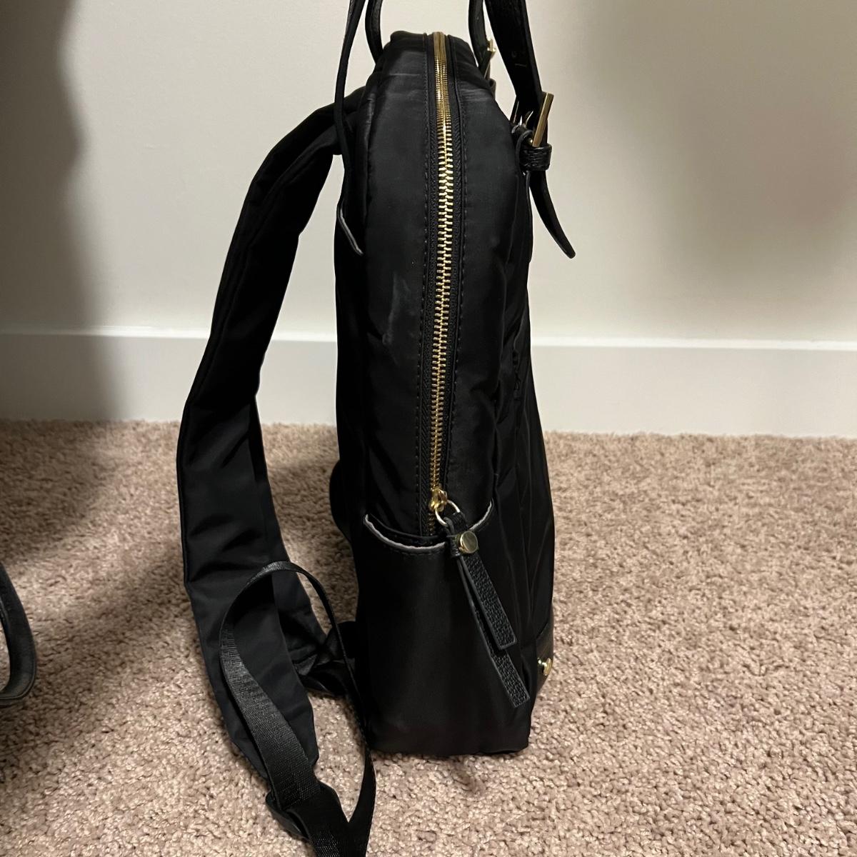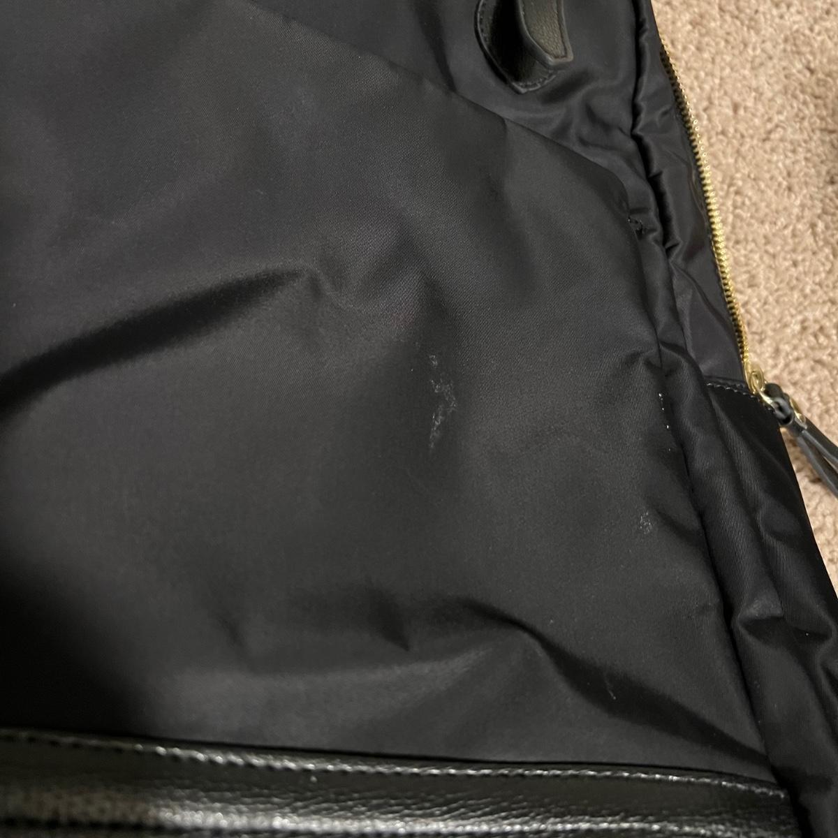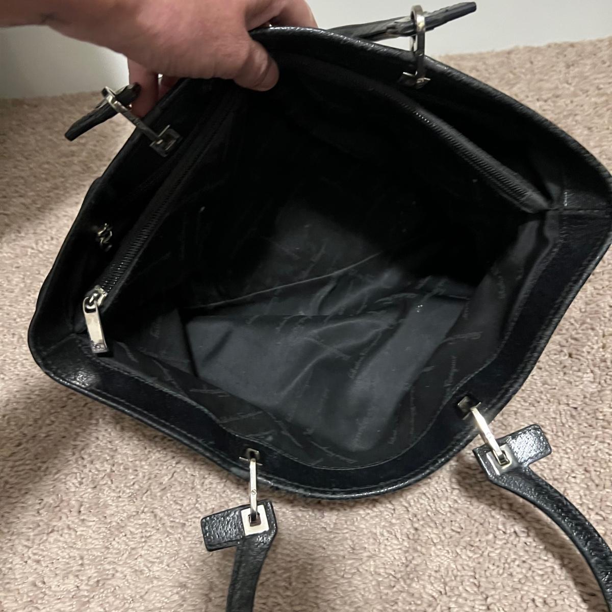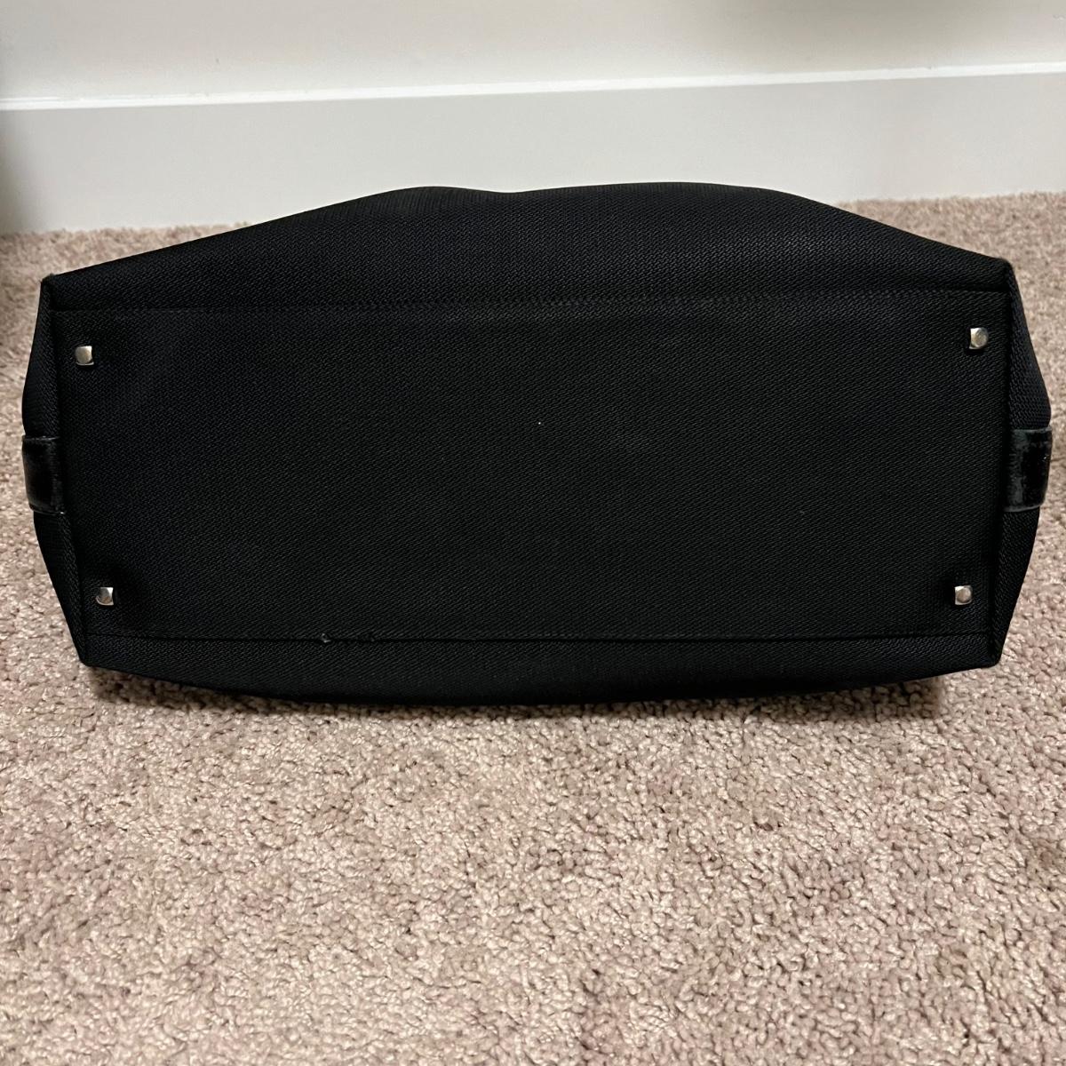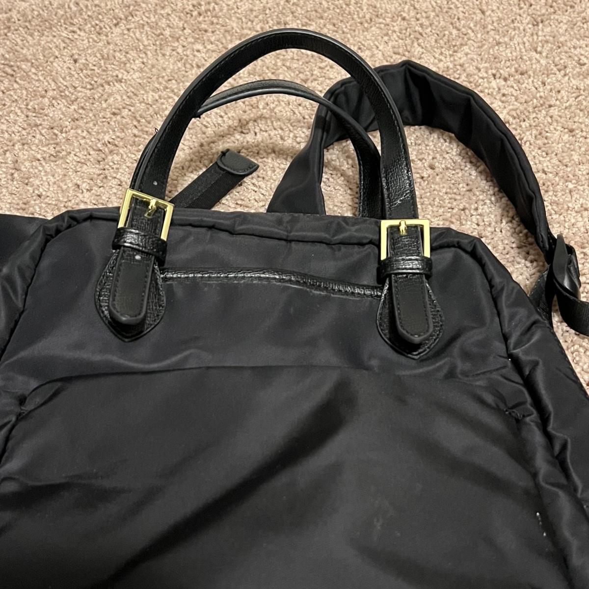 This Tutilo black satin bag is a small backpack with a grey interior, perfect size for a laptop and other workday essentials. We have paired it with a nice sized small tote bag made by Salvatore Ferragamo. Also black, this purse has a lined black interior with plenty of compartments to stay organized. Both bags each have a few light marks that could possibly come clean, see images.