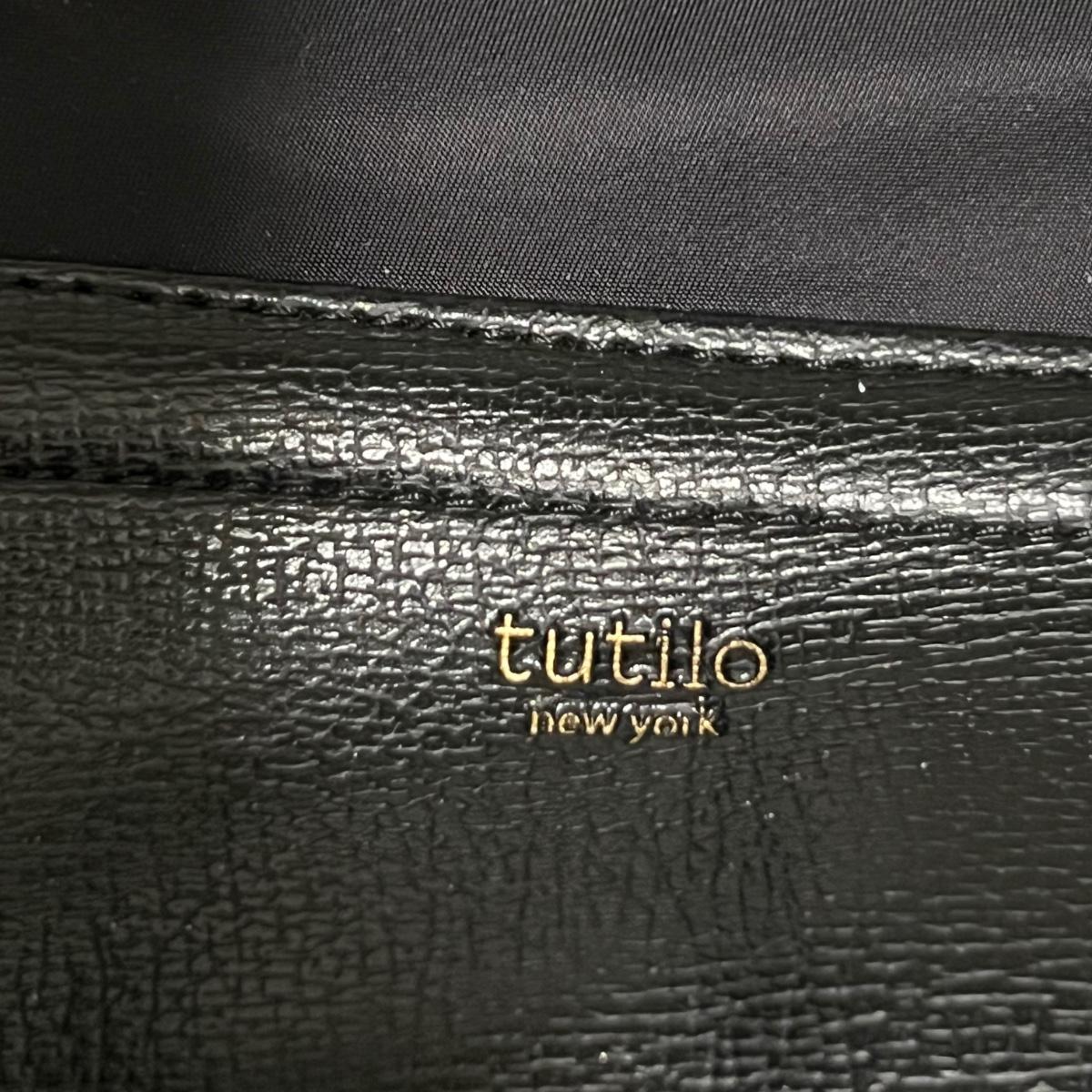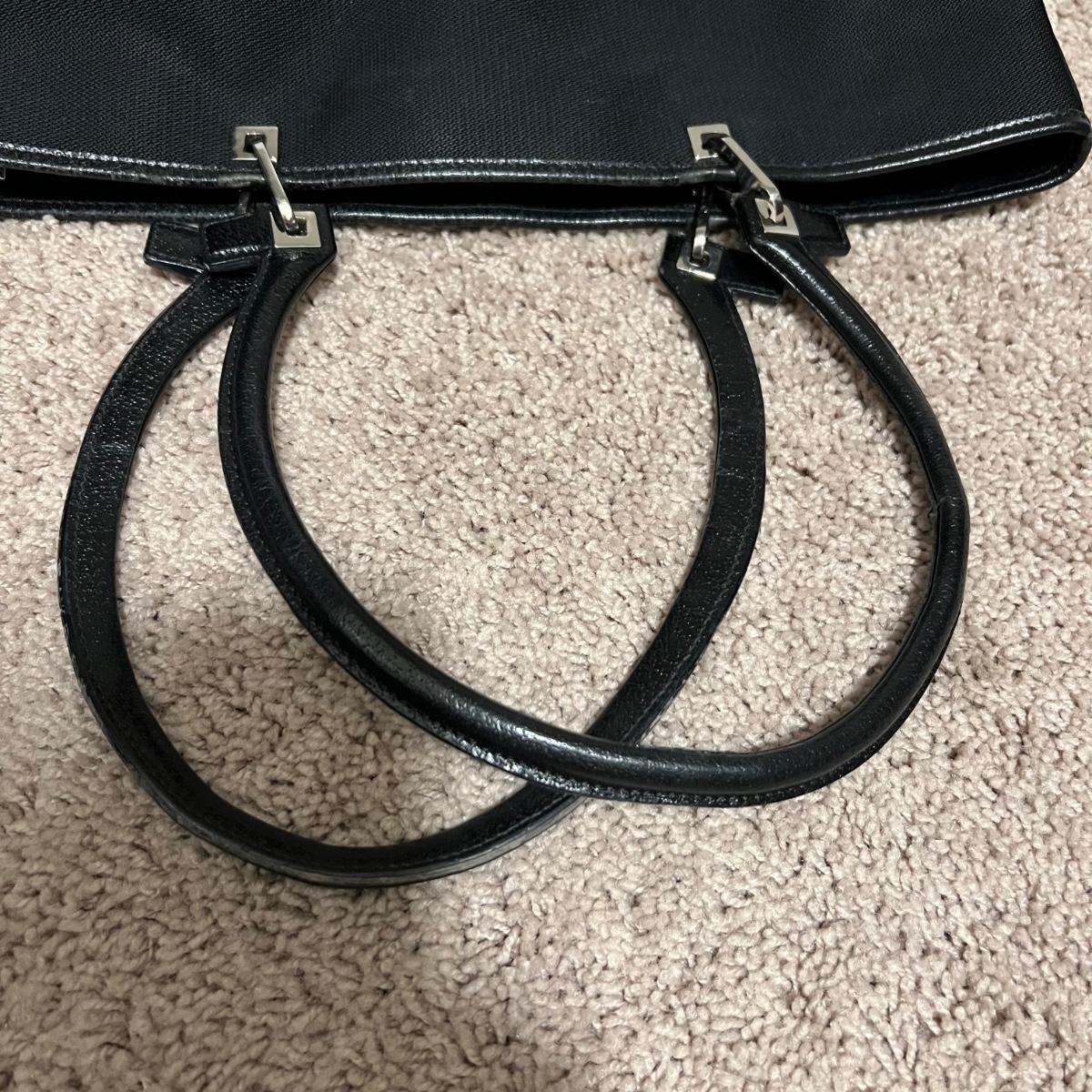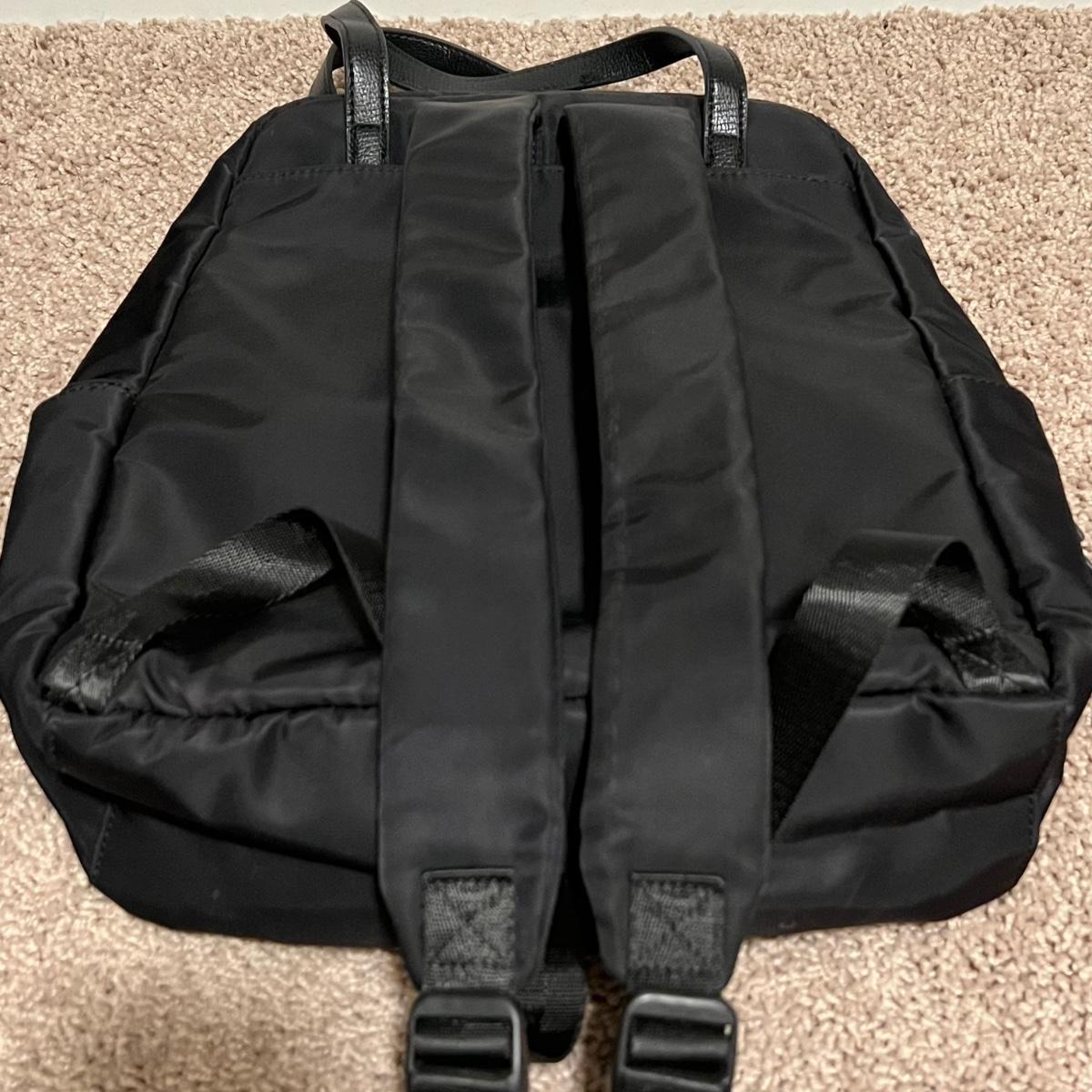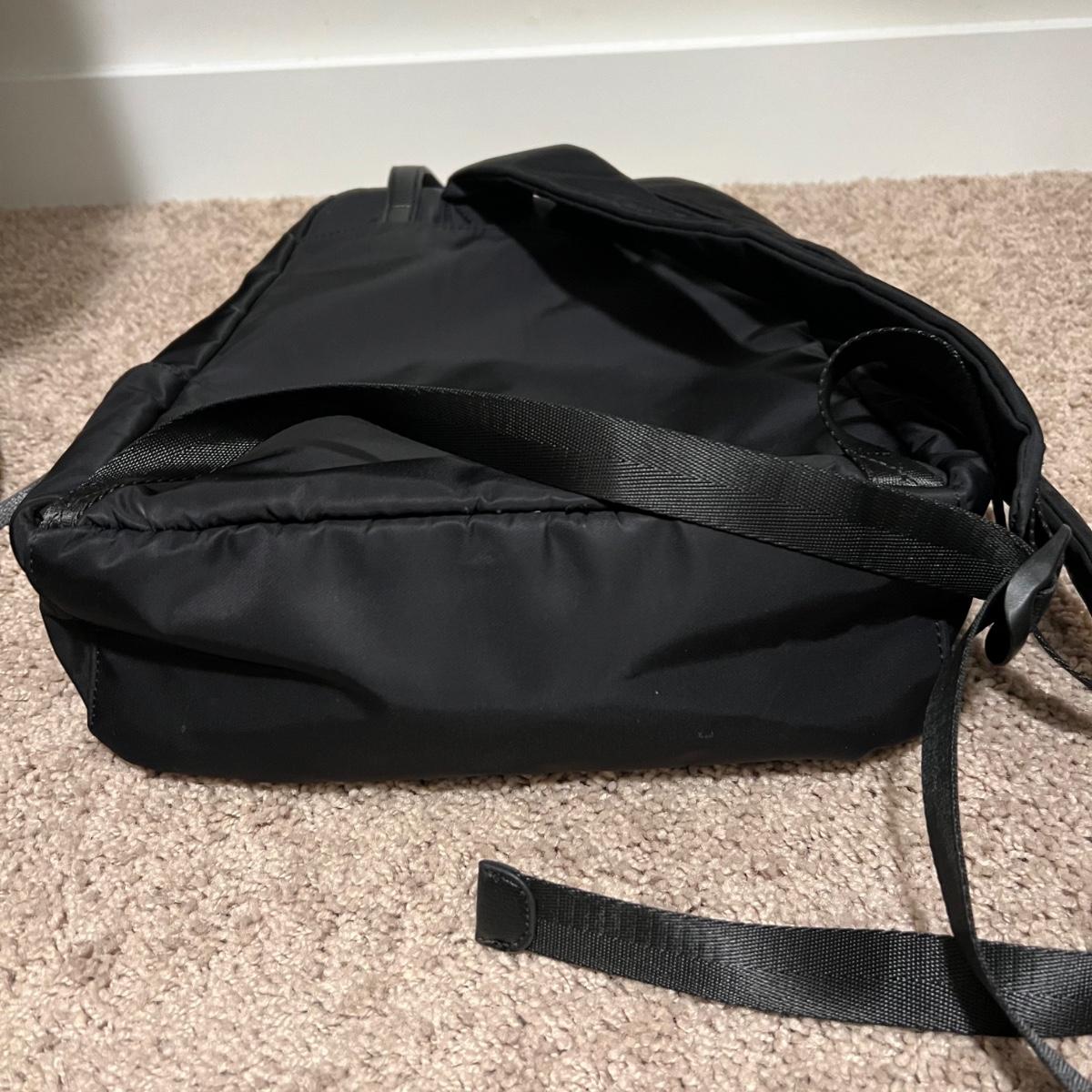 This Tutilo black satin bag is a small backpack with a grey interior, perfect size for a laptop and other workday essentials. We have paired it with a nice sized small tote bag made by Salvatore Ferragamo. Also black, this purse has a lined black interior with plenty of compartments to stay organized. Both bags each have a few light marks that could possibly come clean, see images.