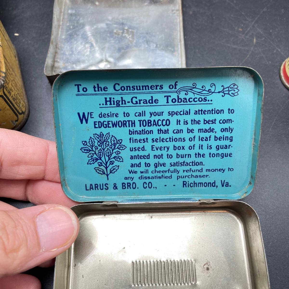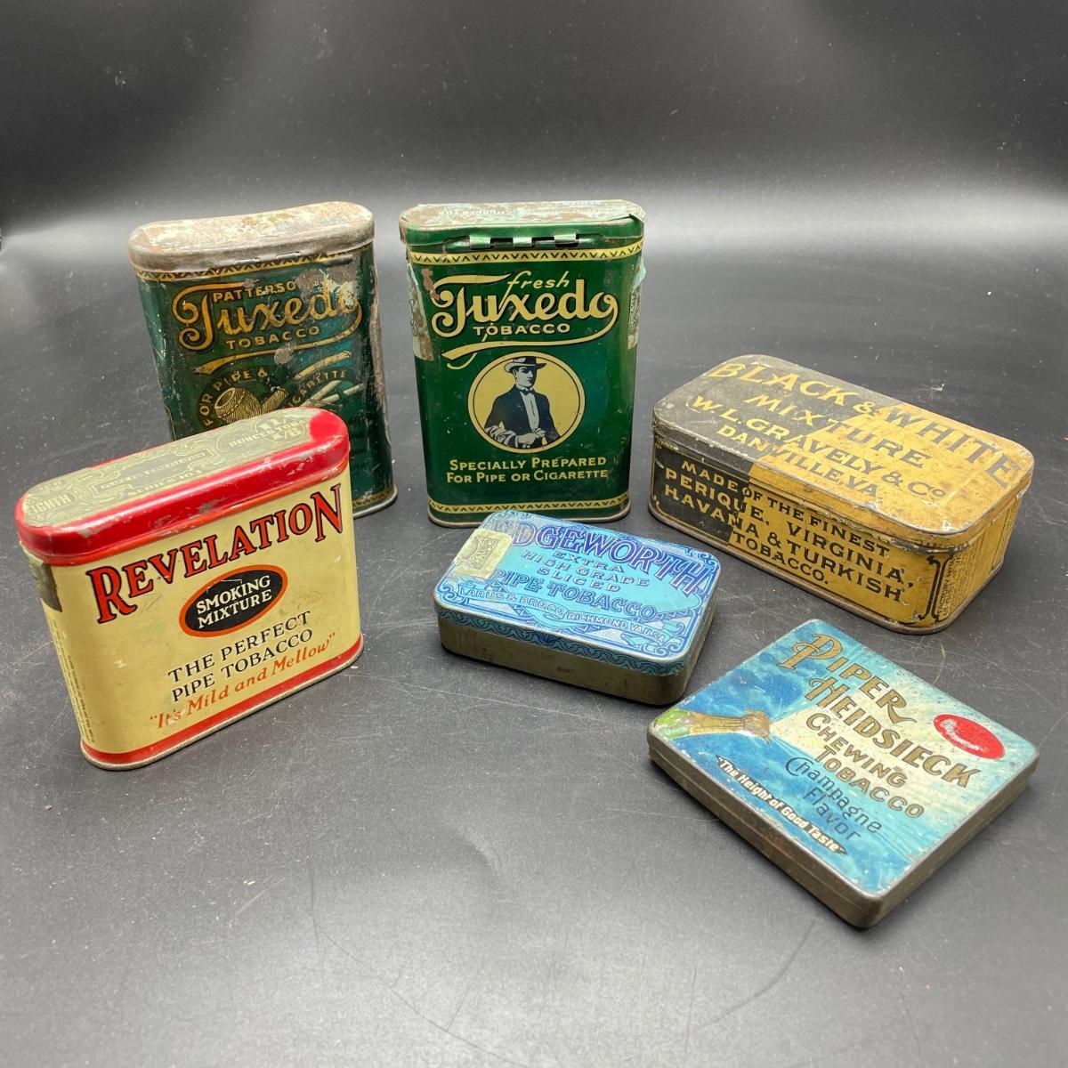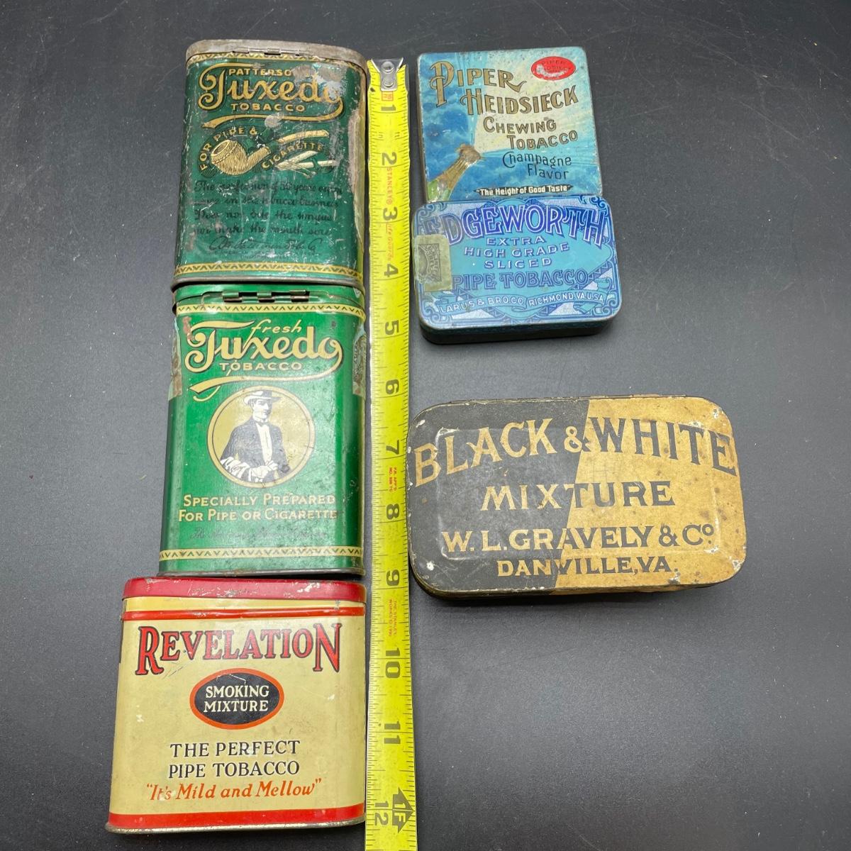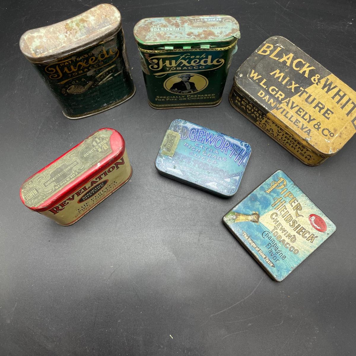 Six vintage tobacco tins with hinged lids. Two vintage Tuxedo and one Revelation tobacco pocket tins. A unique Black & White Mixture by W.L. Gravely & Co, an Edgeworth Pipe Tobacco and Piper Heidsieck Champagne Flavor tobacco tin. See images. Shipping available