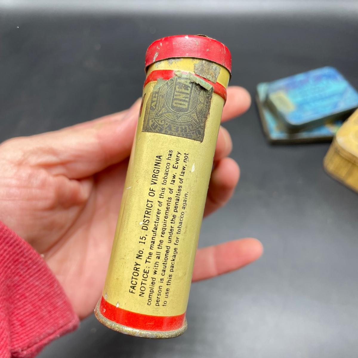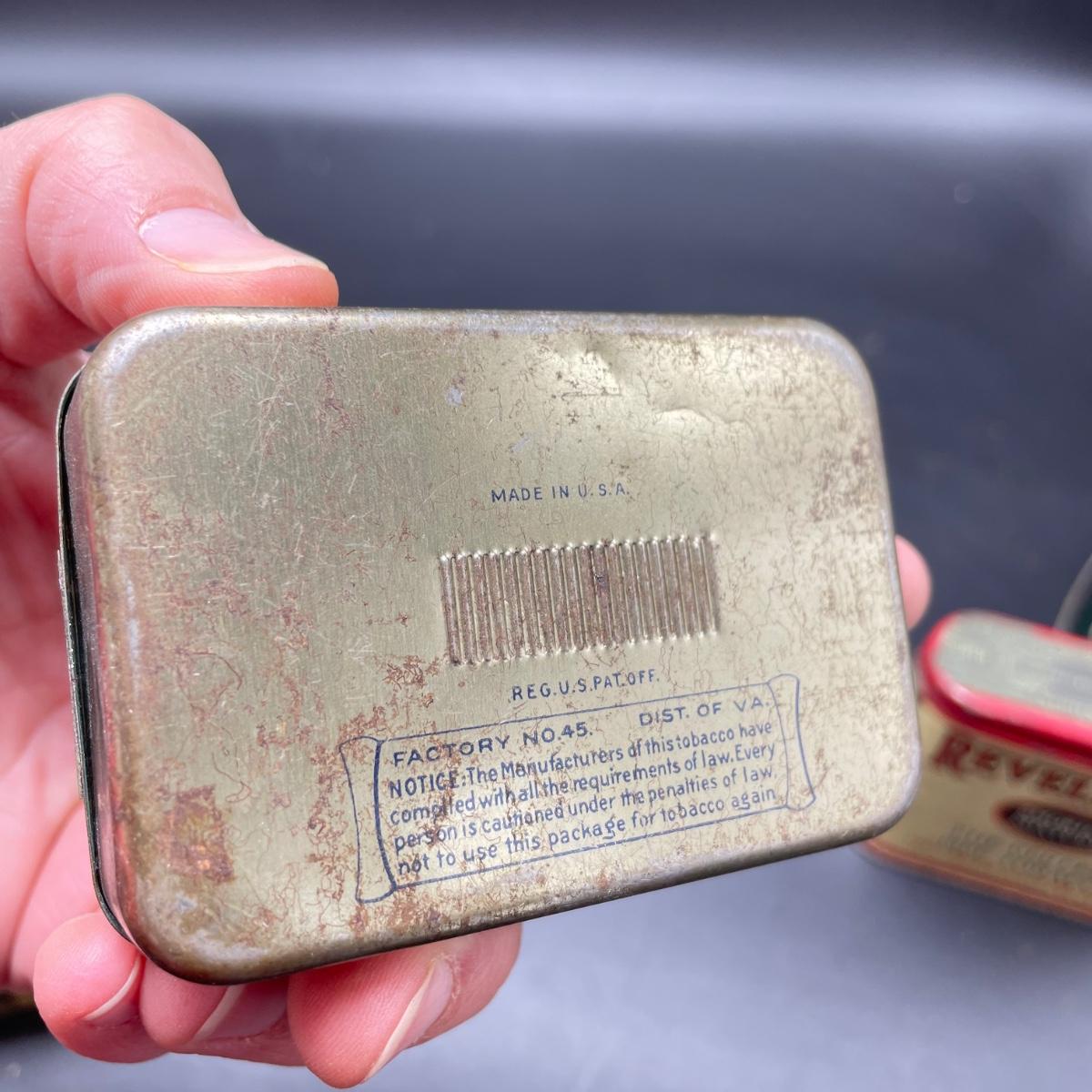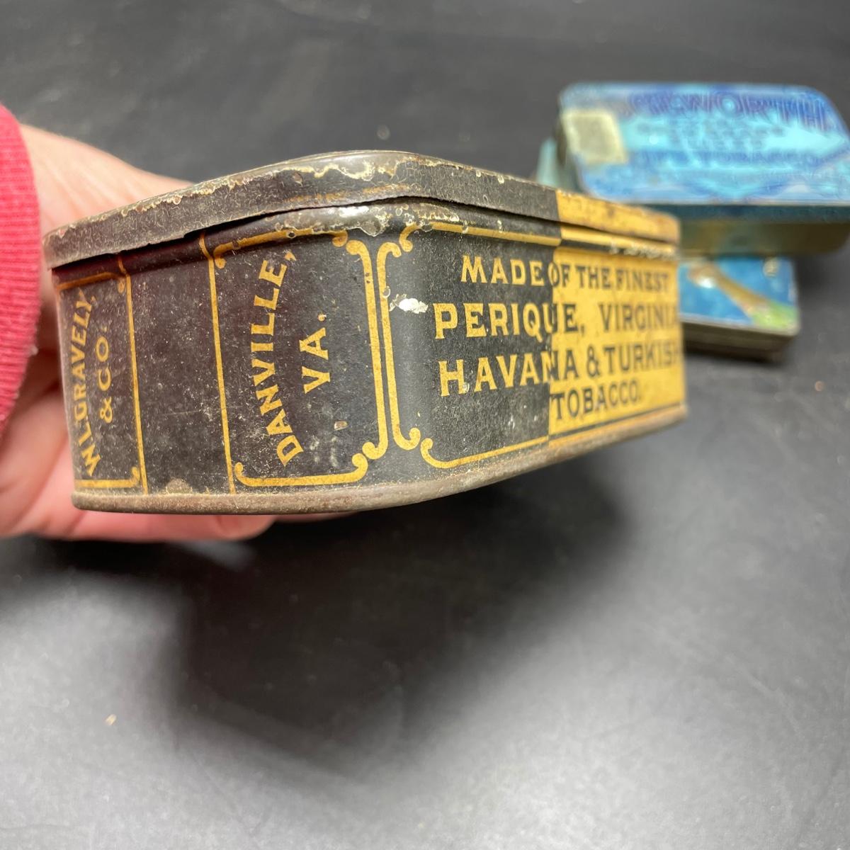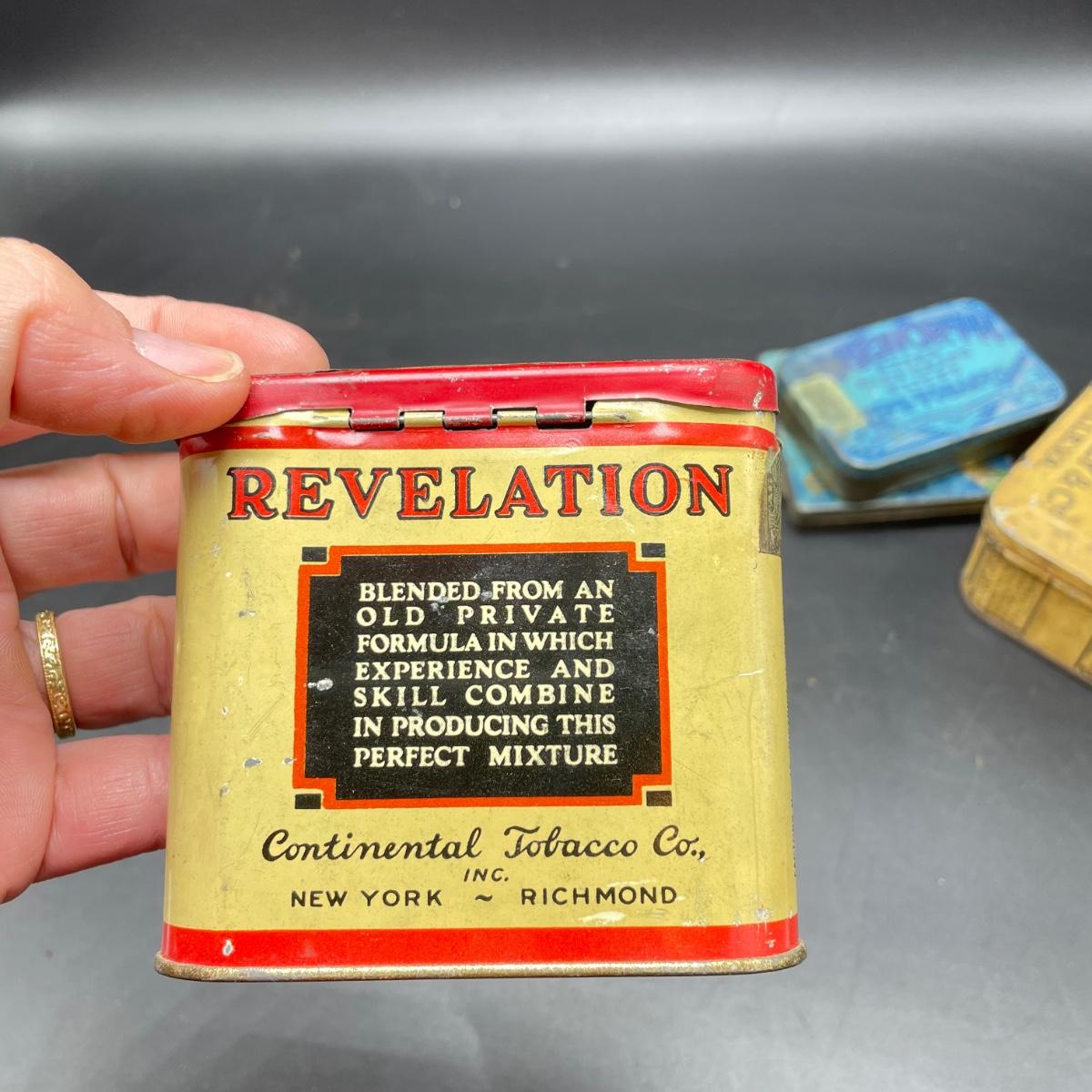Six vintage tobacco tins with hinged lids. Two vintage Tuxedo and one Revelation tobacco pocket tins. A unique Black & White Mixture by W.L. Gravely & Co, an Edgeworth Pipe Tobacco and Piper Heidsieck Champagne Flavor tobacco tin. See images. Shipping available