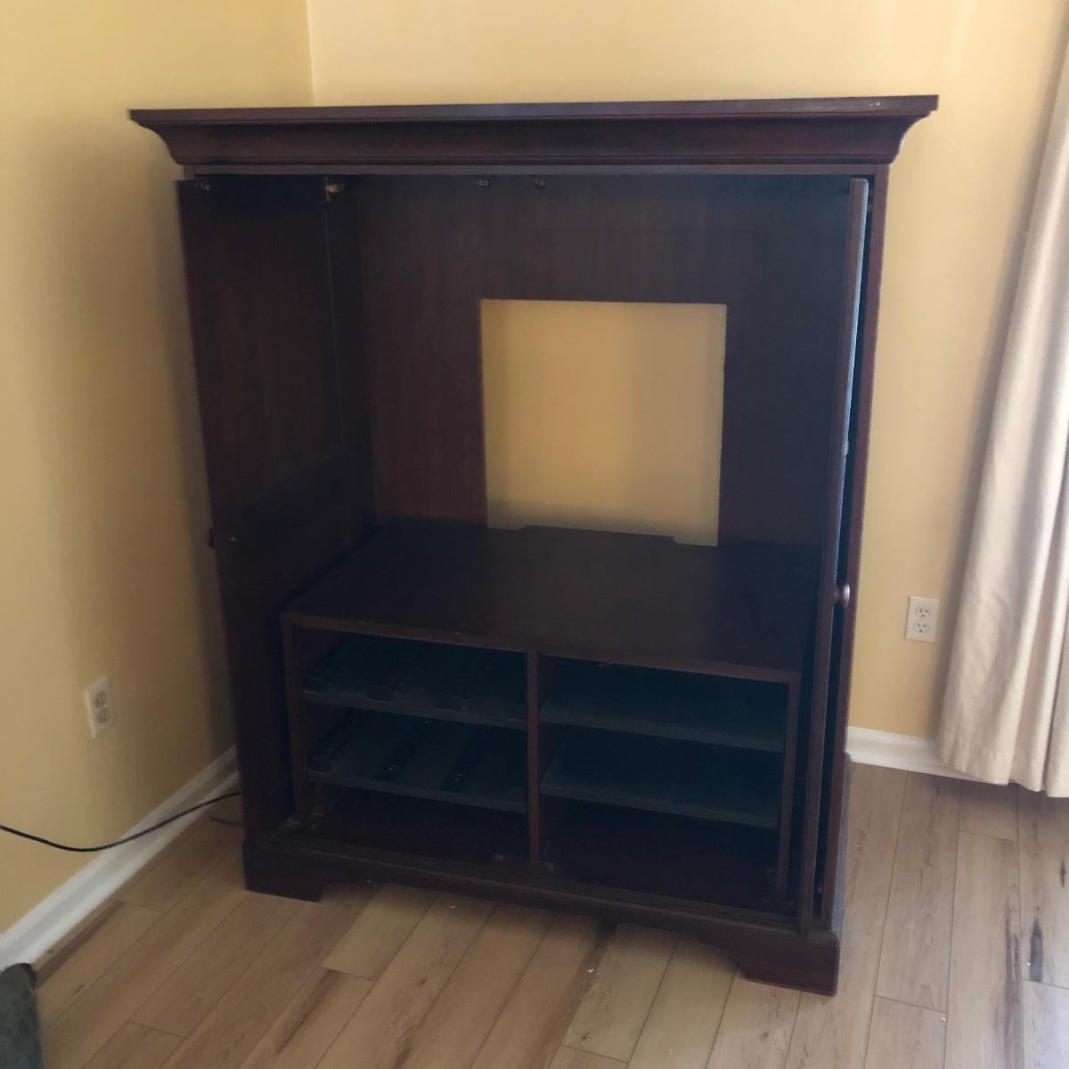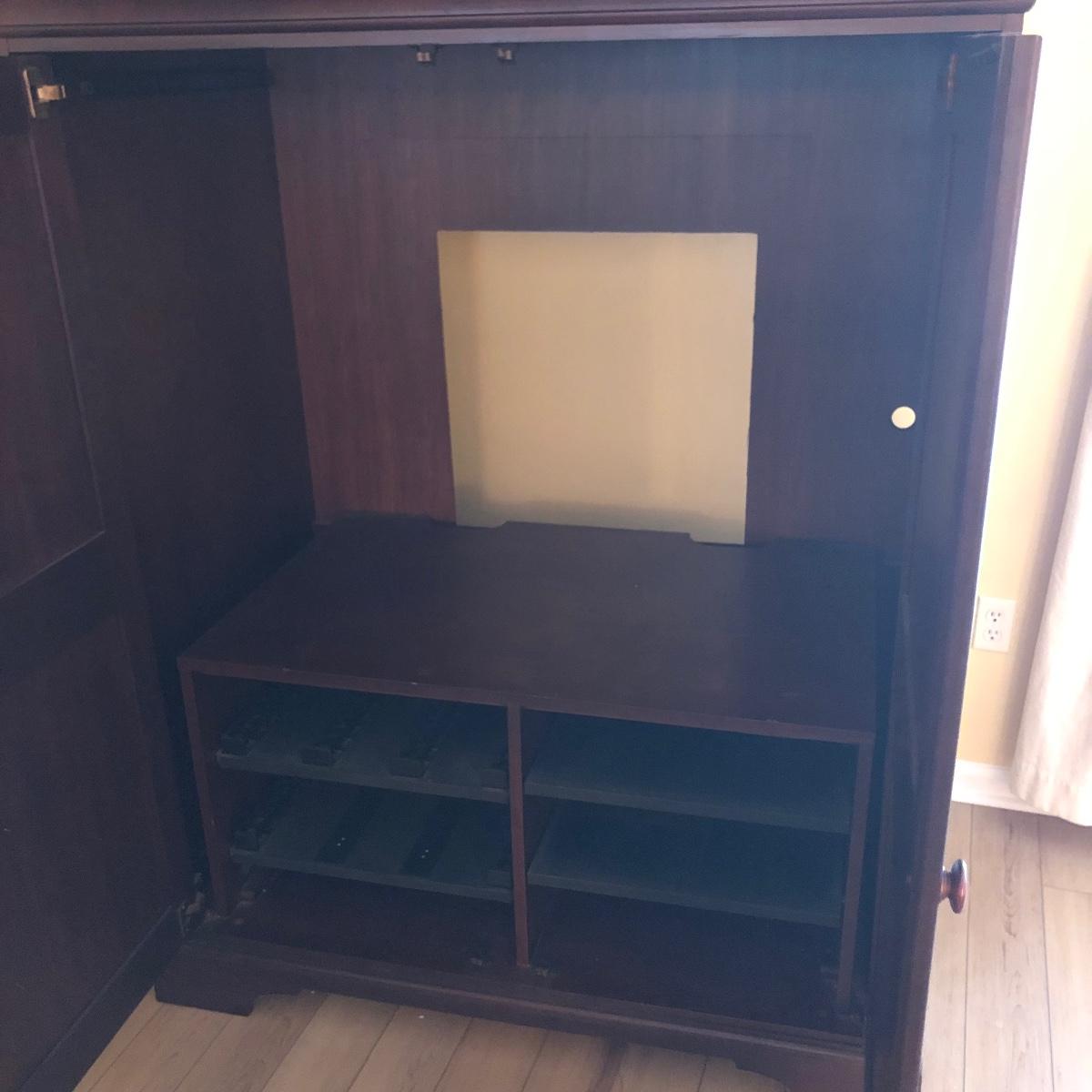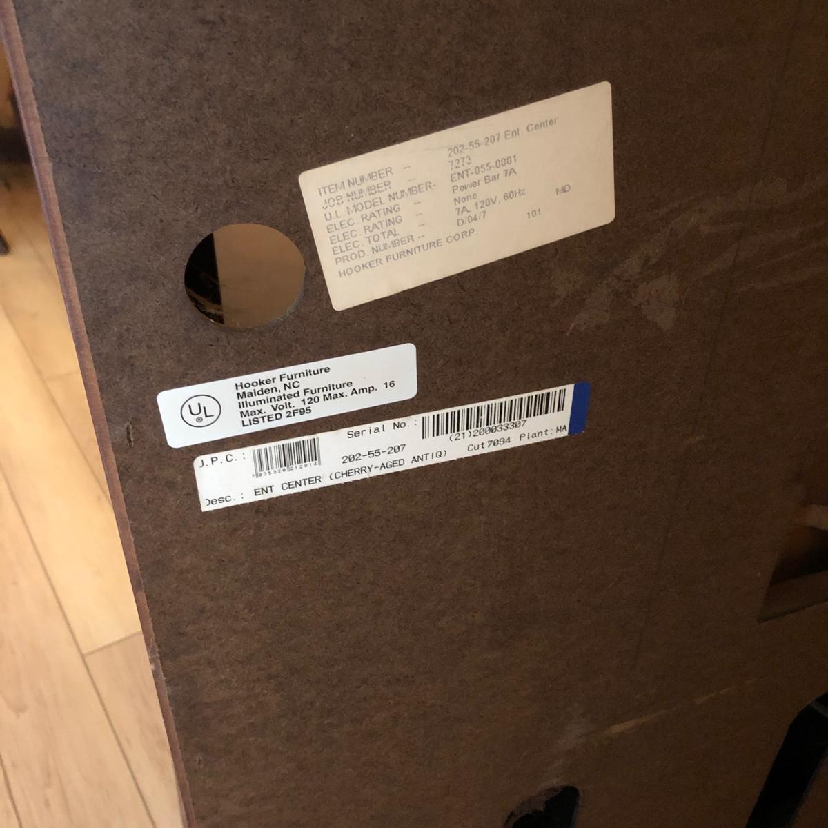 Lot includes a Hooker Furniture TV armoire with two slide out shelves and three shelves for your TV components. Armoire is in a cherry color and is veneer over pressed wood. Armoire measures 29” x 51.5” x 62.5”. Bring help item is substantial.