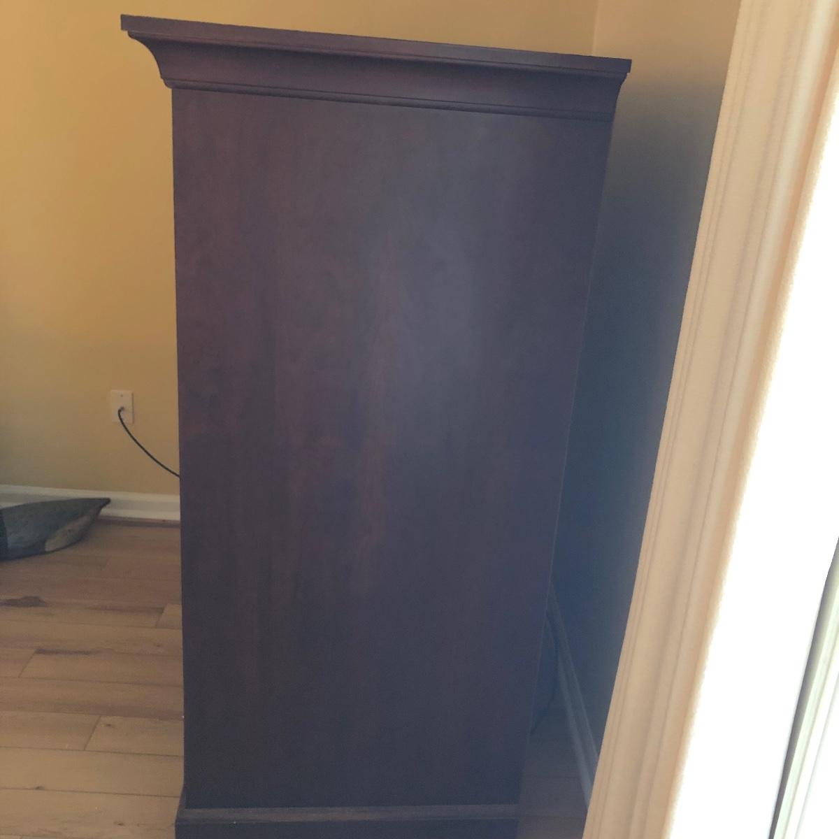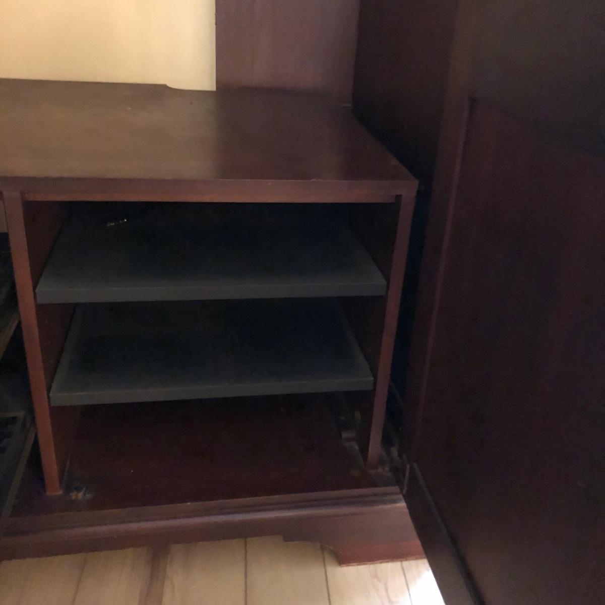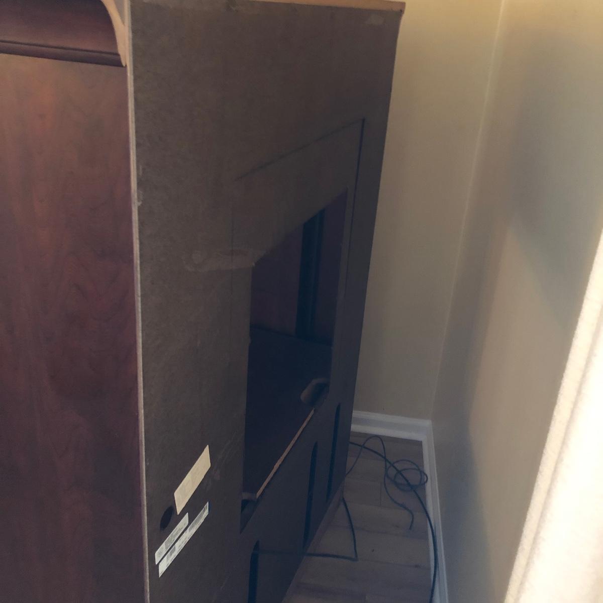Lot includes a Hooker Furniture TV armoire with two slide out shelves and three shelves for your TV components. Armoire is in a cherry color and is veneer over pressed wood. Armoire measures 29” x 51.5” x 62.5”. Bring help item is substantial.