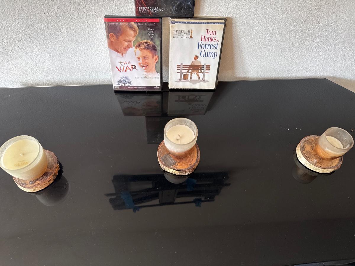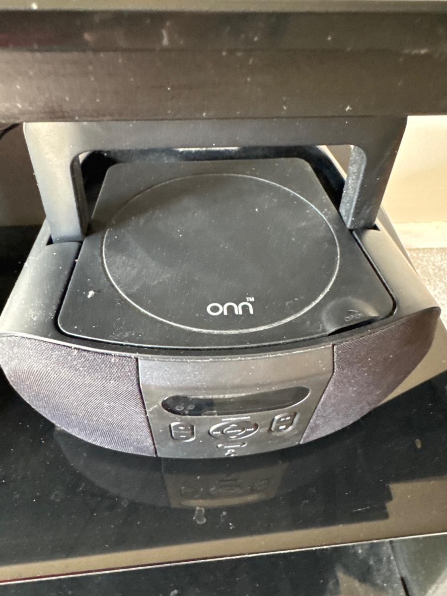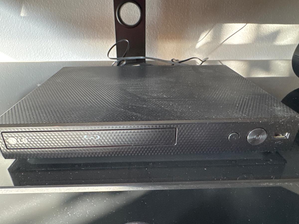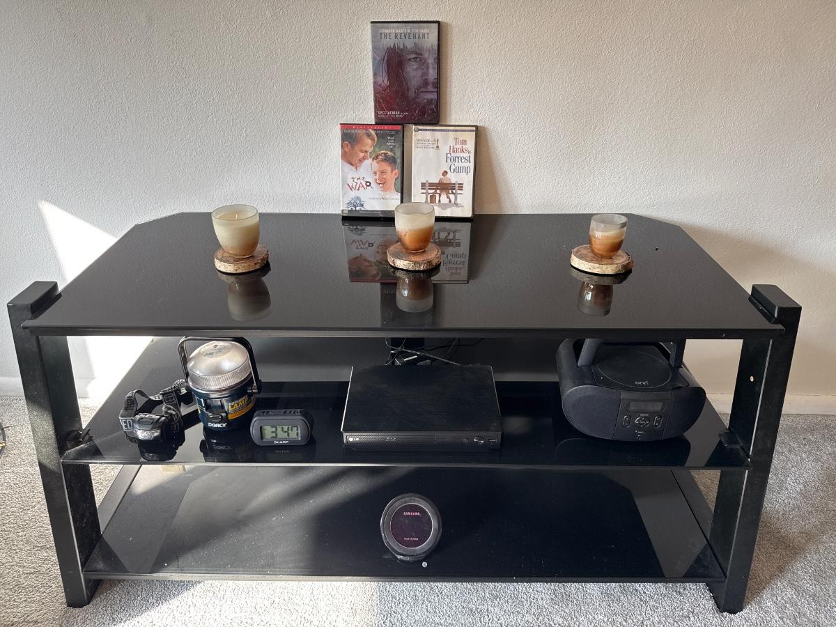 TV stand with LG blueray player, onn cd player, sharp clock, Samsung fast charger, lantern and light with candles and 3 dvds.. did not test the electronics. Dimensions are 48 inches wide by 22 1/2 inches tall by 24 inches deep.