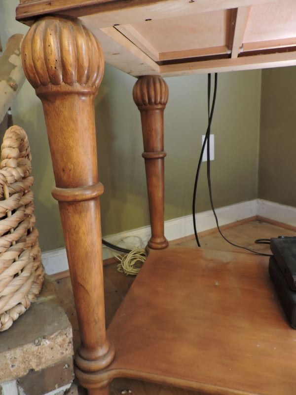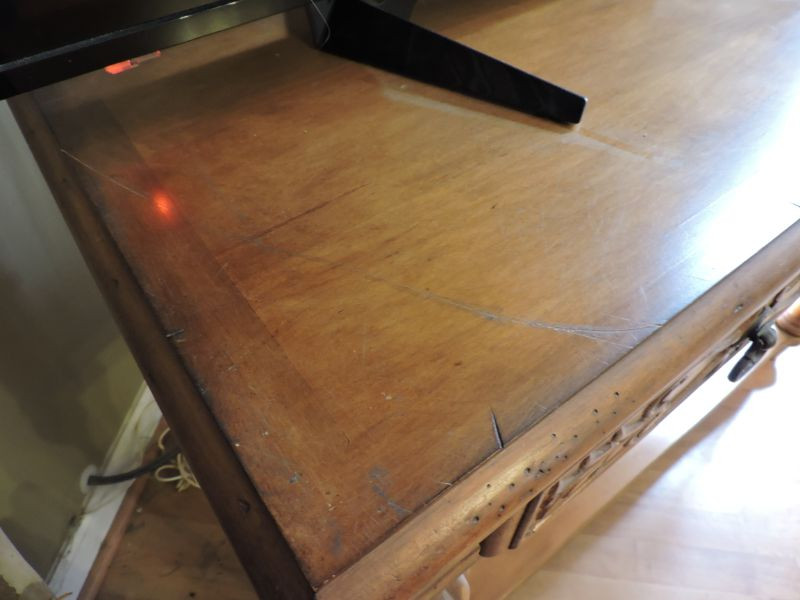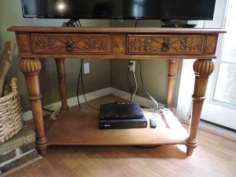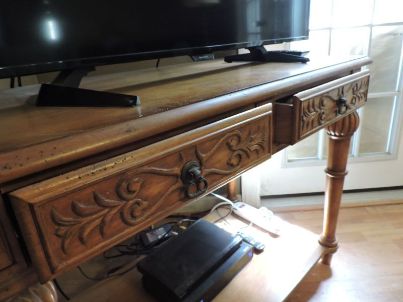 "42”x22.5”x31.5” TV Stand, nice piece with “worm” holes and carved drawers.