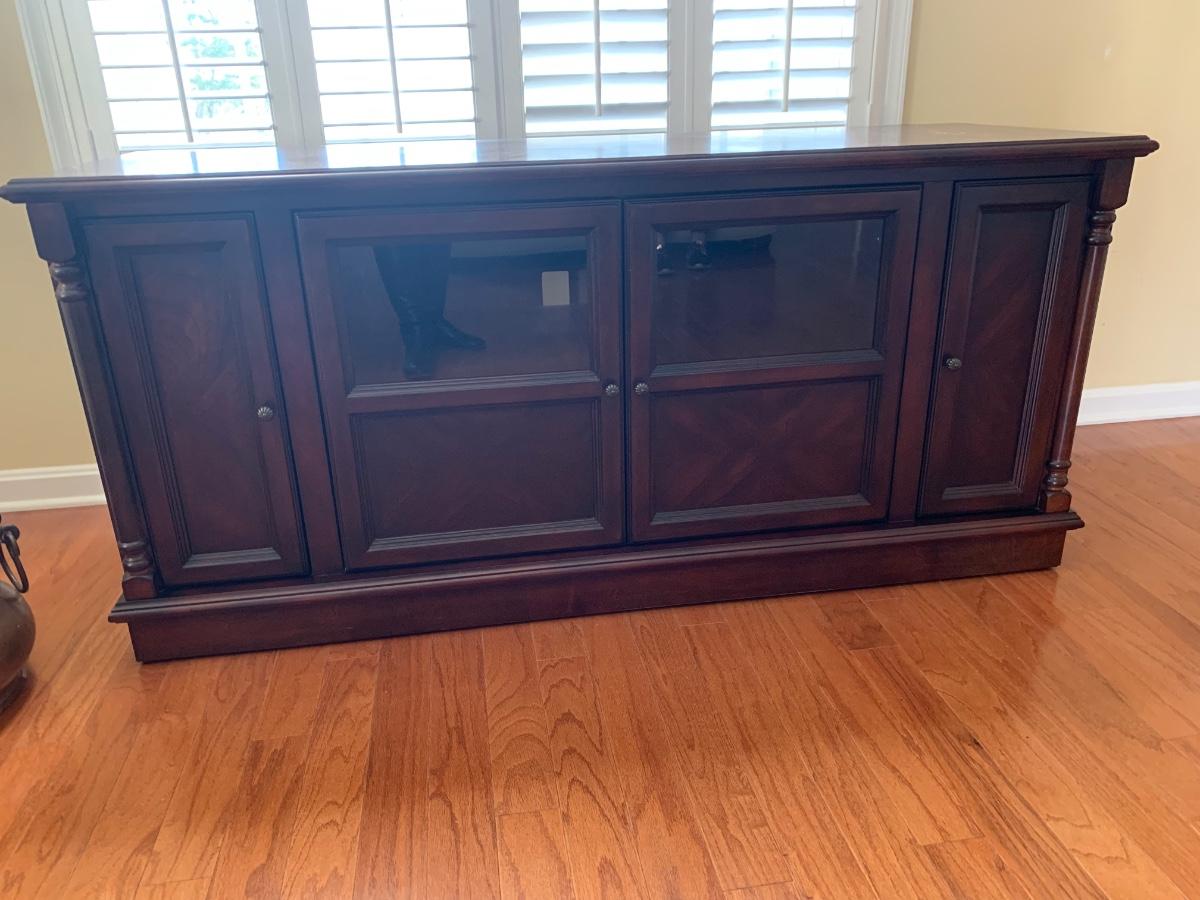 This gorgeous TV stand is approximately 59“ x 20 1/2“ x 19 1/2“. It features 4 doors 2 in the front with glass panel and wood. There are no stains chips or dents. This is in great shape.