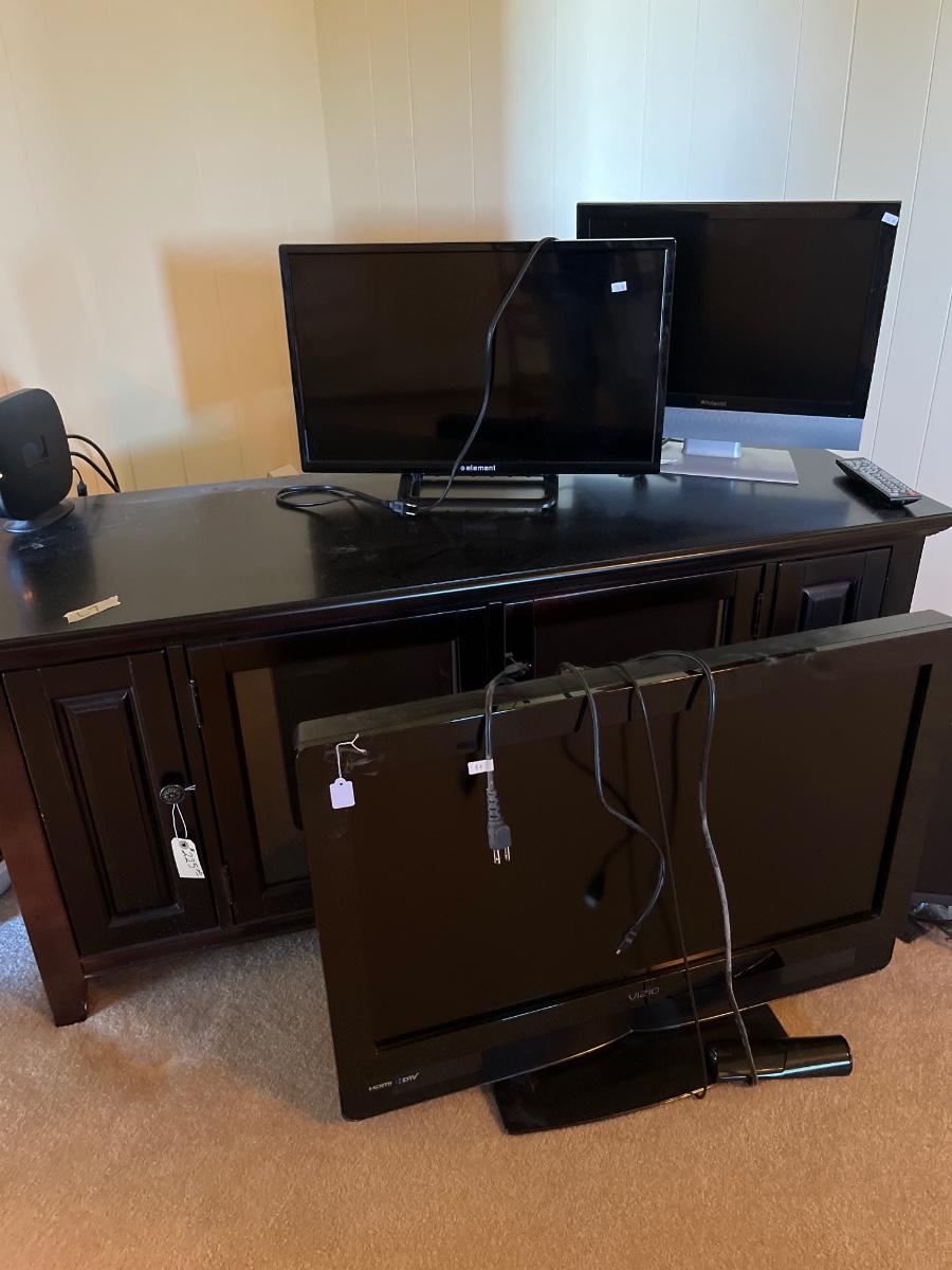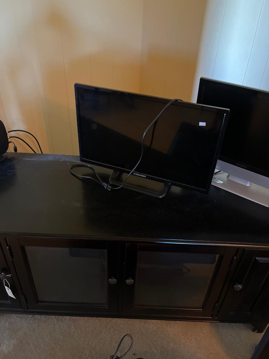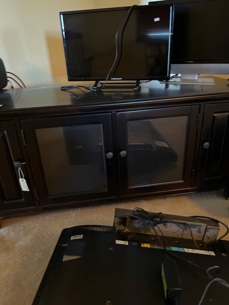 TV/ Stereo Cabinet holds movies has two pull out drawers. Includes TVs and monitors.