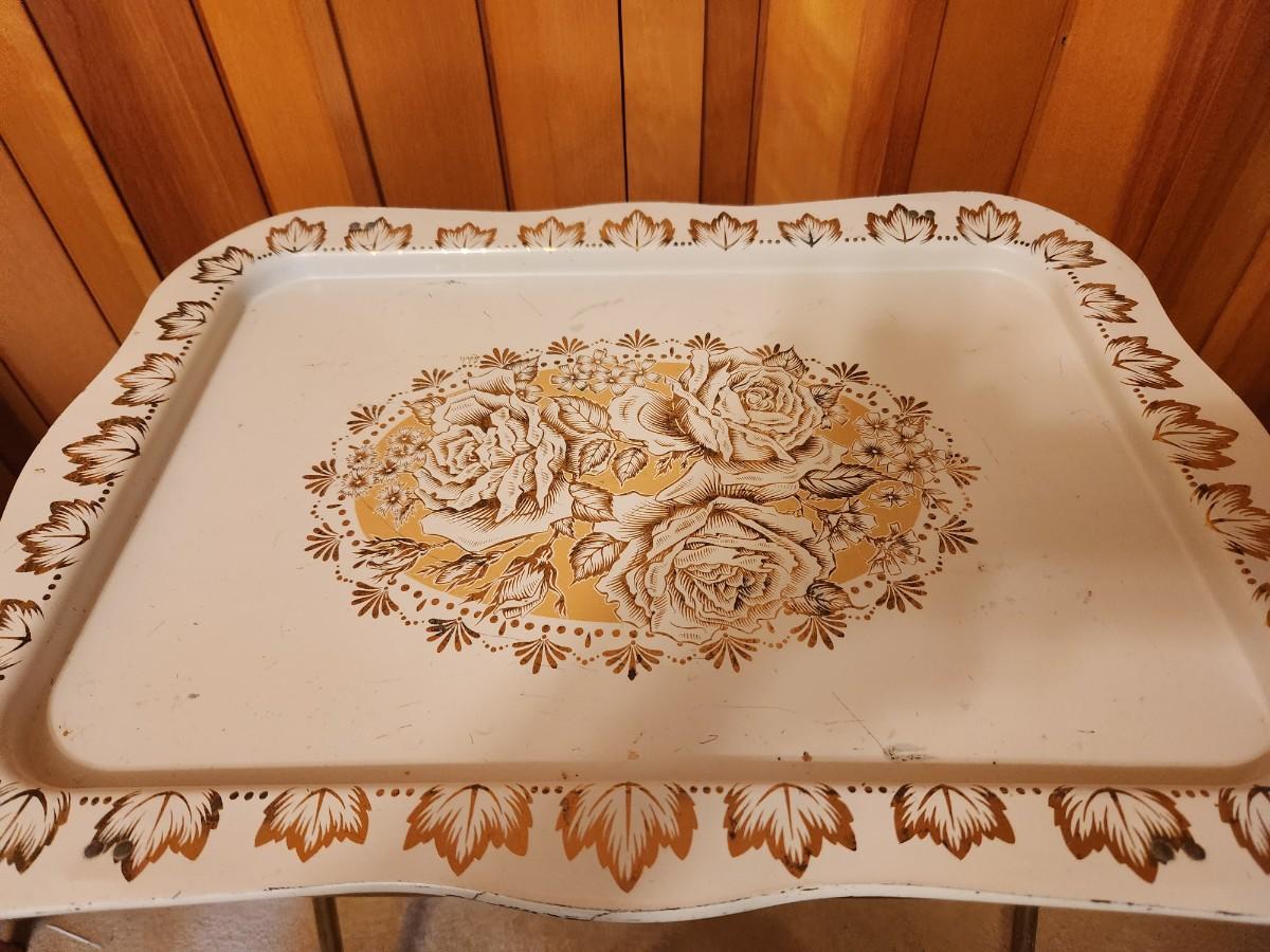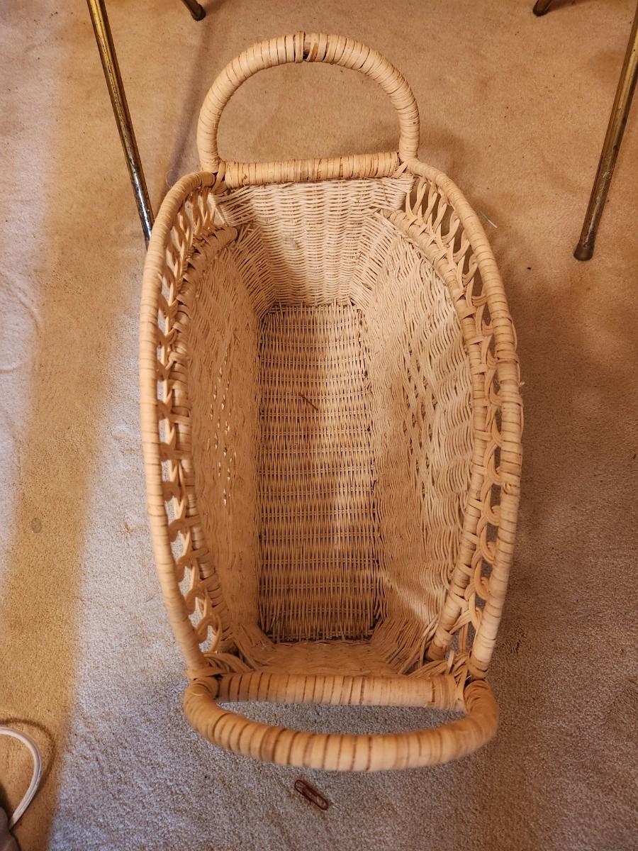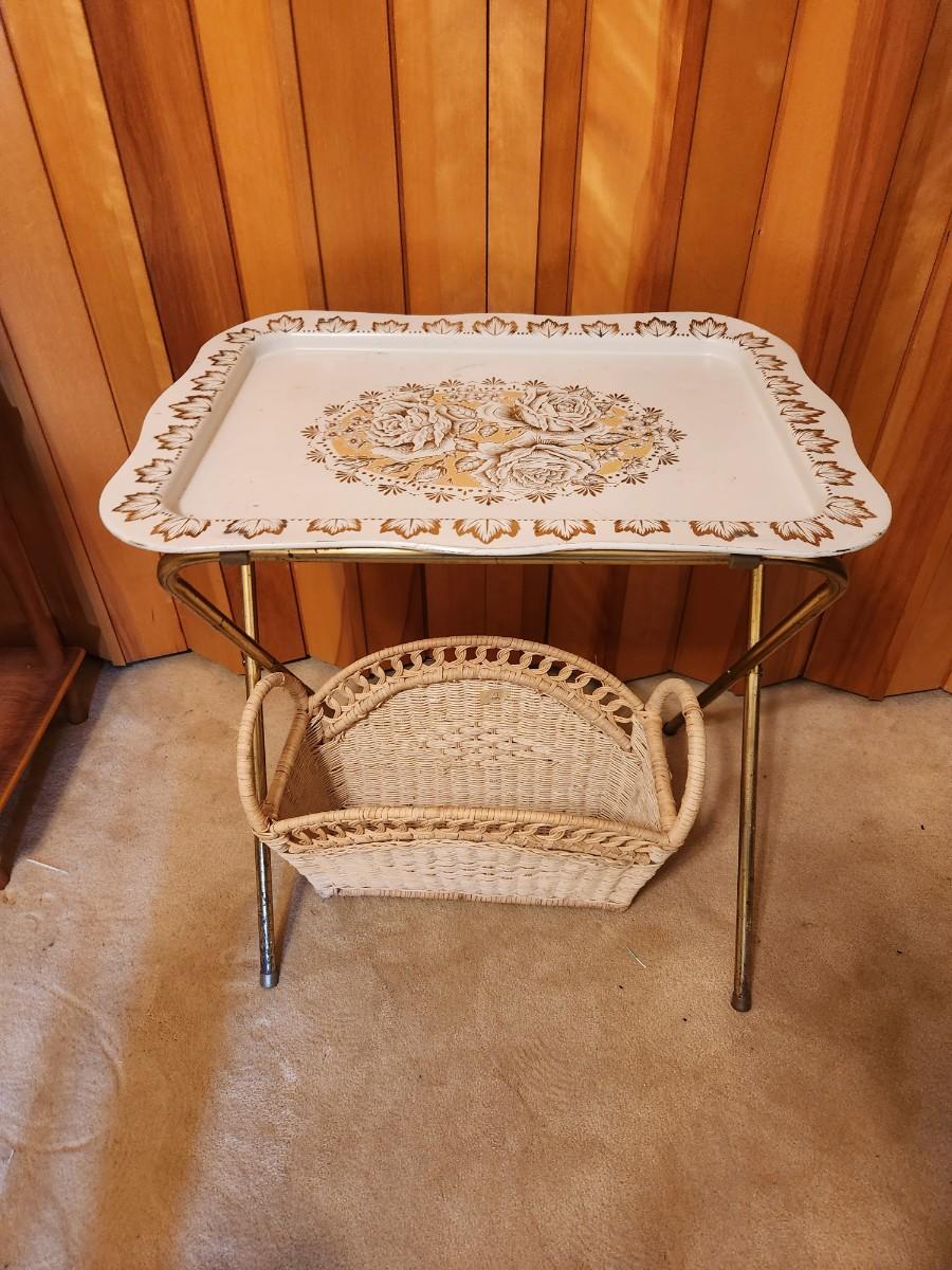 Metal TV tray and wicker basket.