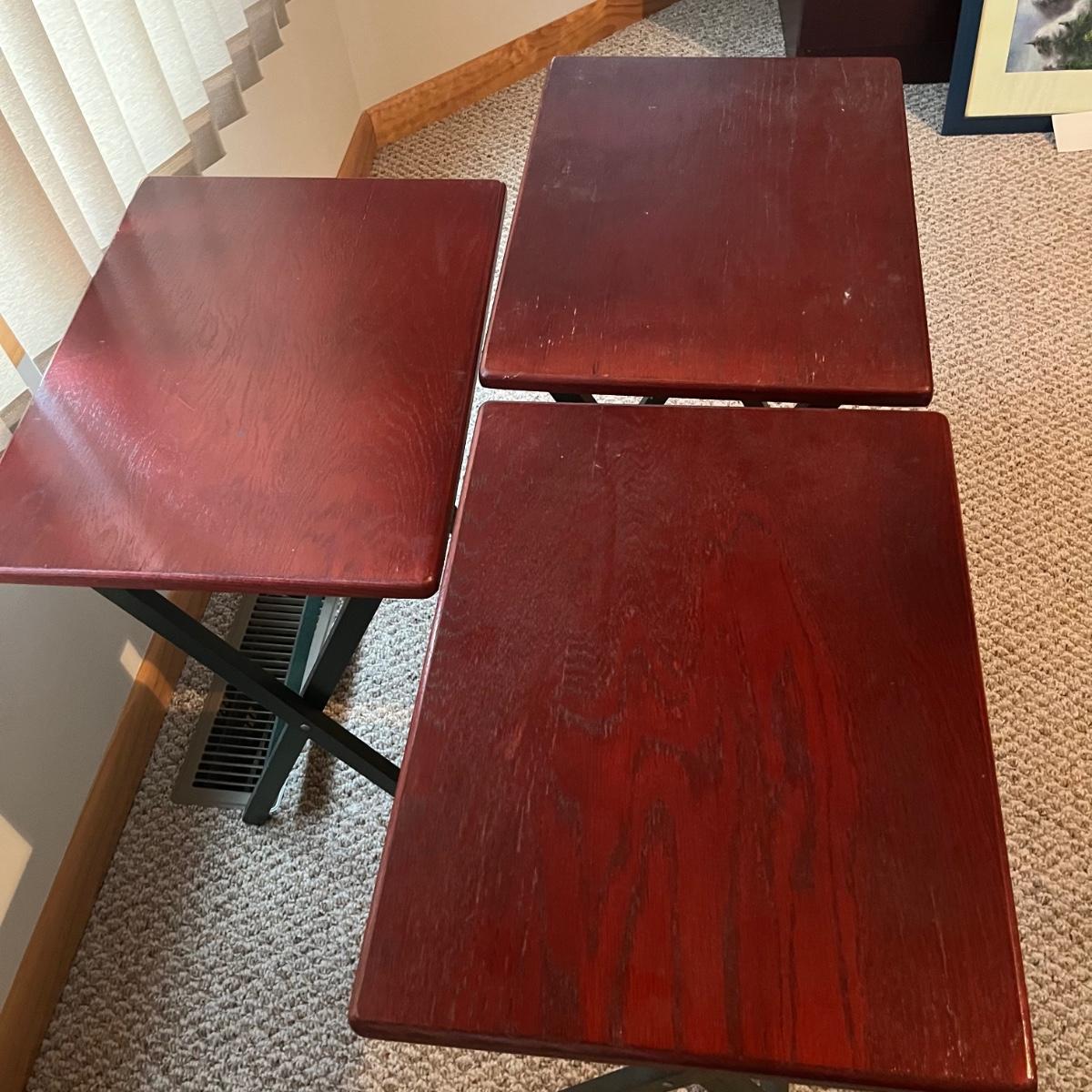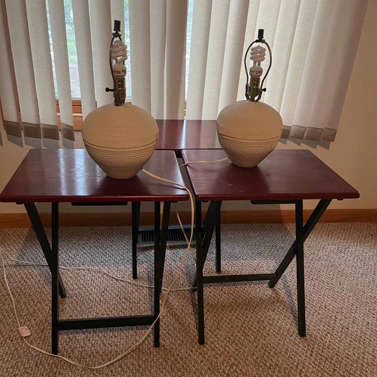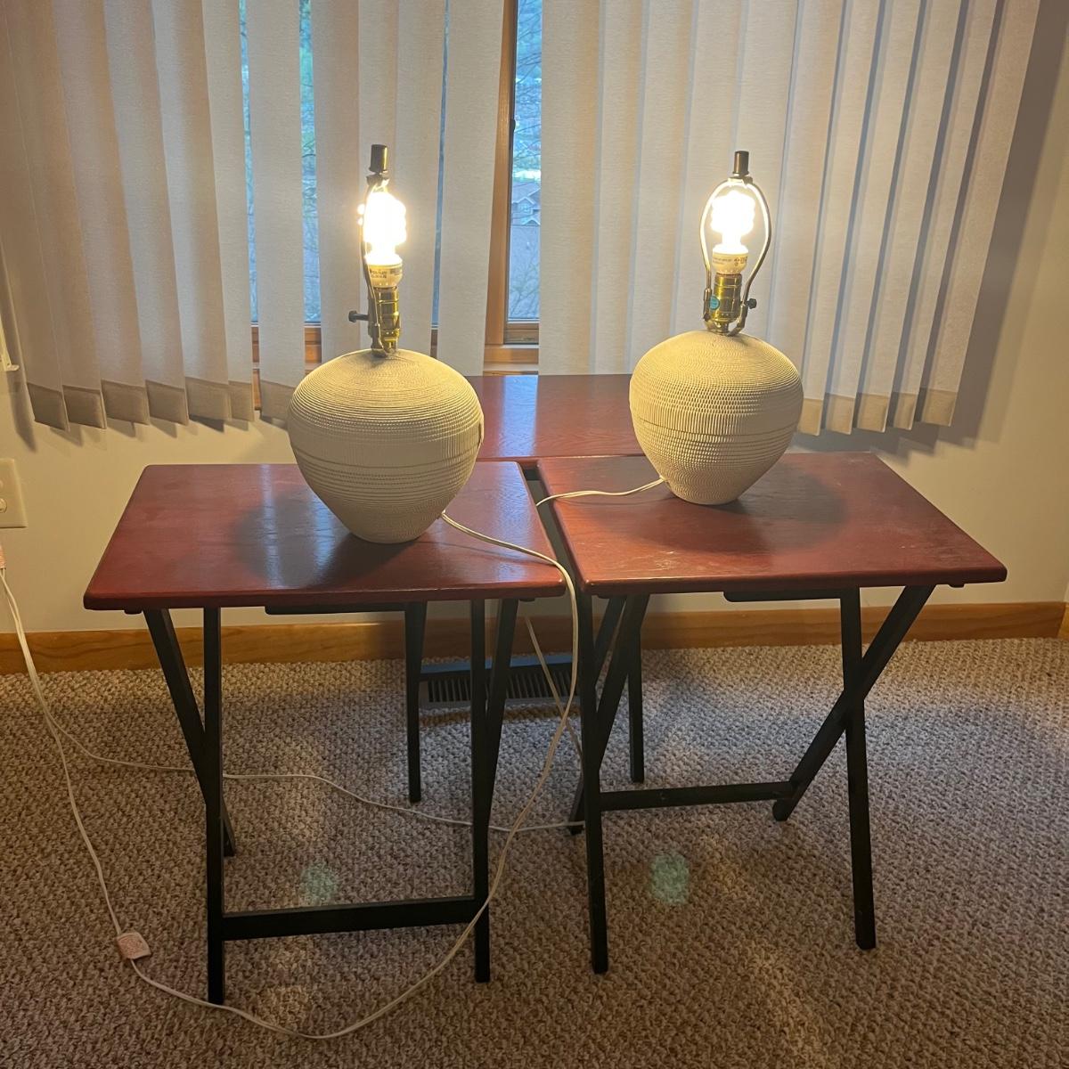 Lot includes three wooden TV trays and two matching table lamps that worked when plugged in. TV trays have some wear on tops, see pictures. TV trays measure 19” x 14.5” x 24”H.