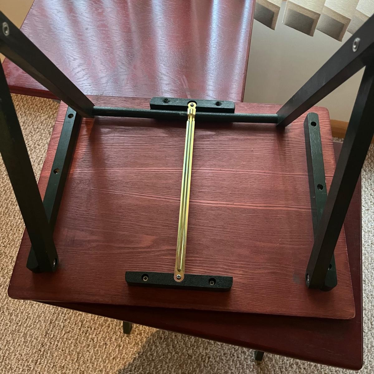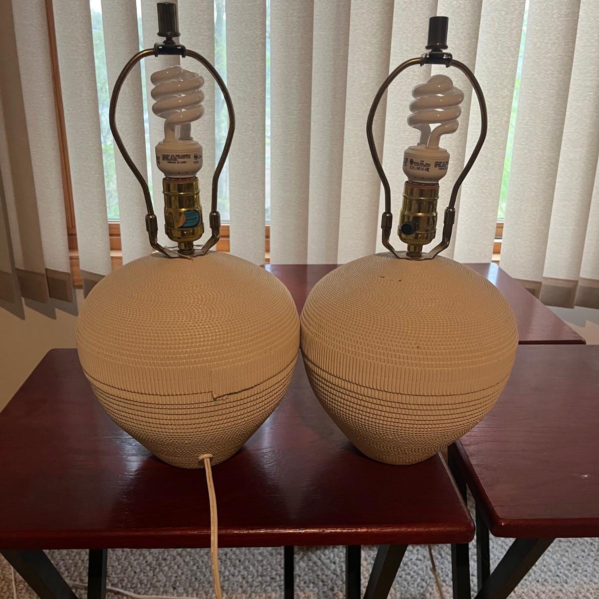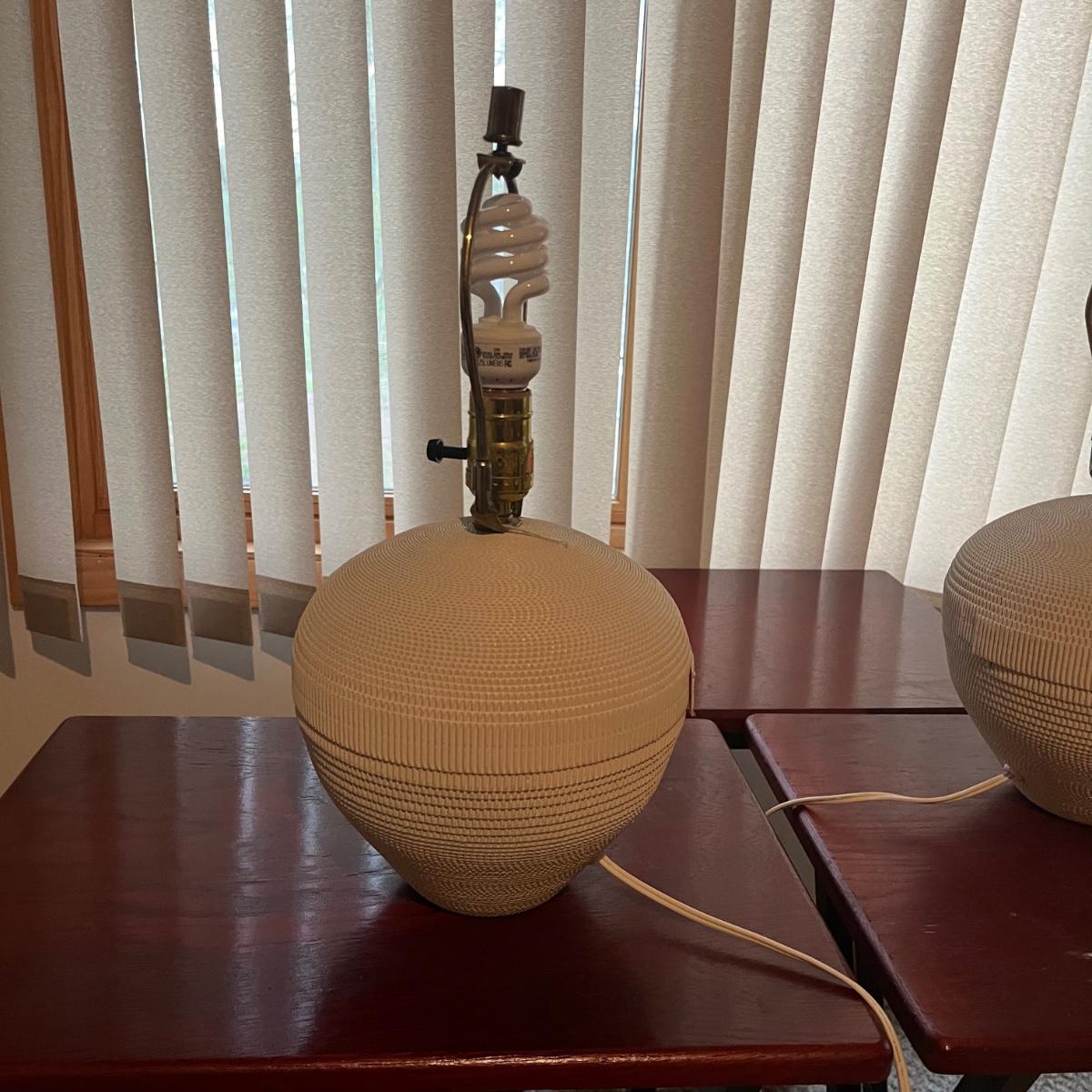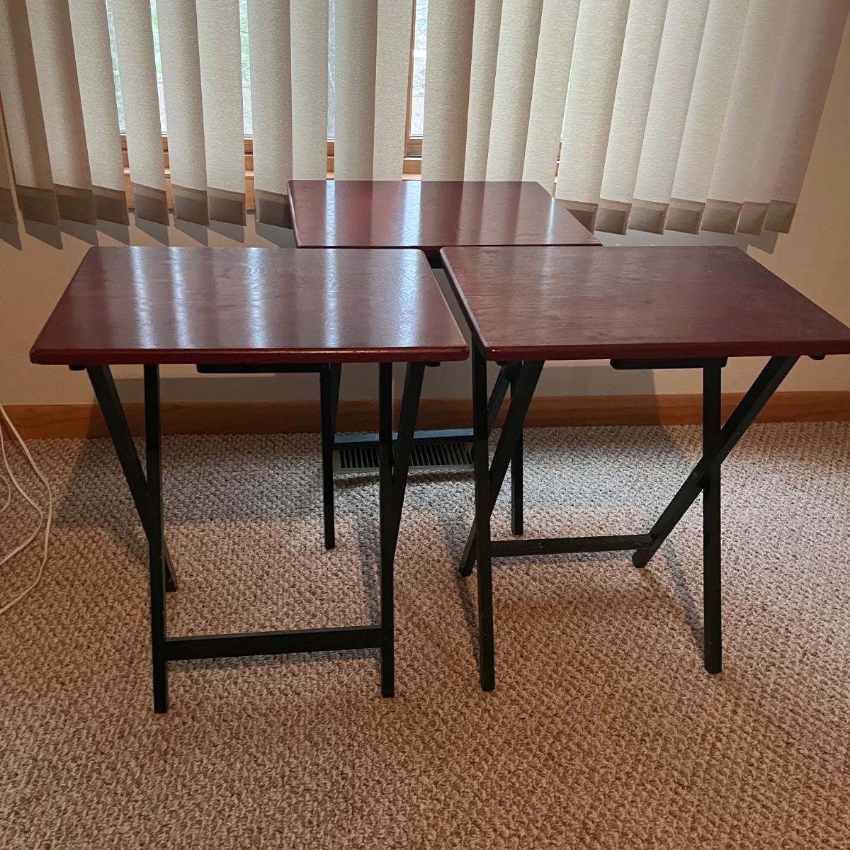 Lot includes three wooden TV trays and two matching table lamps that worked when plugged in. TV trays have some wear on tops, see pictures. TV trays measure 19” x 14.5” x 24”H.