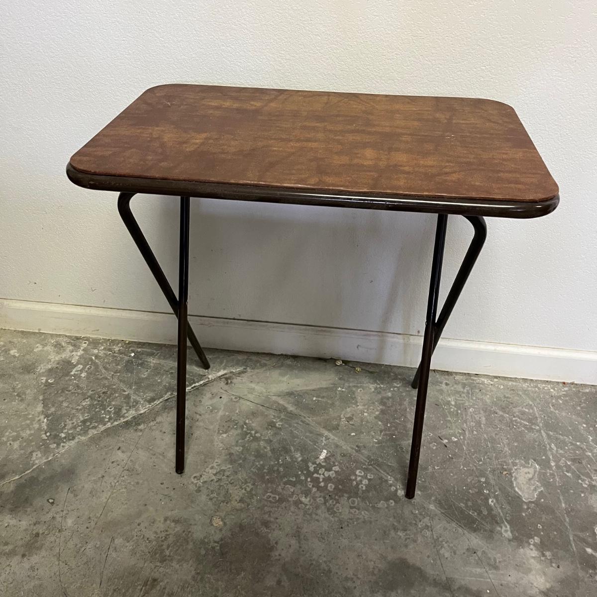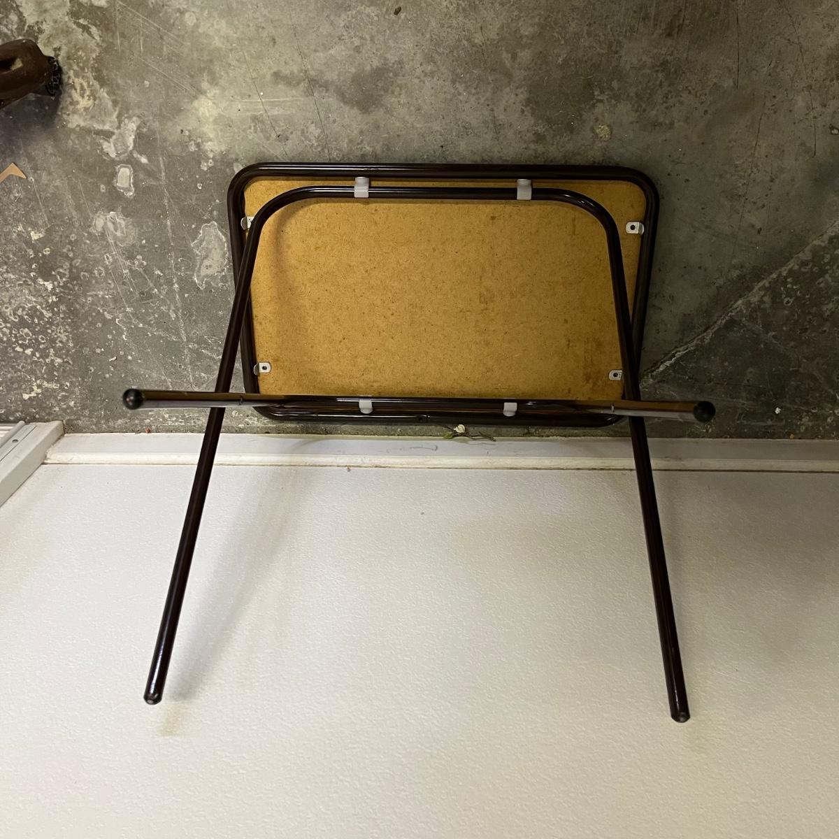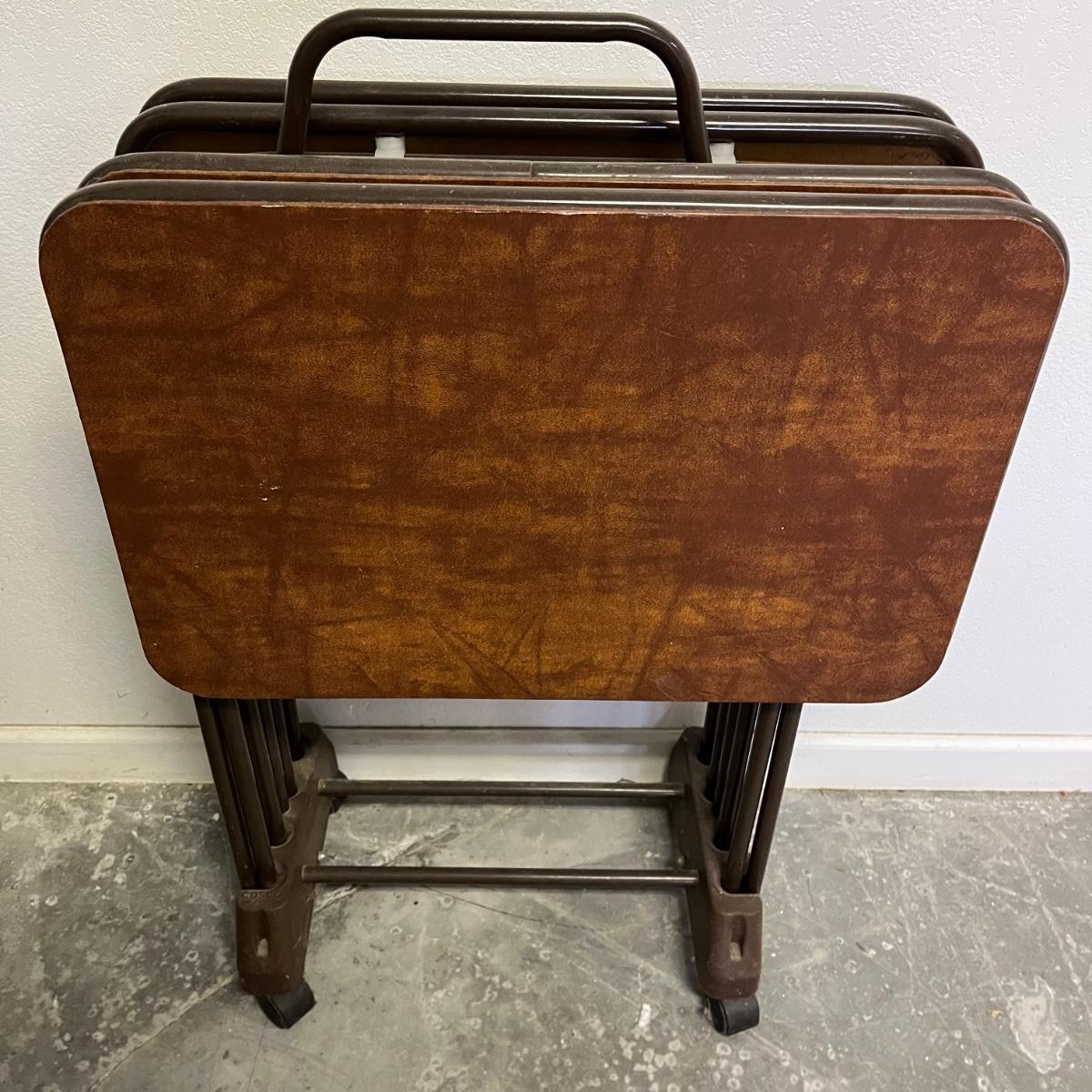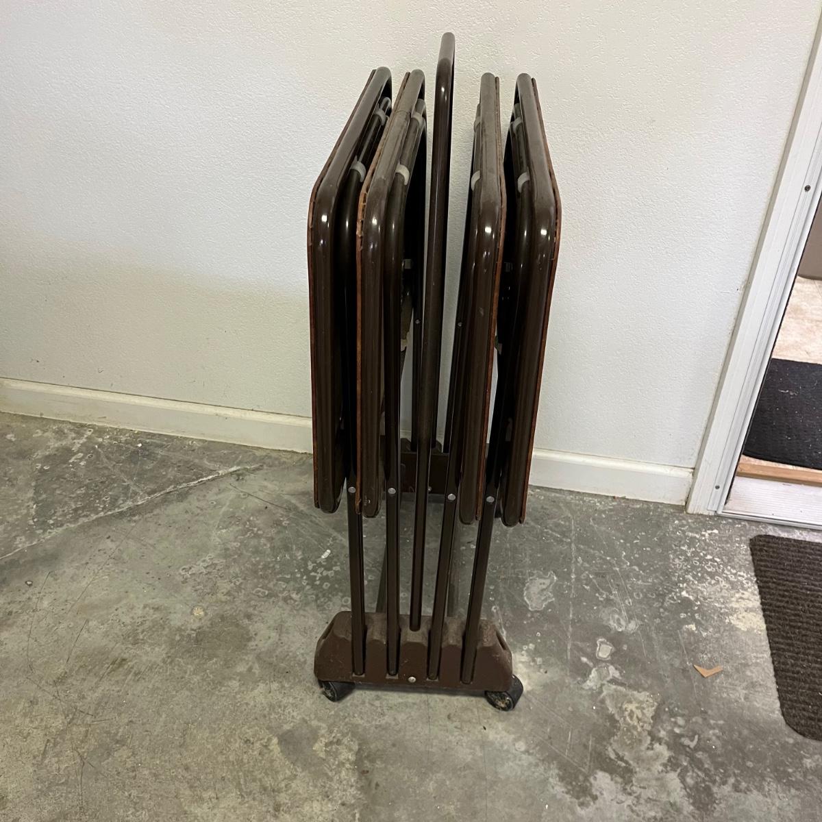 Lot includes four TV trays on a rolling stand. Trays have metal frames with fiberboard covered with vinyl tops. TV trays with stand measure 11” x 22” x 34”.