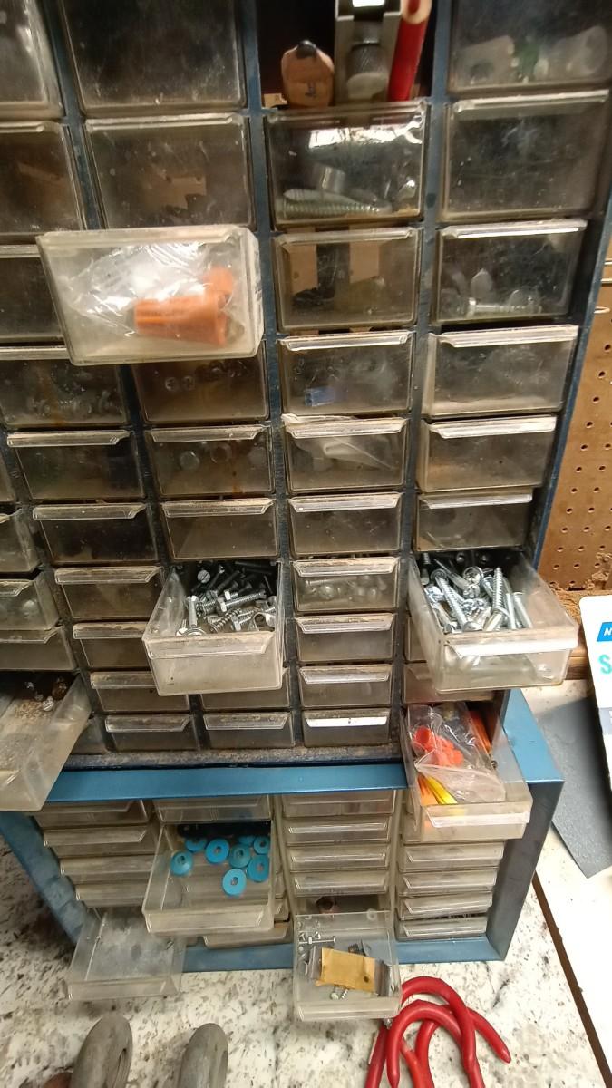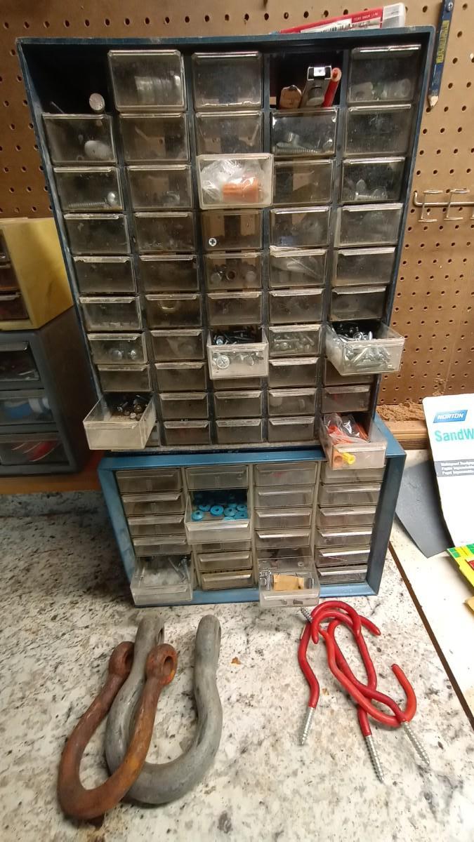 TW0 ORGANIZERS 1 HAS 50 DRAWERS (ONE MISSING) AND THE OTHJER IS 20 DRAWER BOTH FILLED WITH HARDWARE