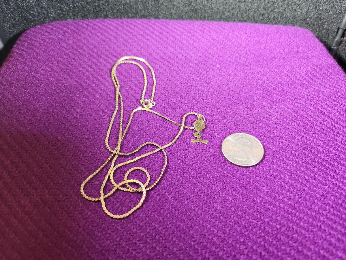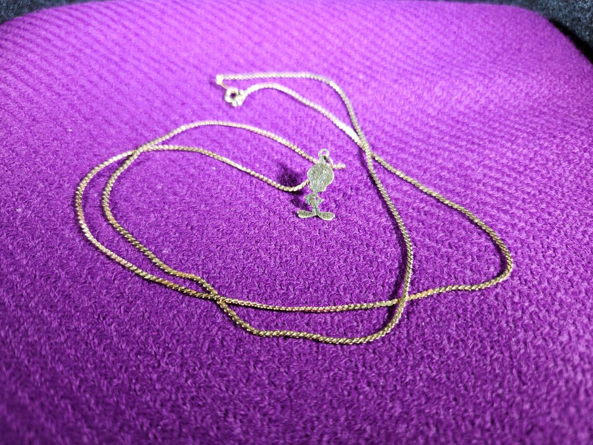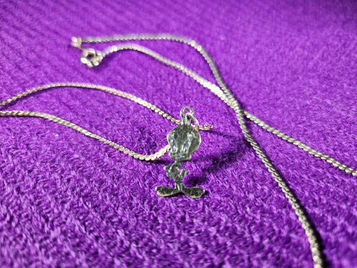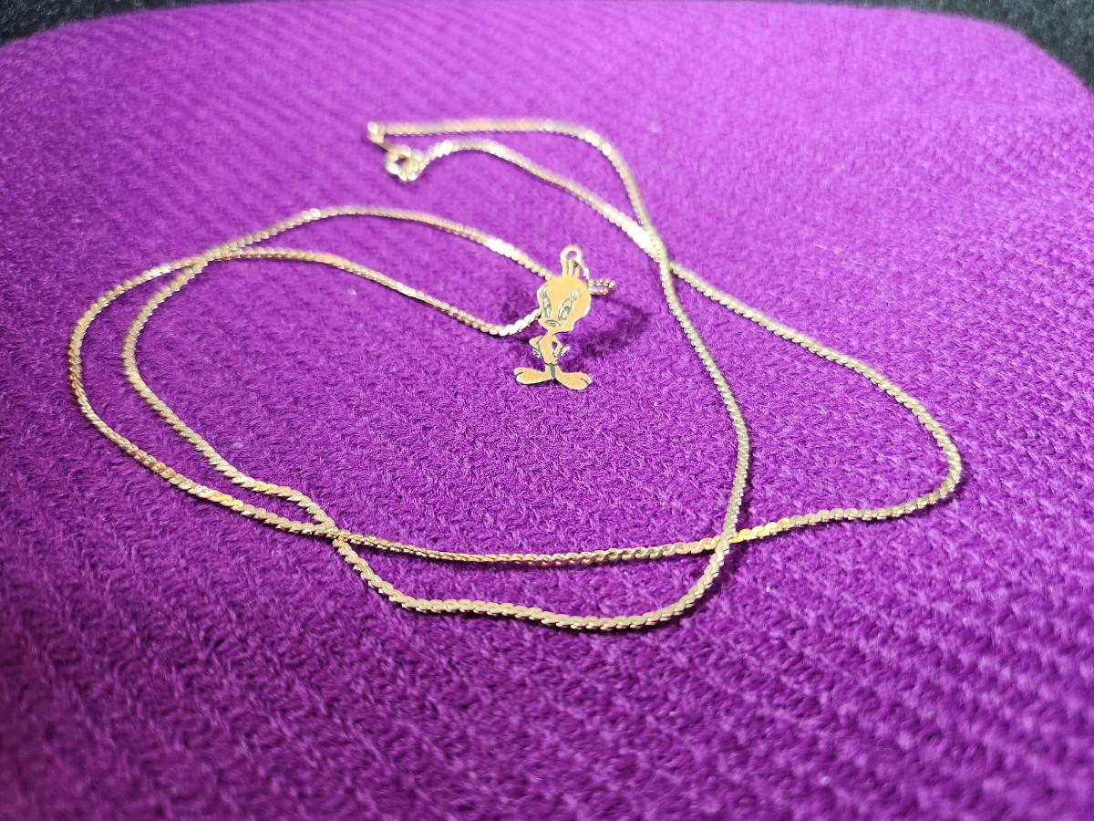 This auction lot is for a Tweety-Bird Pendant and Chain. The chain is marked 1/20 14GF. The Tweety-Bird is marked 14K and weighs about .009ozt. The chain measures about 26-Inches. A nice collectible for the Tweety Bird lover.