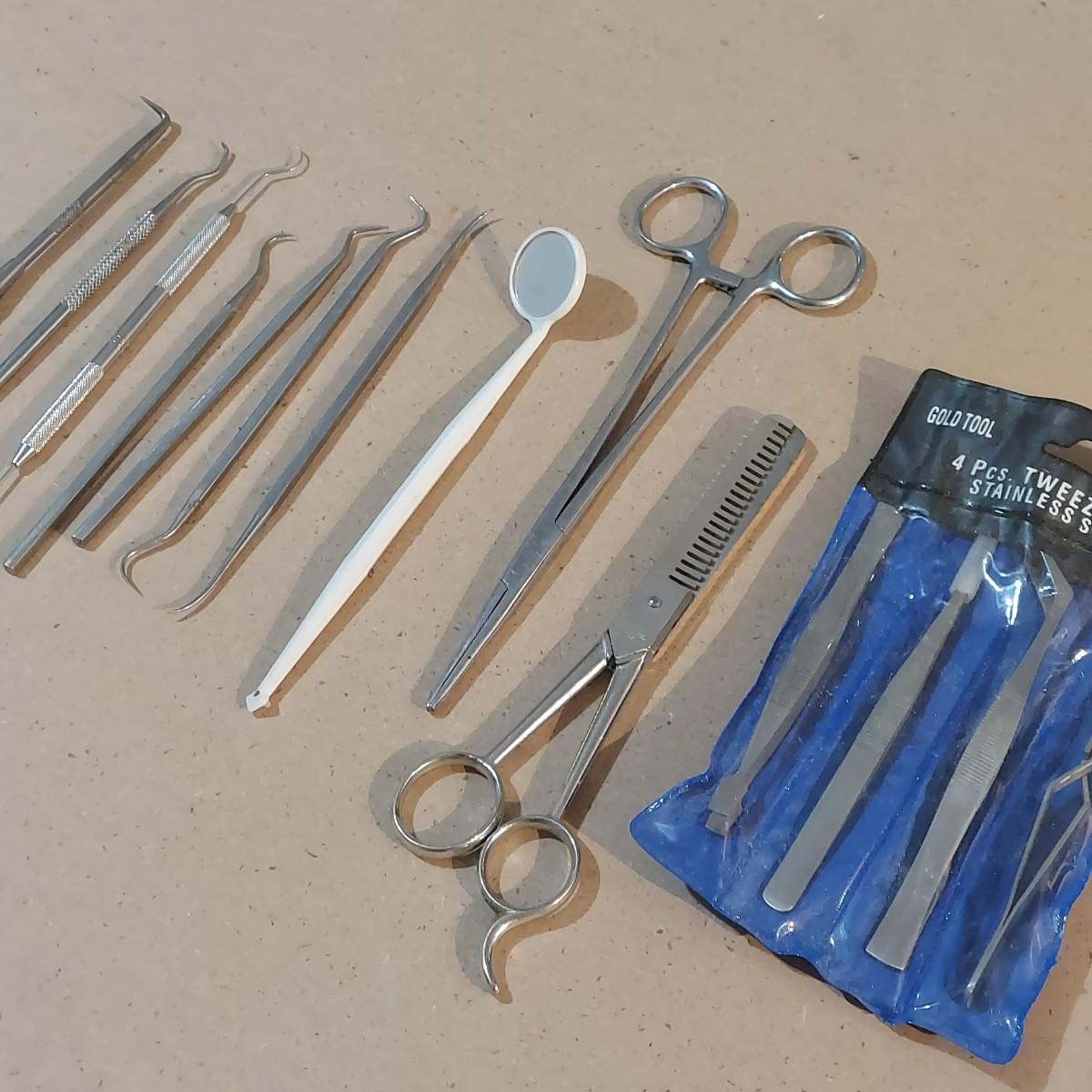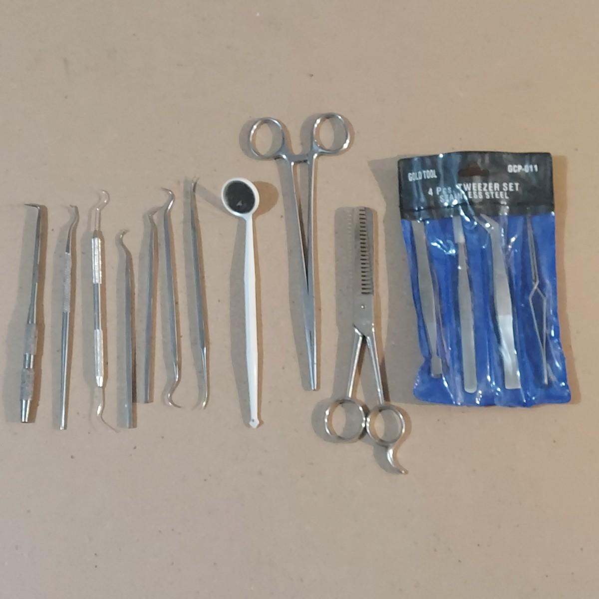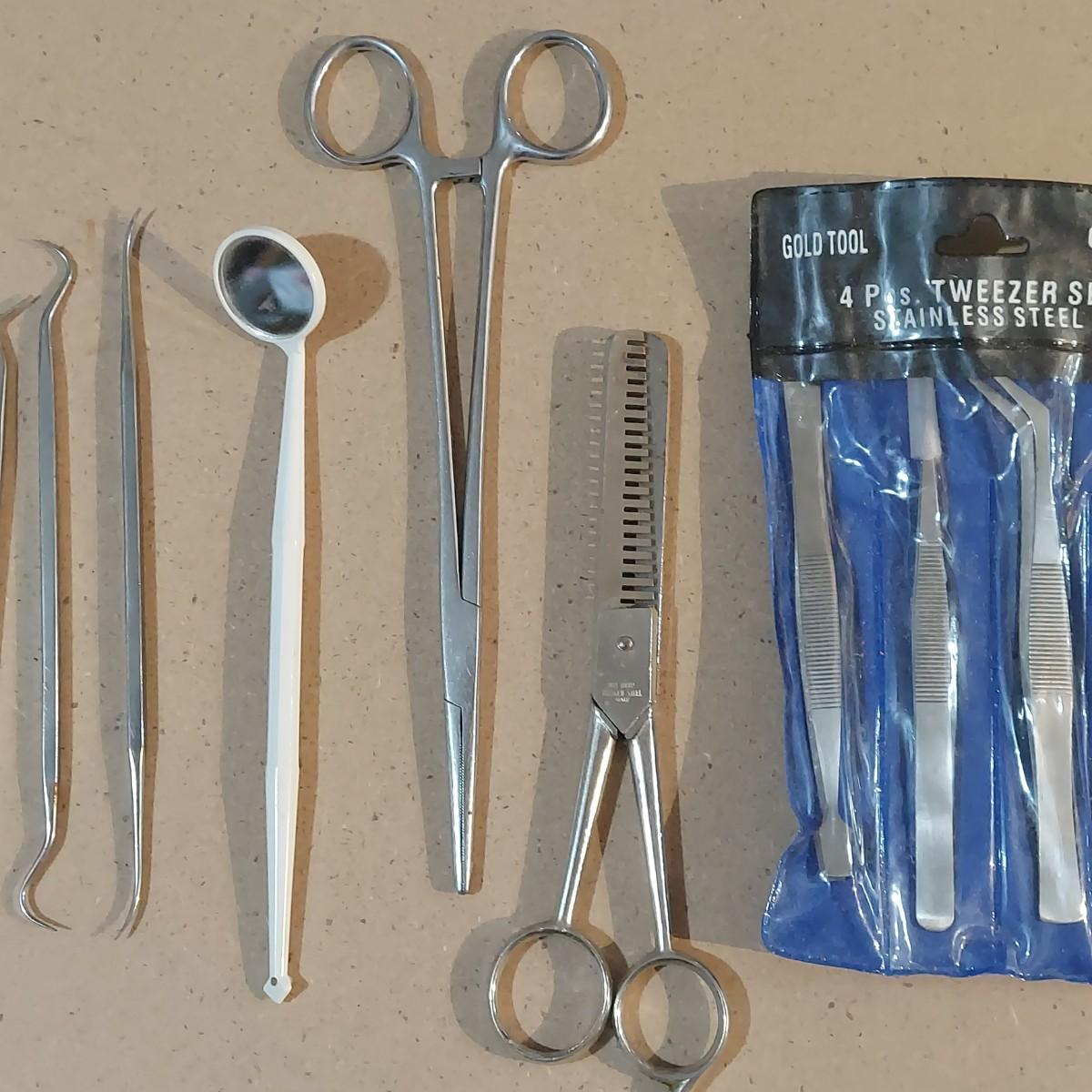 Lot includes a four-piece tweezer set with eight dental tools, a pair of 8” hemostats and a pair of texturizing shears. It appears that these tools were used for hobby work, such as model trains and/or carpentry. Items do not appear to have been used for personal hygiene care. Please see photos for details. Shipping available