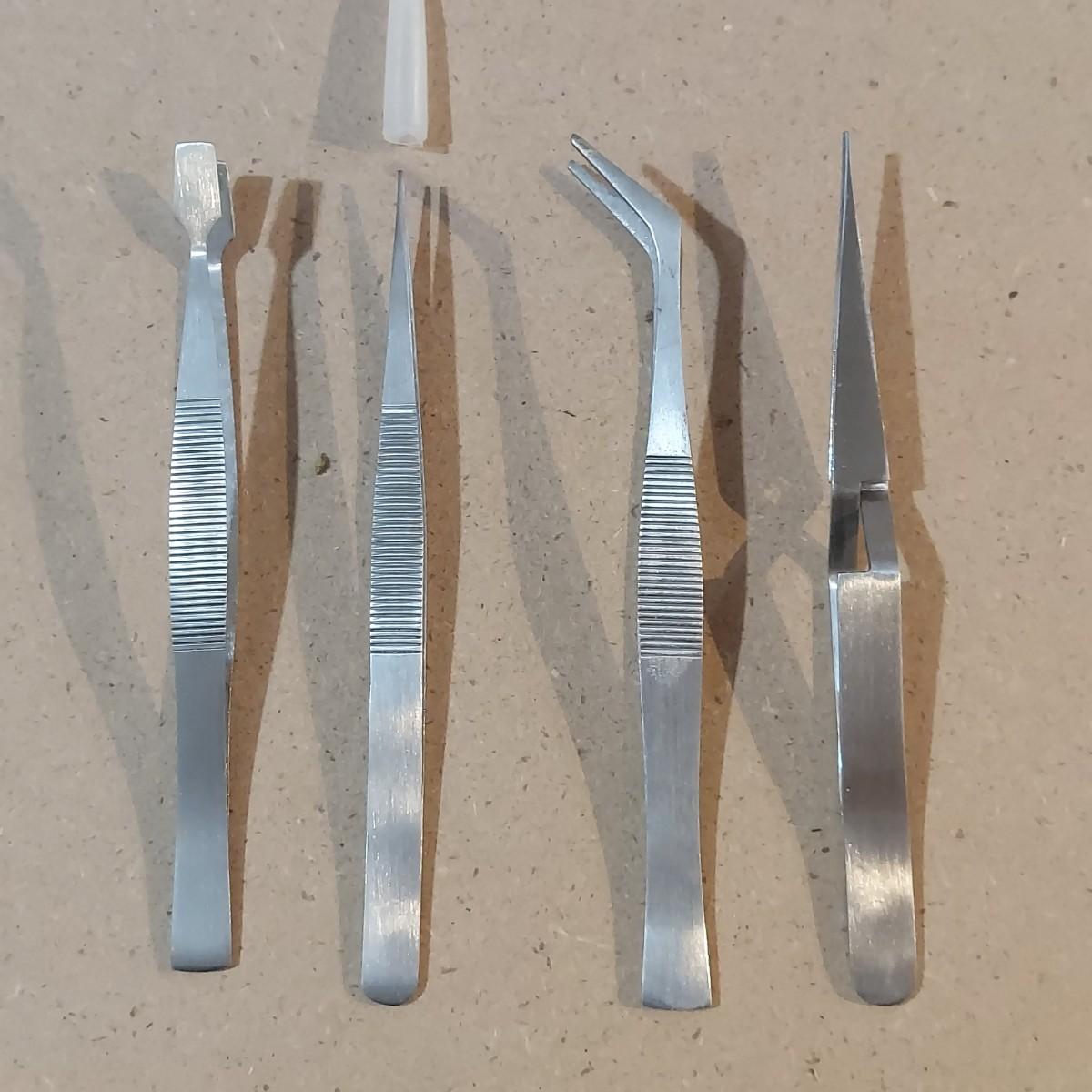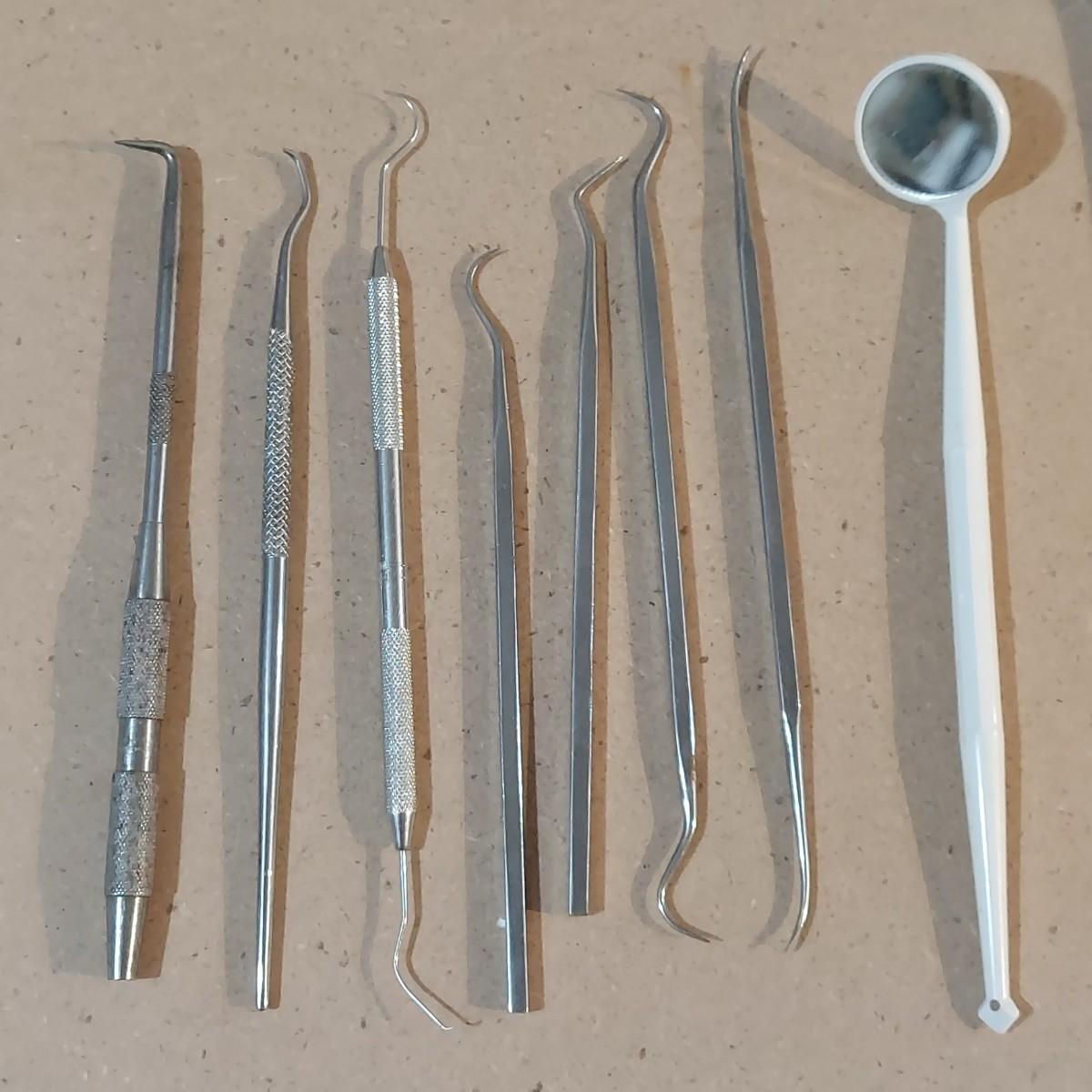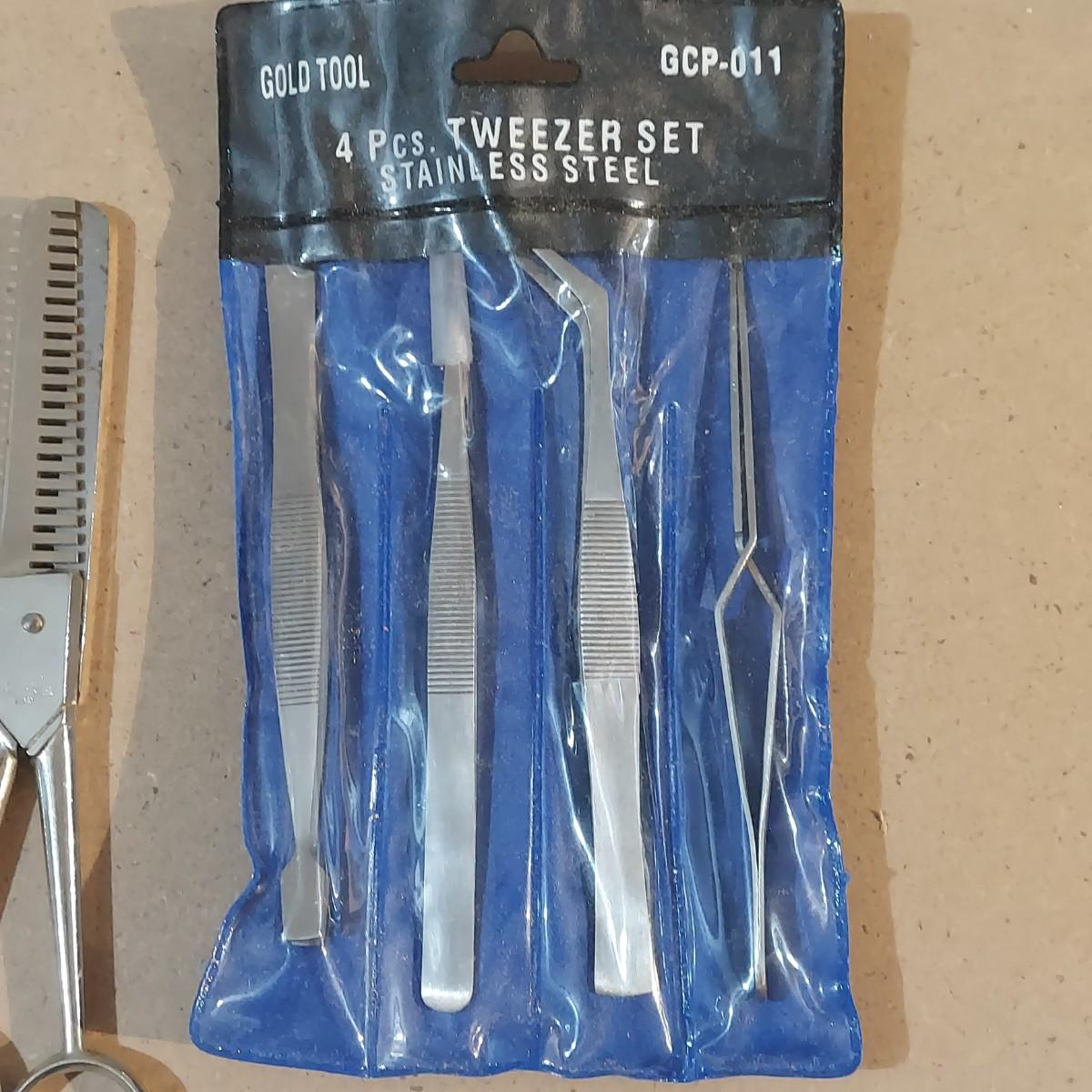 Lot includes a four-piece tweezer set with eight dental tools, a pair of 8” hemostats and a pair of texturizing shears. It appears that these tools were used for hobby work, such as model trains and/or carpentry. Items do not appear to have been used for personal hygiene care. Please see photos for details. Shipping available