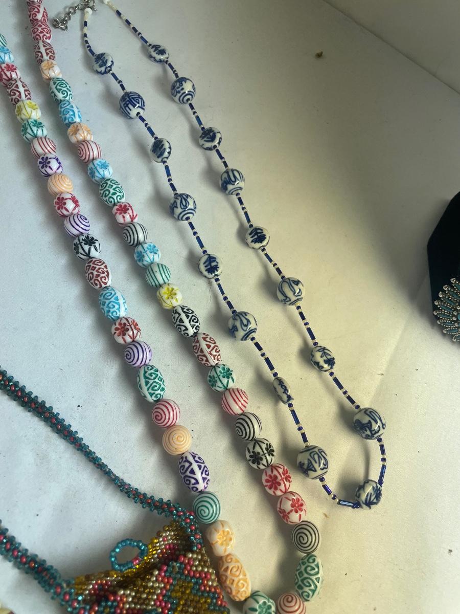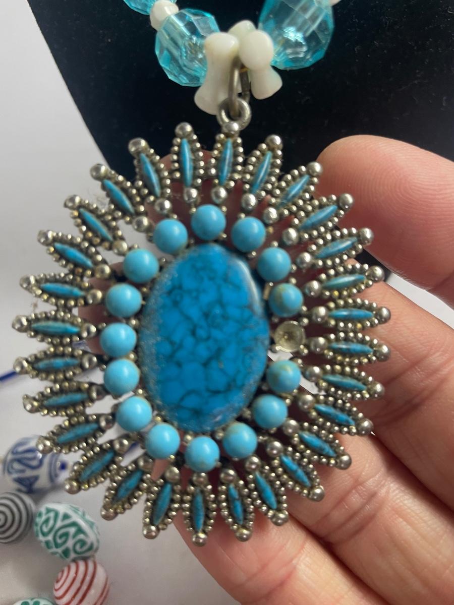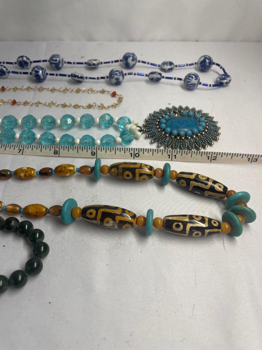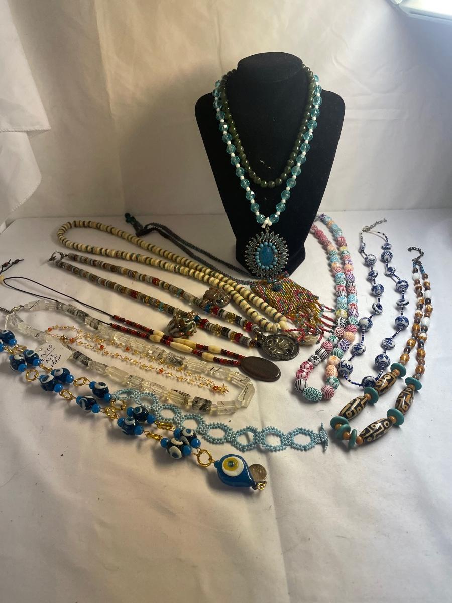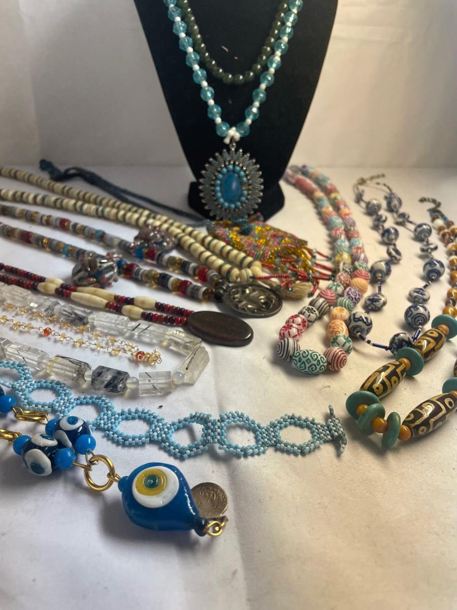 Lots of colors to choose from in this assortment of beaded necklaces. Note the blue stone pendant is missing one stone in its setting. Also included is a blue beaded bracelet. Beads are of different materials like glass, clay, resin and more.
