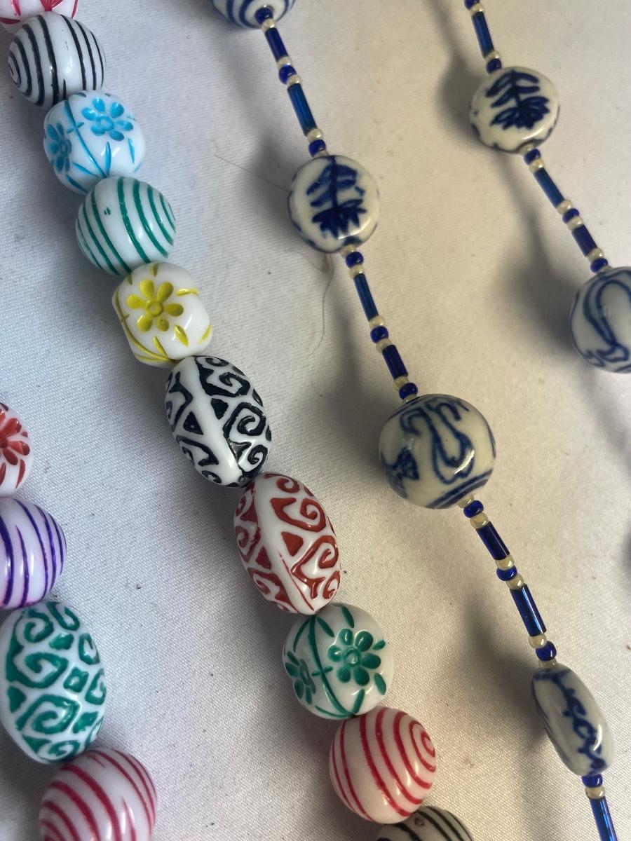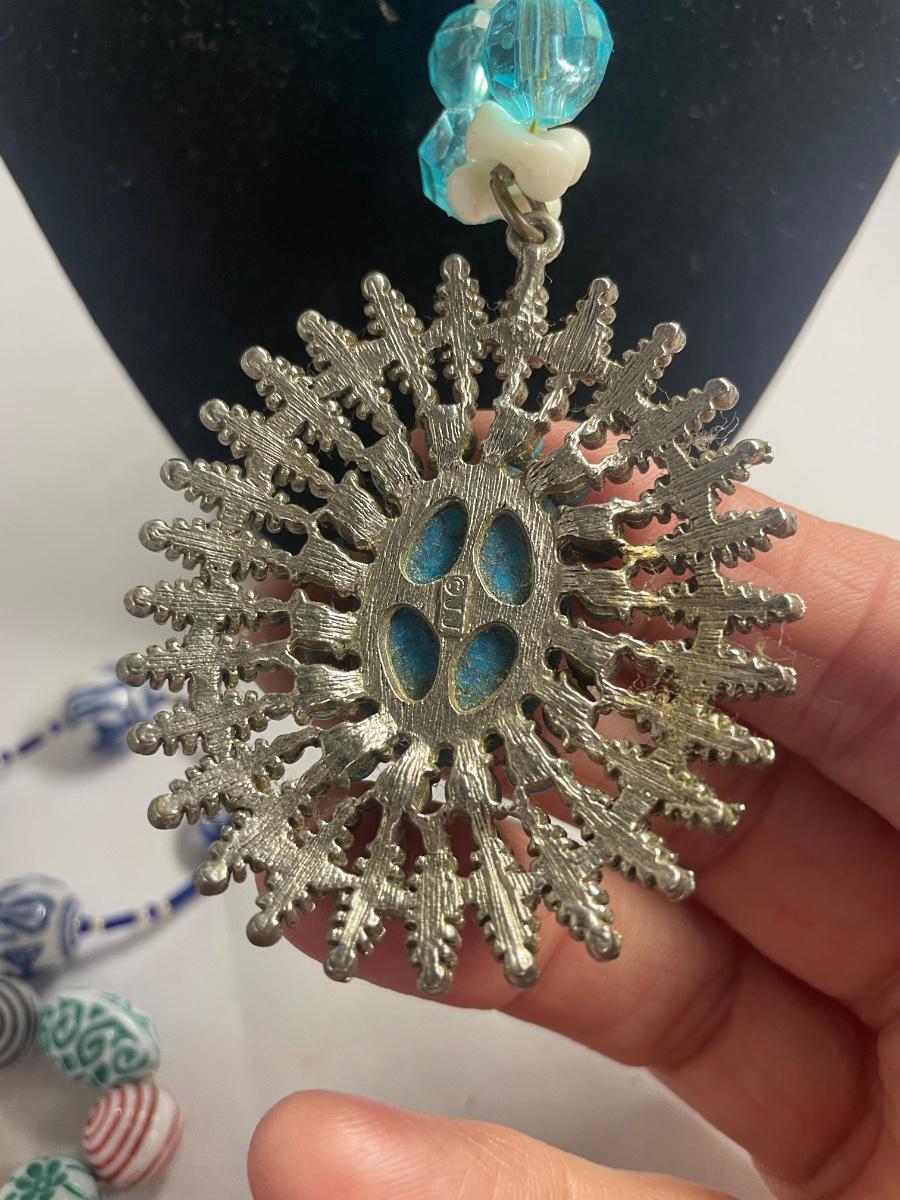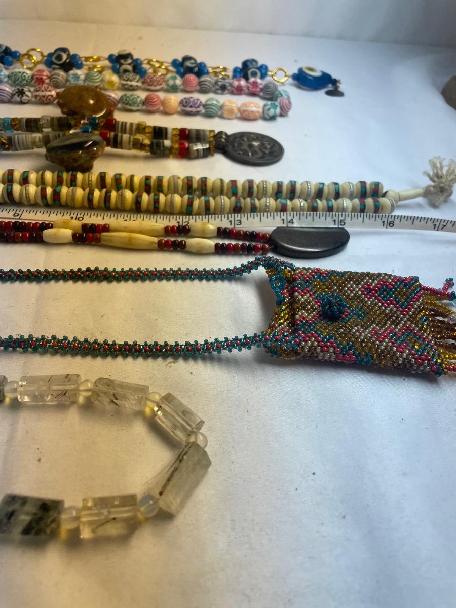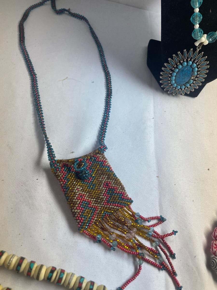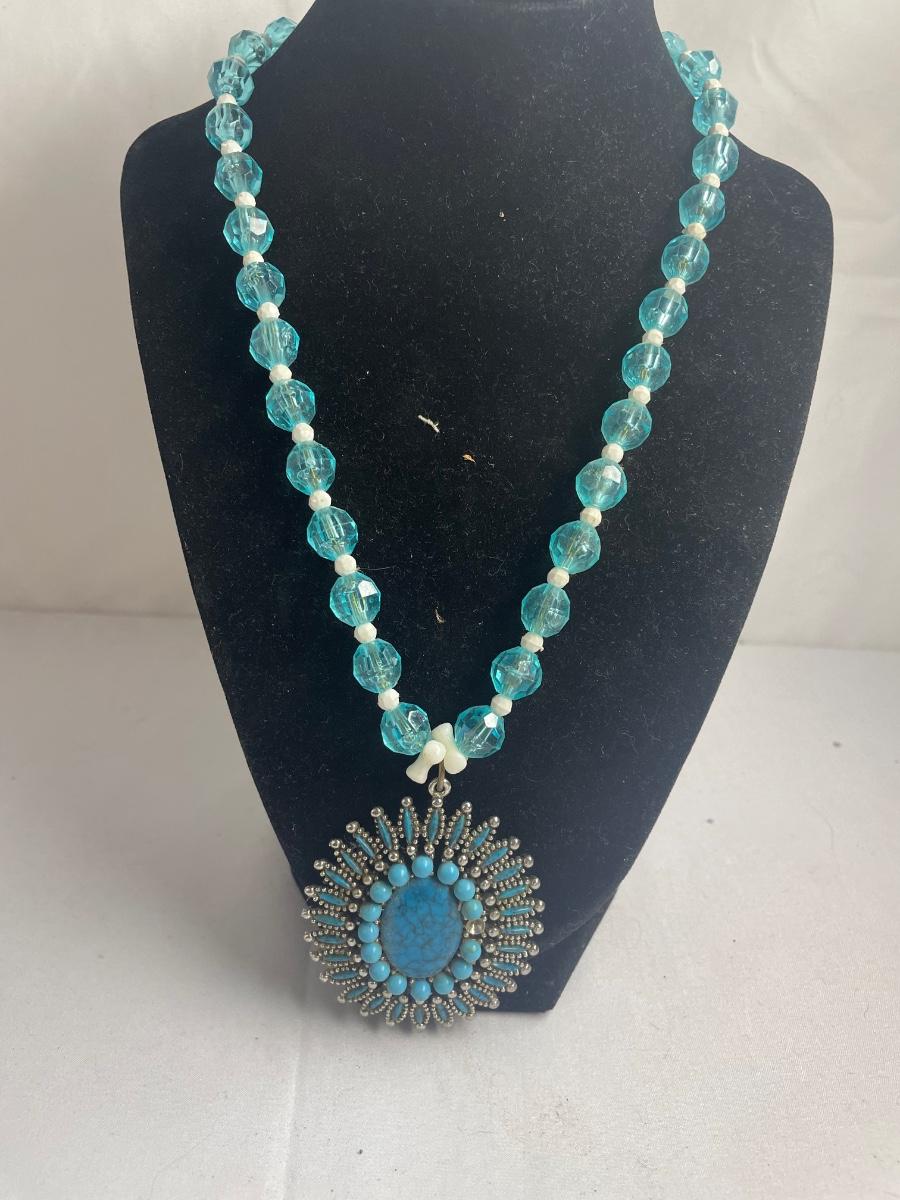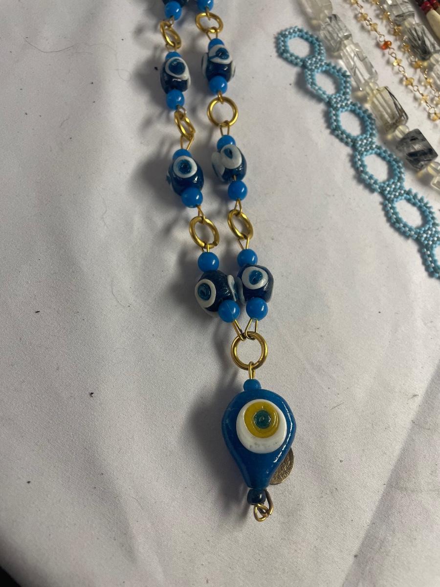 Lots of colors to choose from in this assortment of beaded necklaces. Note the blue stone pendant is missing one stone in its setting. Also included is a blue beaded bracelet. Beads are of different materials like glass, clay, resin and more.