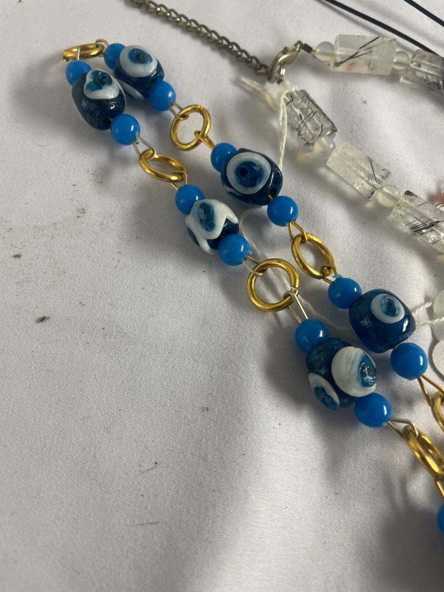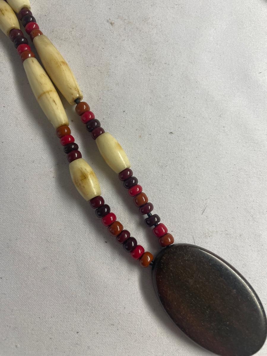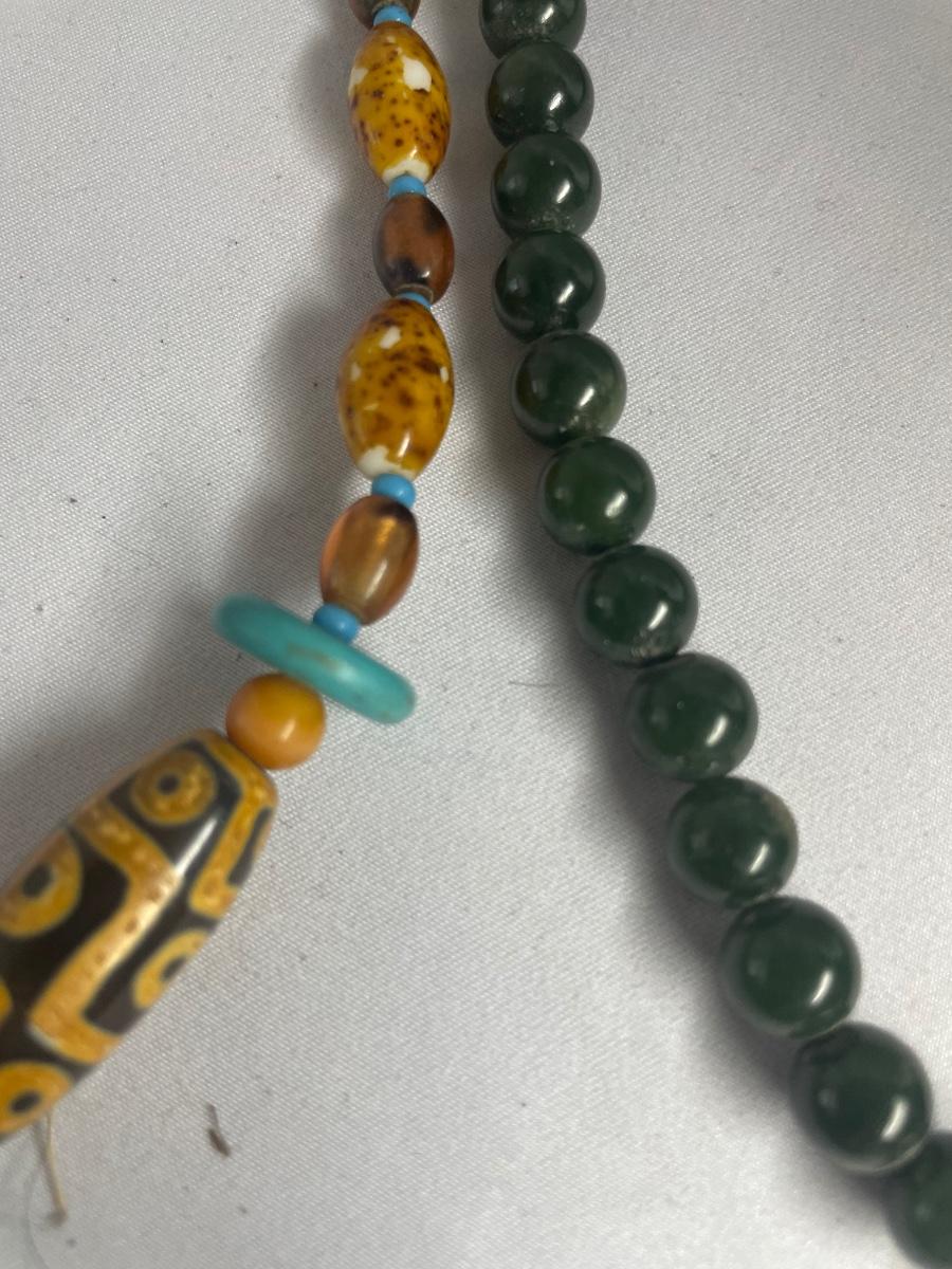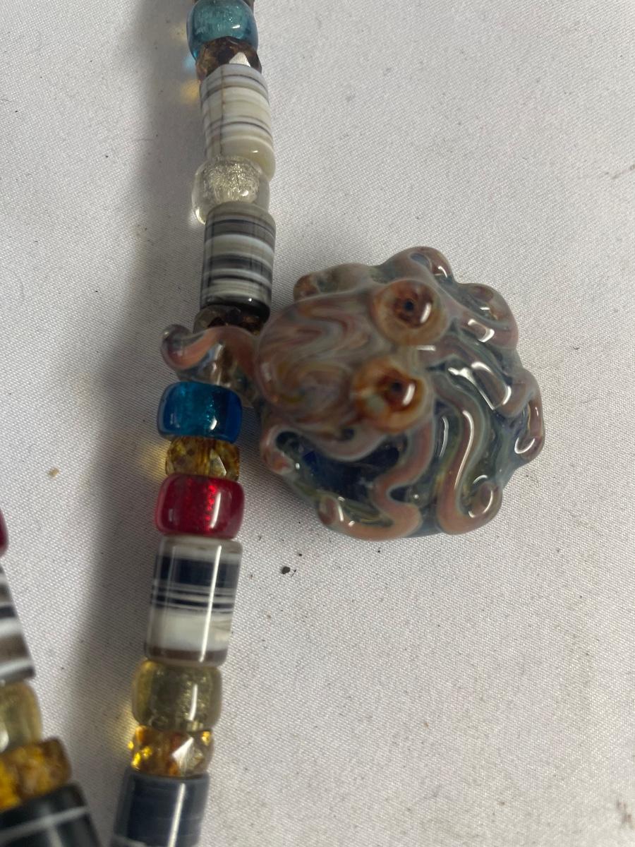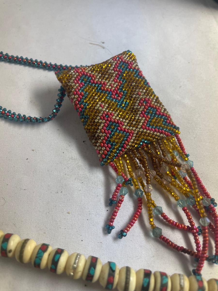 Lots of colors to choose from in this assortment of beaded necklaces. Note the blue stone pendant is missing one stone in its setting. Also included is a blue beaded bracelet. Beads are of different materials like glass, clay, resin and more.