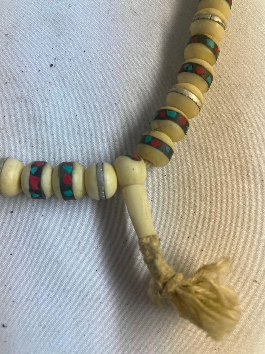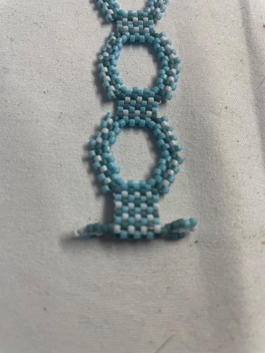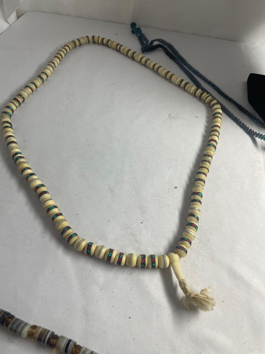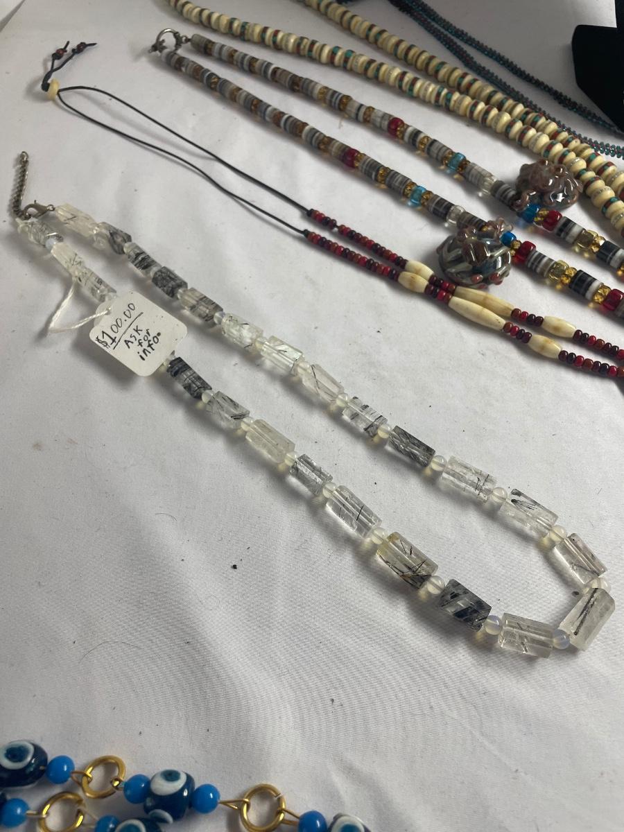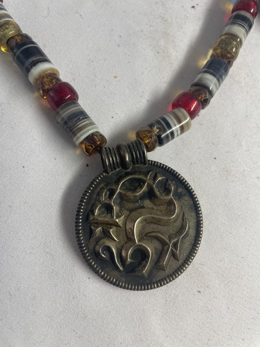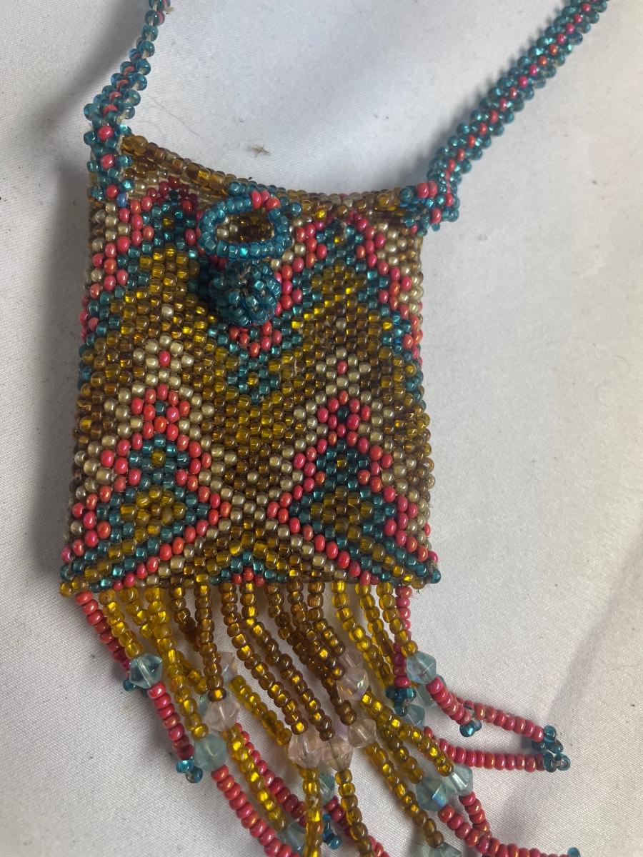 Lots of colors to choose from in this assortment of beaded necklaces. Note the blue stone pendant is missing one stone in its setting. Also included is a blue beaded bracelet. Beads are of different materials like glass, clay, resin and more.