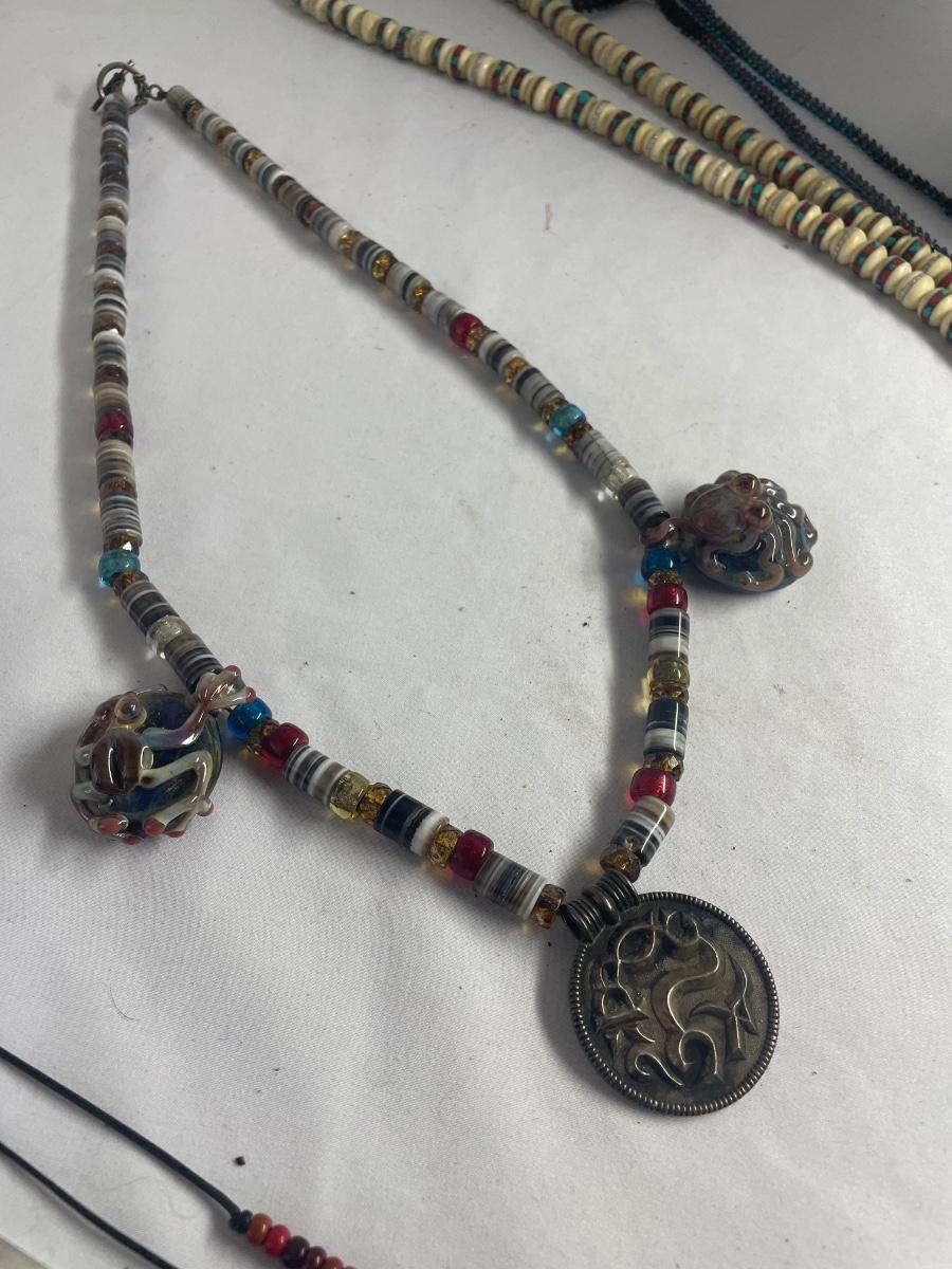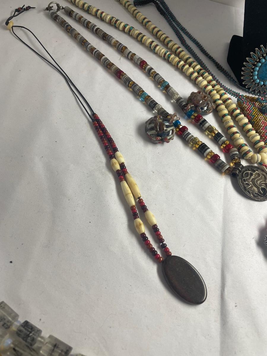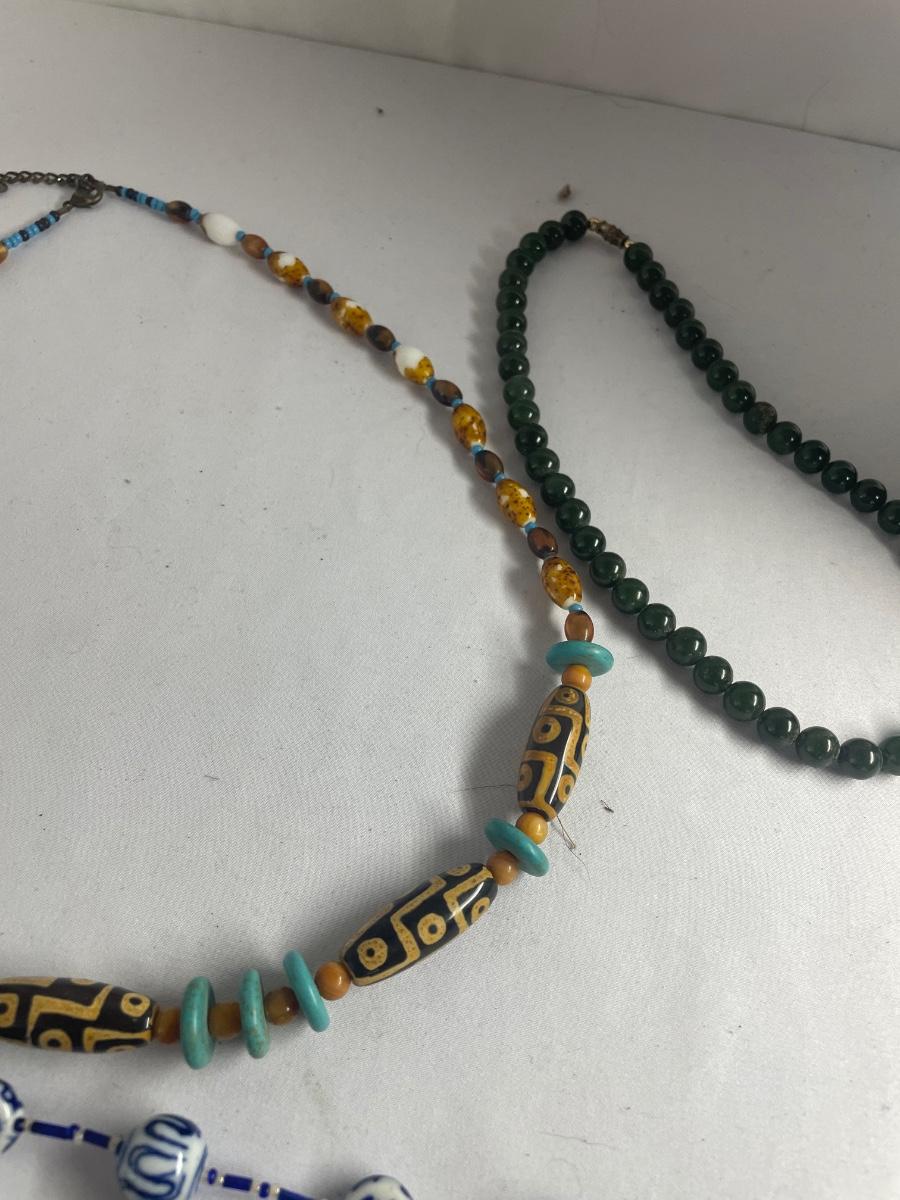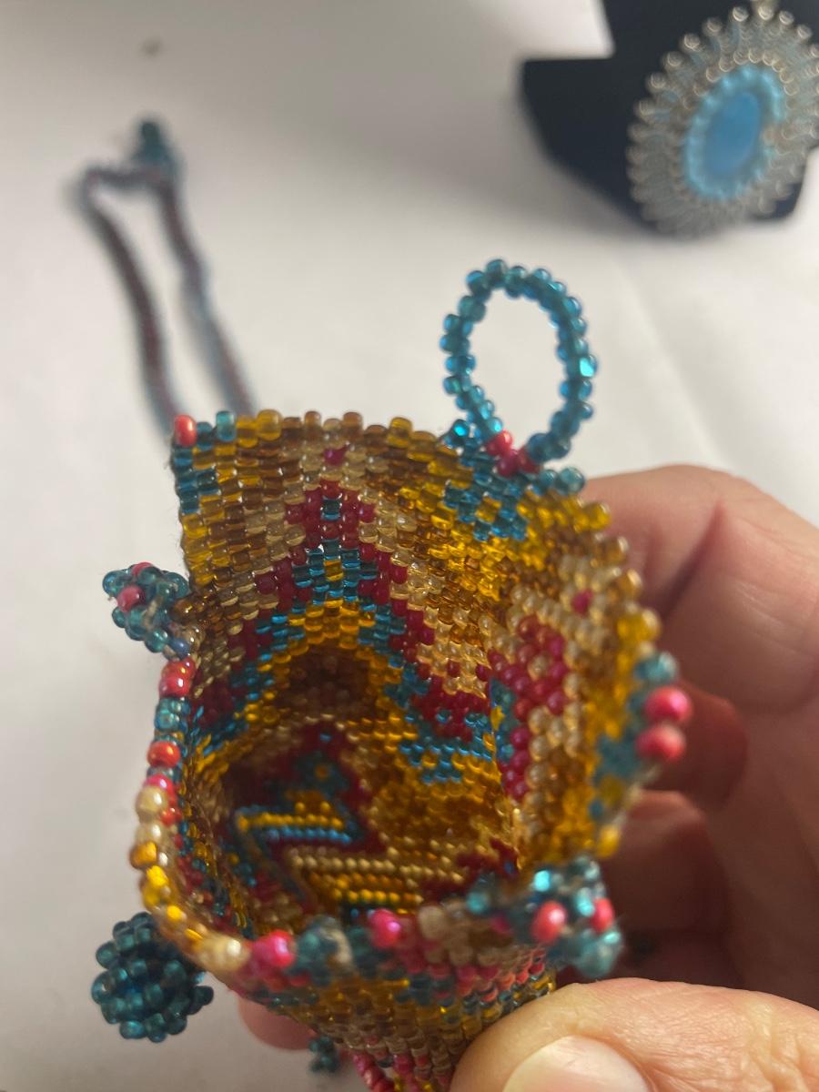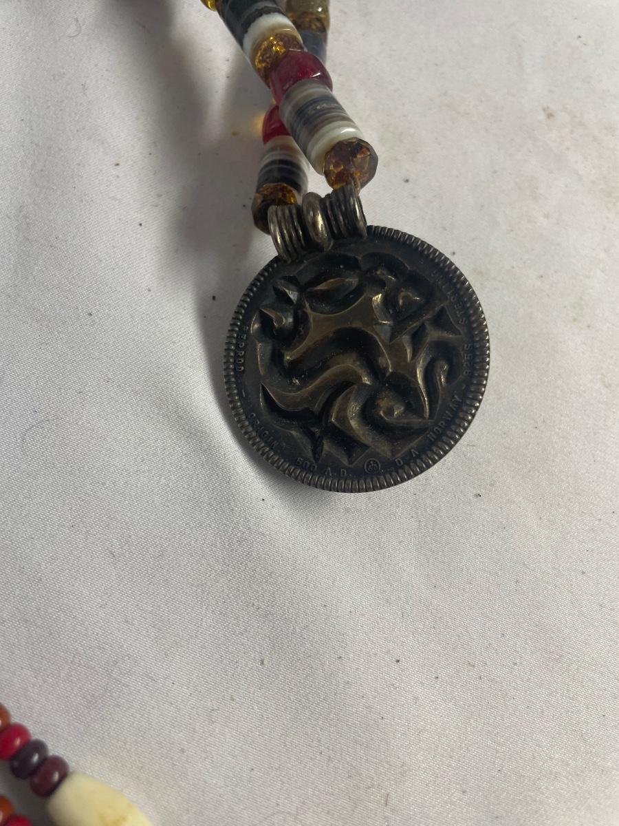 Lots of colors to choose from in this assortment of beaded necklaces. Note the blue stone pendant is missing one stone in its setting. Also included is a blue beaded bracelet. Beads are of different materials like glass, clay, resin and more.