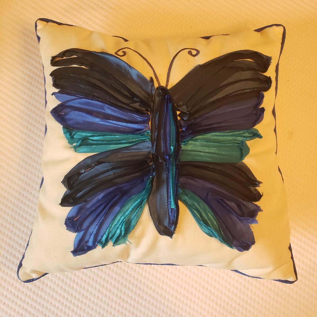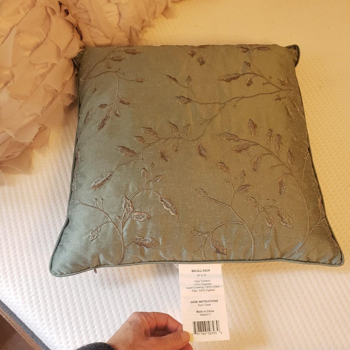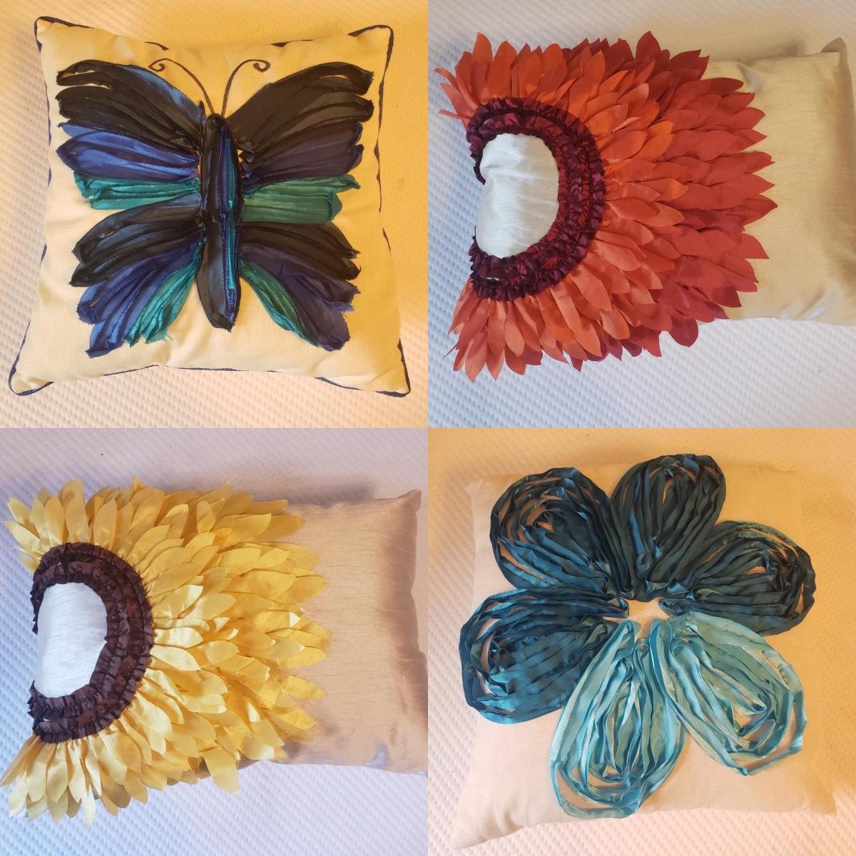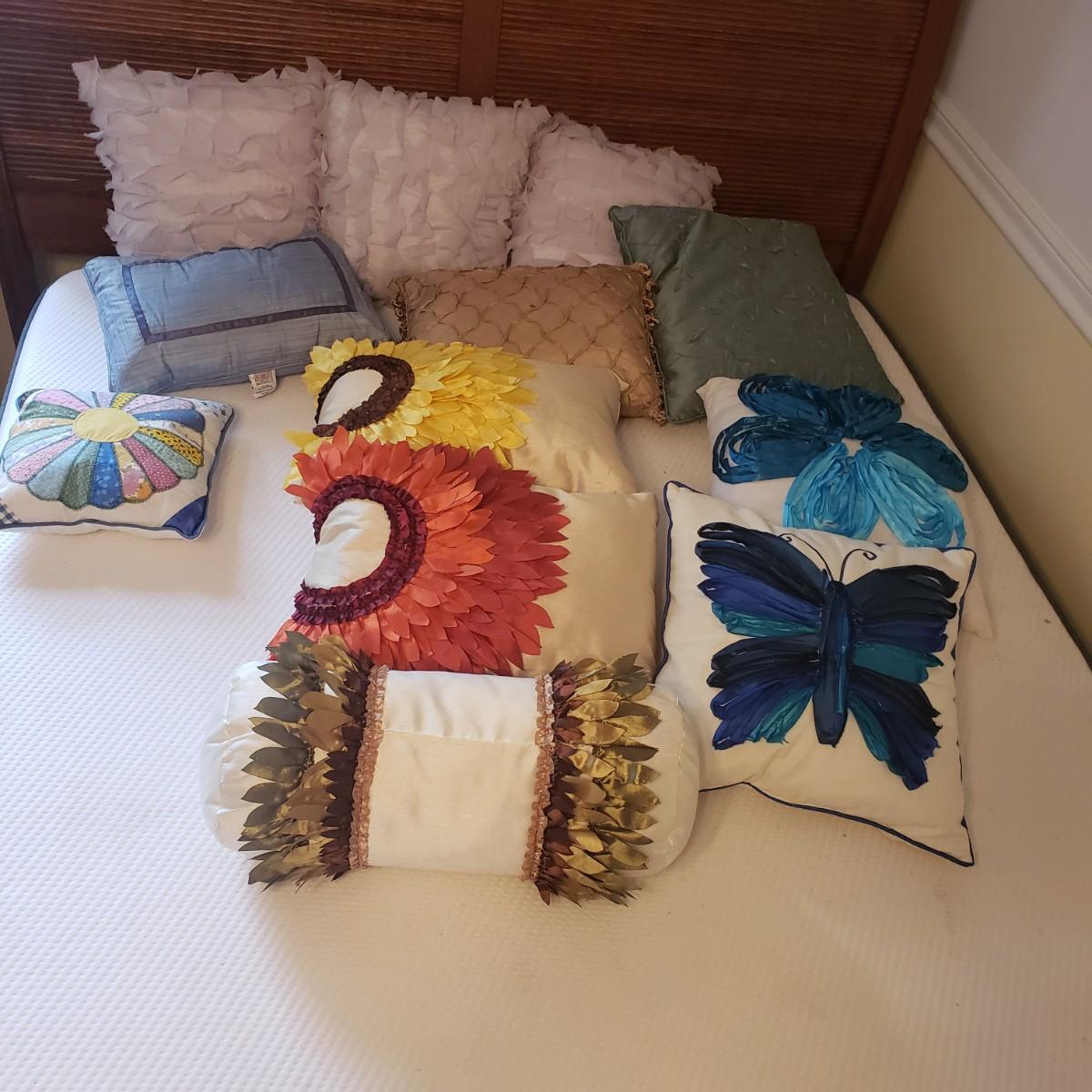These twelve decorative pillows will brighten any room! The butterfly and turquoise pillows measure 15" x 15" and are a cotton blend with polyester ribbons. The three sunflower pillows are a thicker polyester. The Bloom Craft Home pillow is 70% silk and 30% polyester.