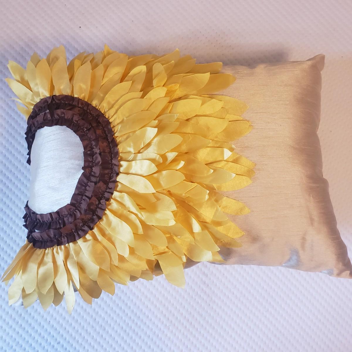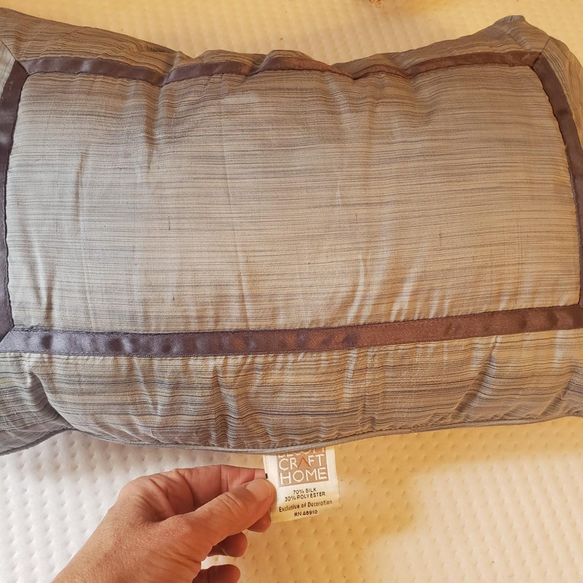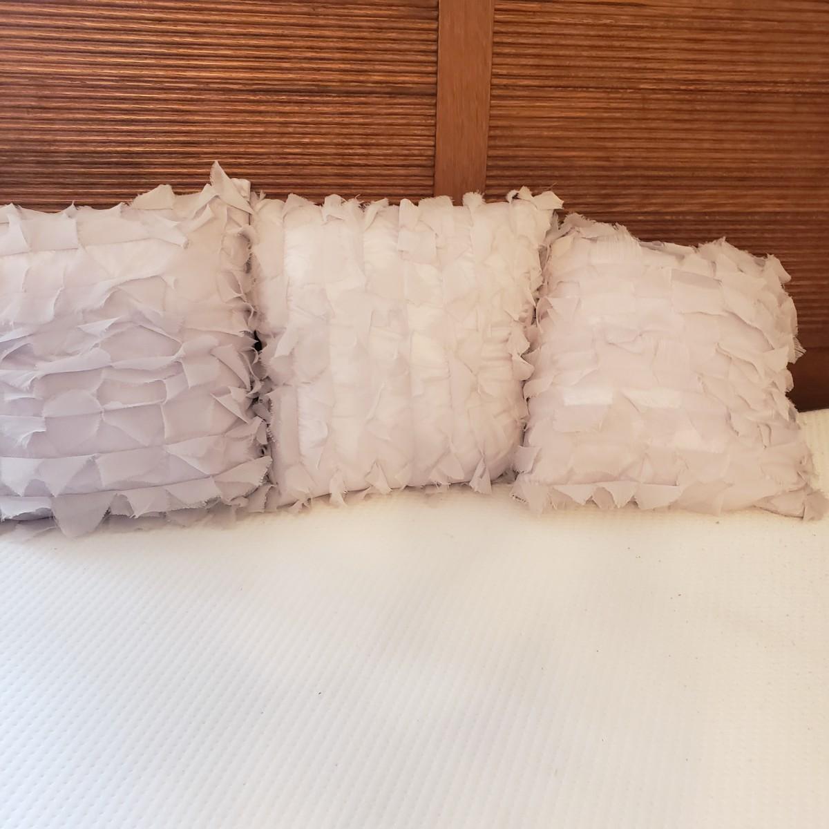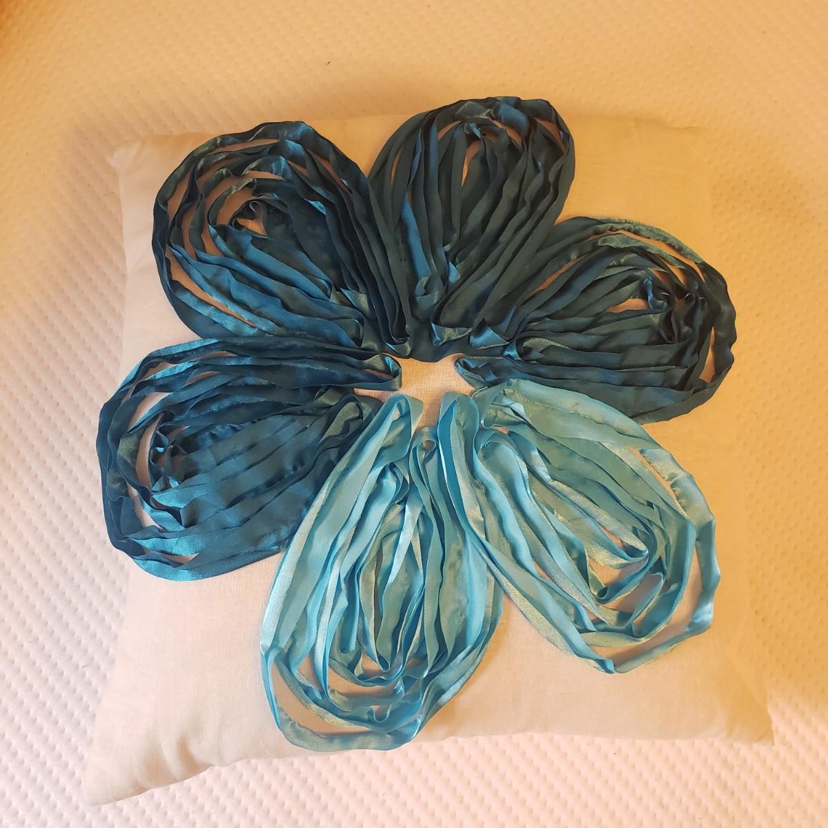 These twelve decorative pillows will brighten any room! The butterfly and turquoise pillows measure 15" x 15" and are a cotton blend with polyester ribbons. The three sunflower pillows are a thicker polyester. The Bloom Craft Home pillow is 70% silk and 30% polyester.