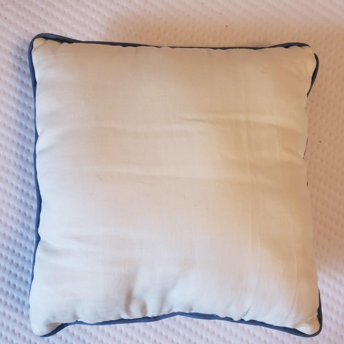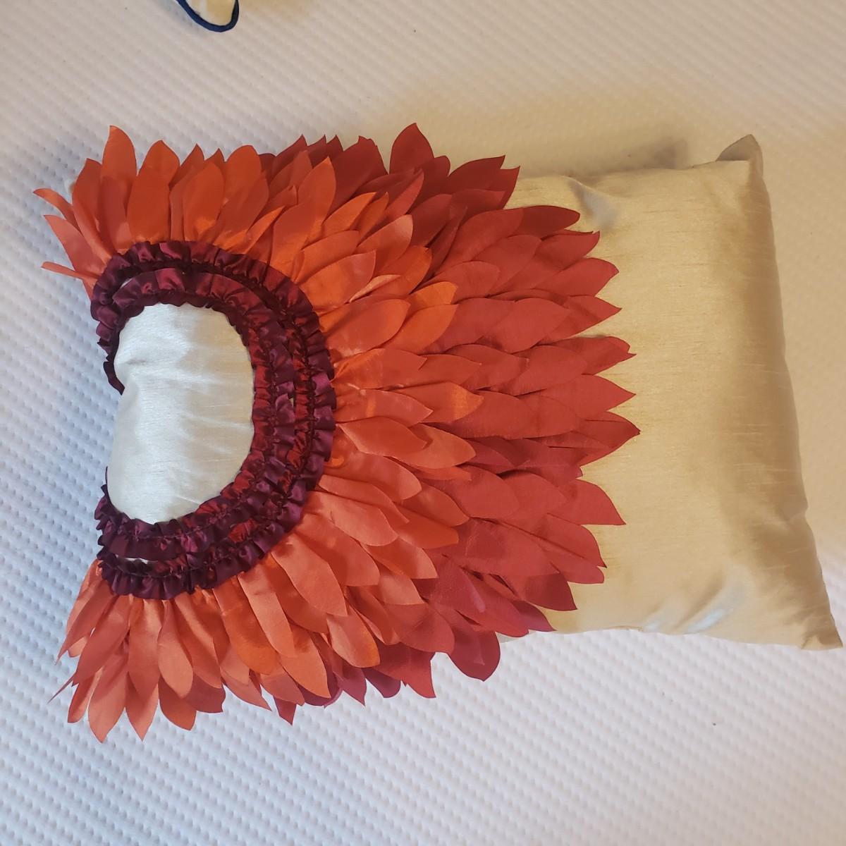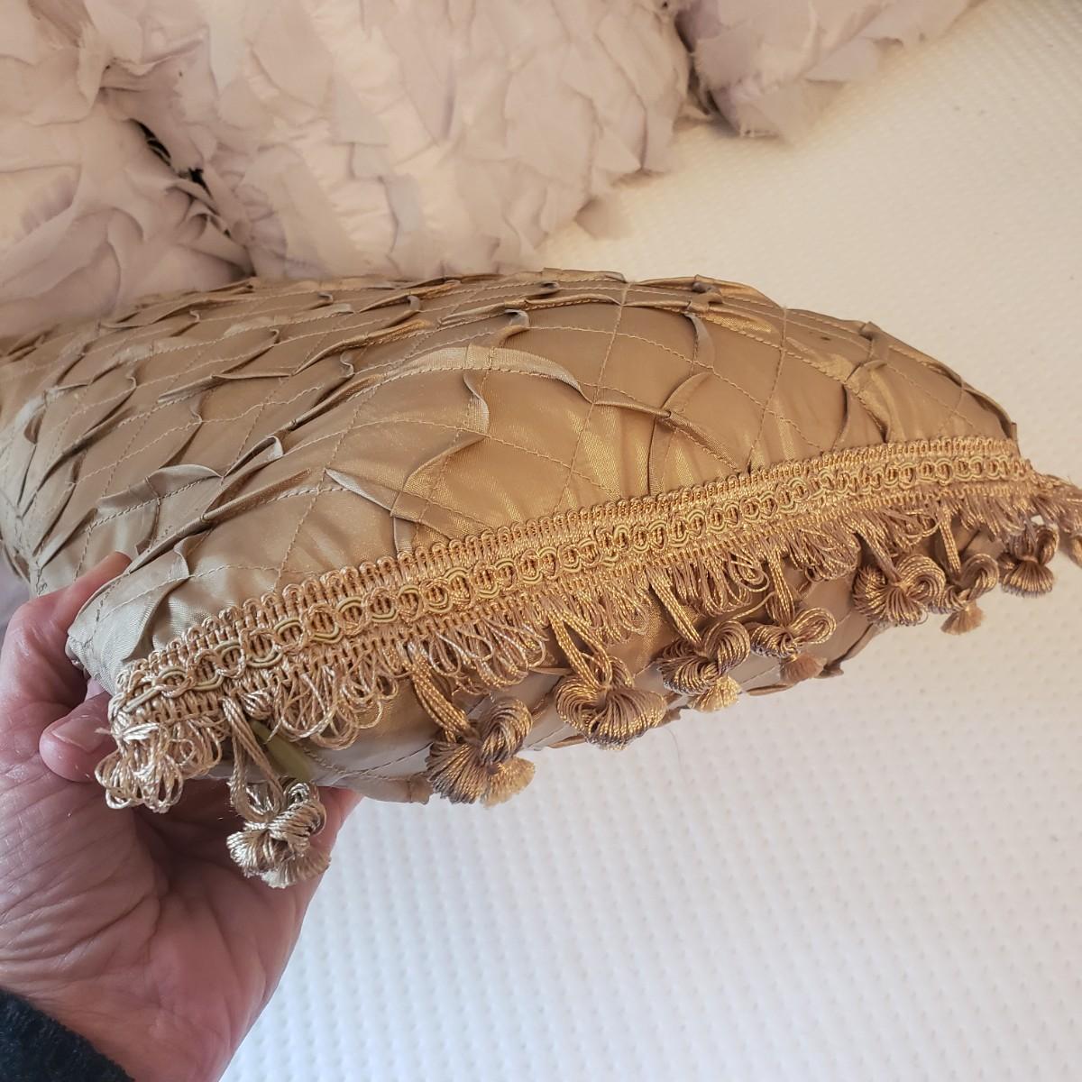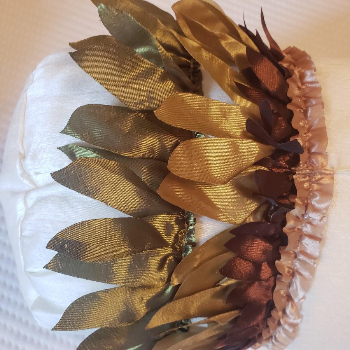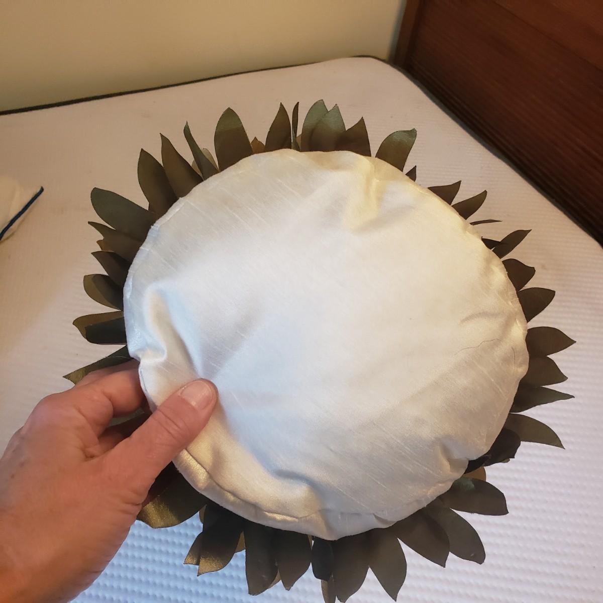 These twelve decorative pillows will brighten any room! The butterfly and turquoise pillows measure 15" x 15" and are a cotton blend with polyester ribbons. The three sunflower pillows are a thicker polyester. The Bloom Craft Home pillow is 70% silk and 30% polyester.