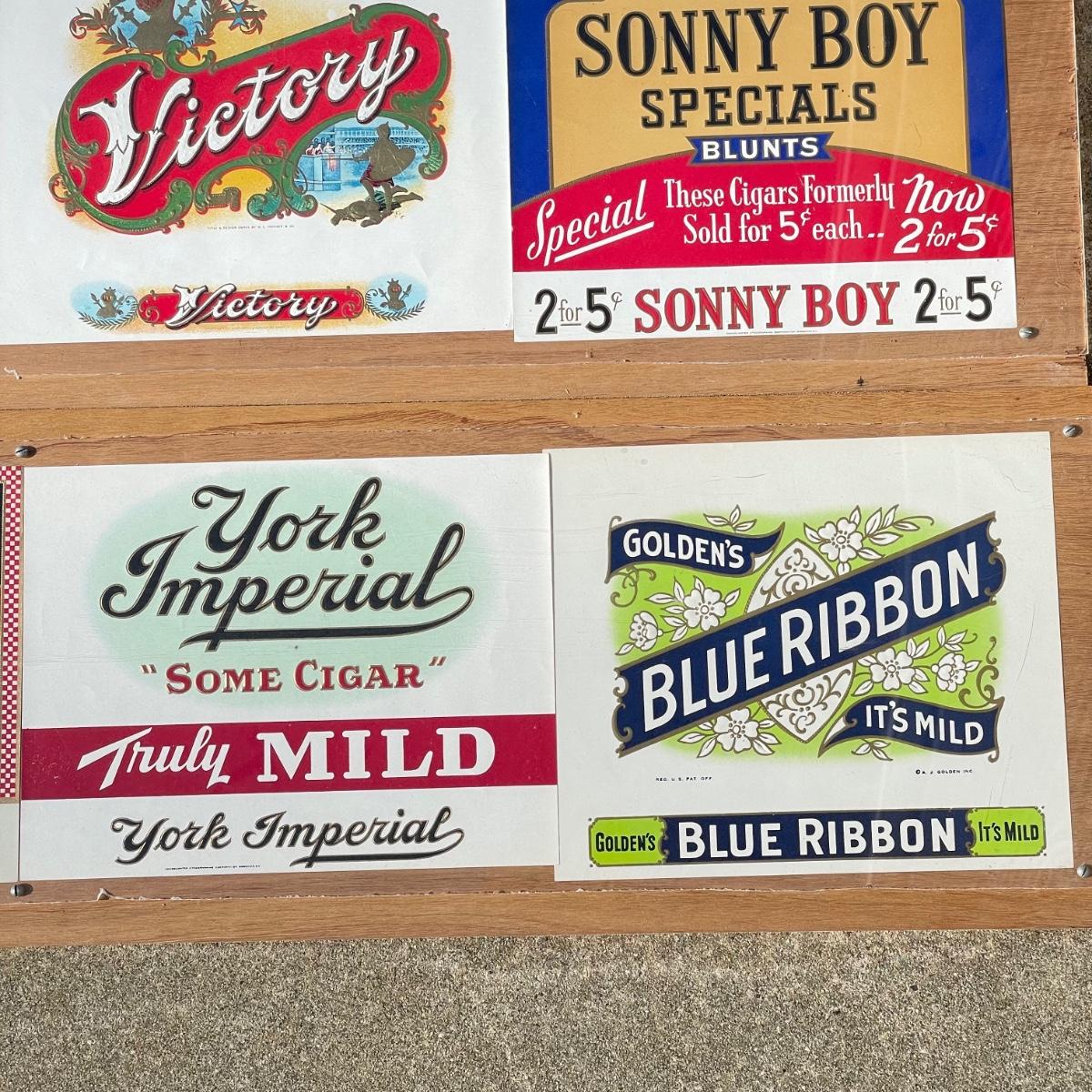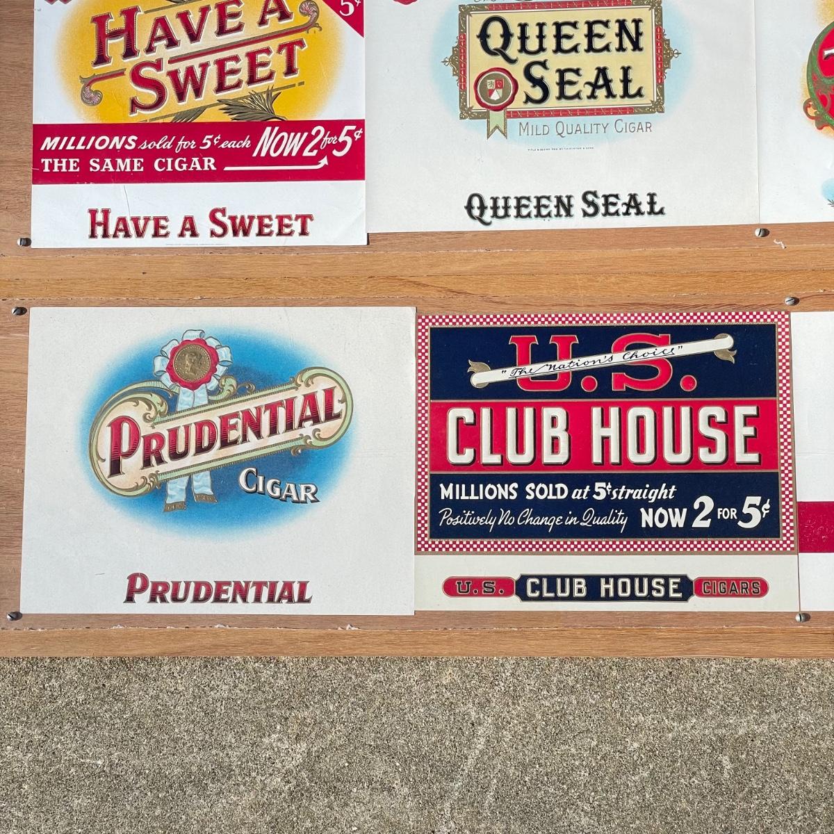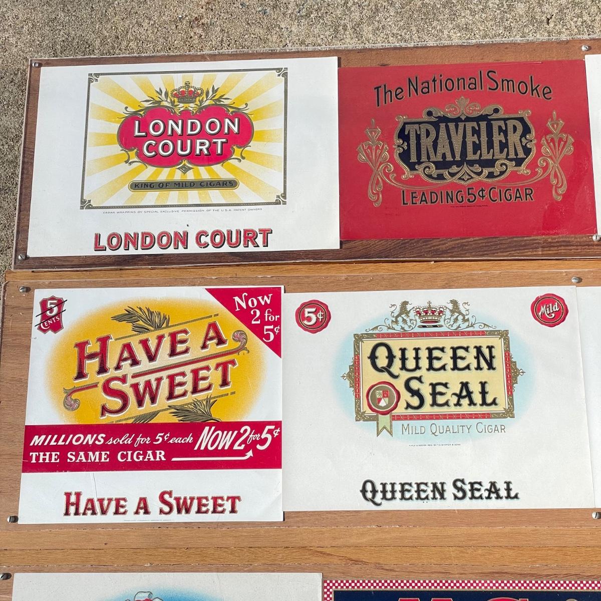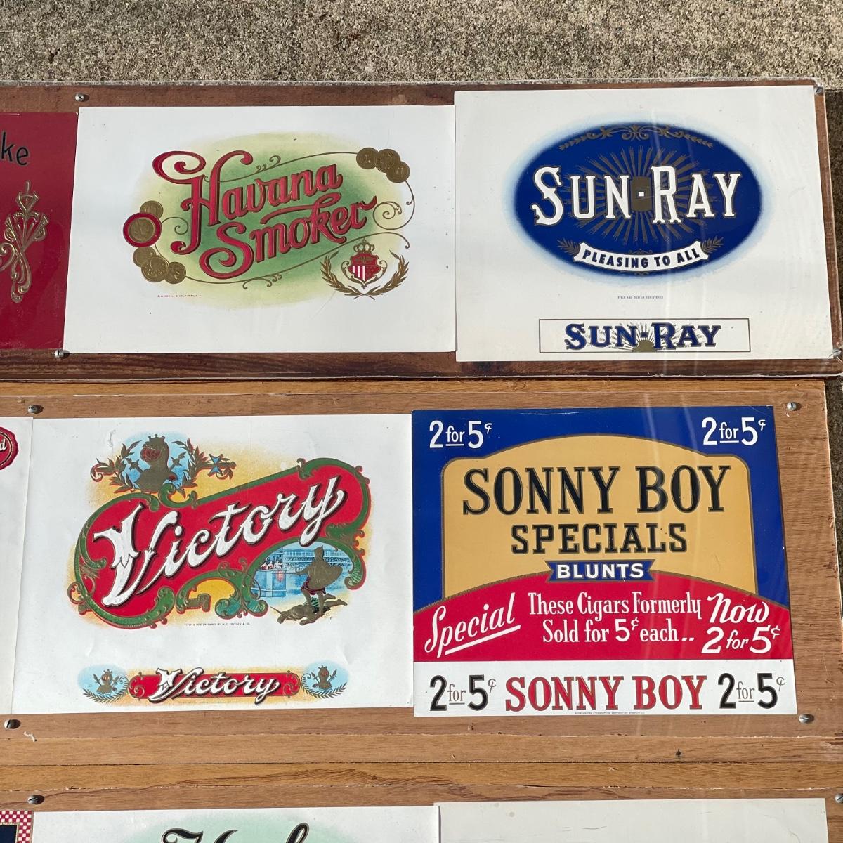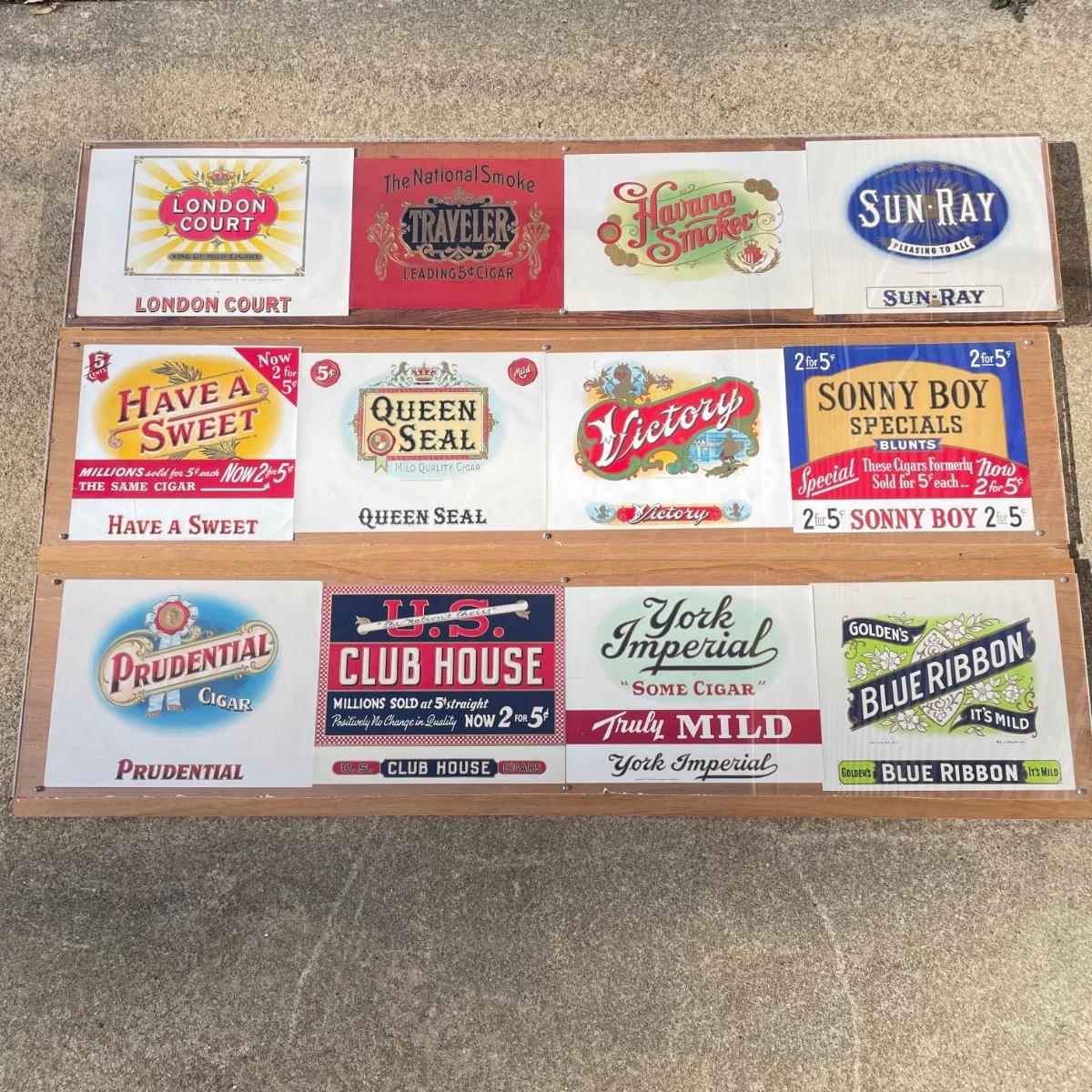 Twelve mounted cigar advertisements. These labels are places on wood backing and protected with plexiglass. Each label has golden accents and appears in amazing shape. Two measure 8.75” x 36” on thin pressed boards. The other is 7.5” x 36” on a .75” thick board. See images. Shipping available. Please call UPS with dimensions at 828-252-6930 for a shipping quote prior to bidding.