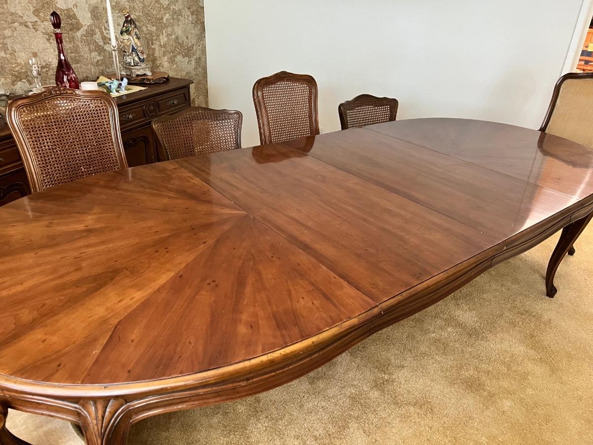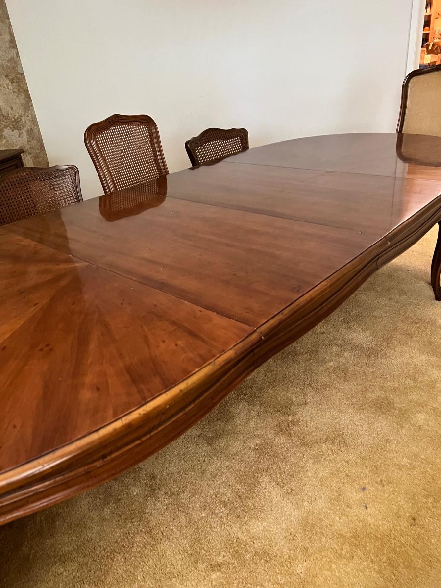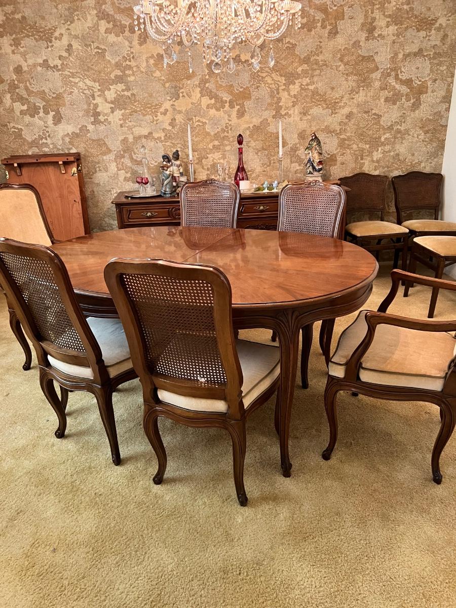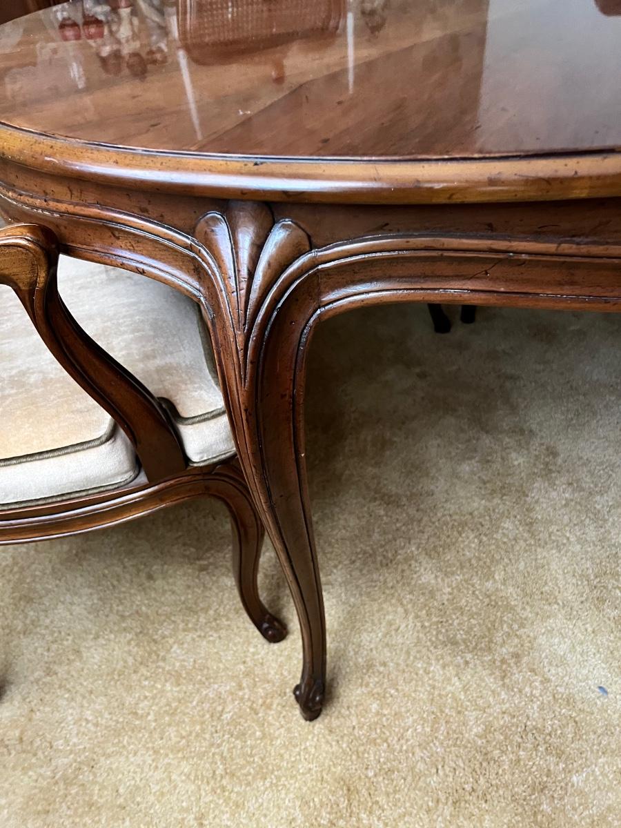 Herendon walnut table with natural finish French Louis the 16th style including hundred inch long oval table measurements include two leaves eight chairs. Leaves in able to table to go from a six seater to a 12 Seater. Reserve
