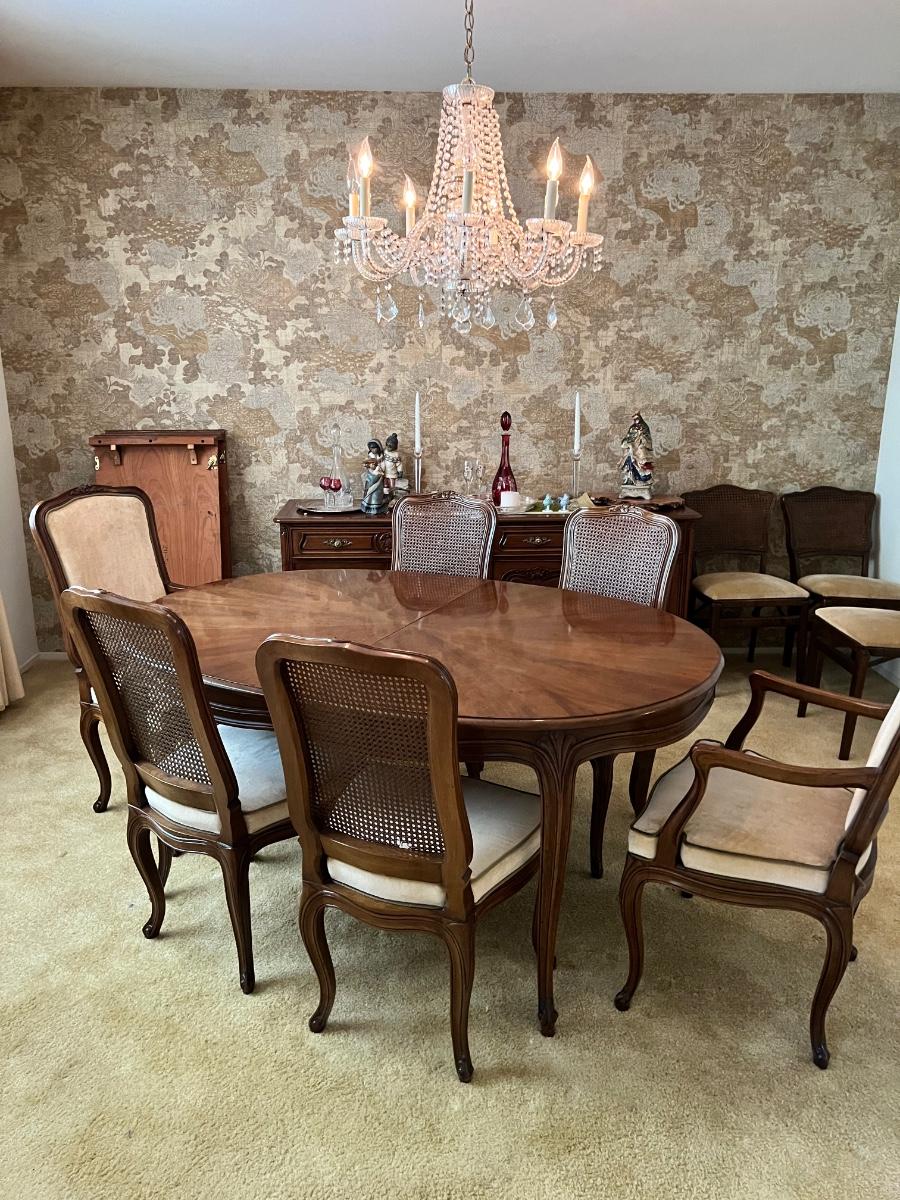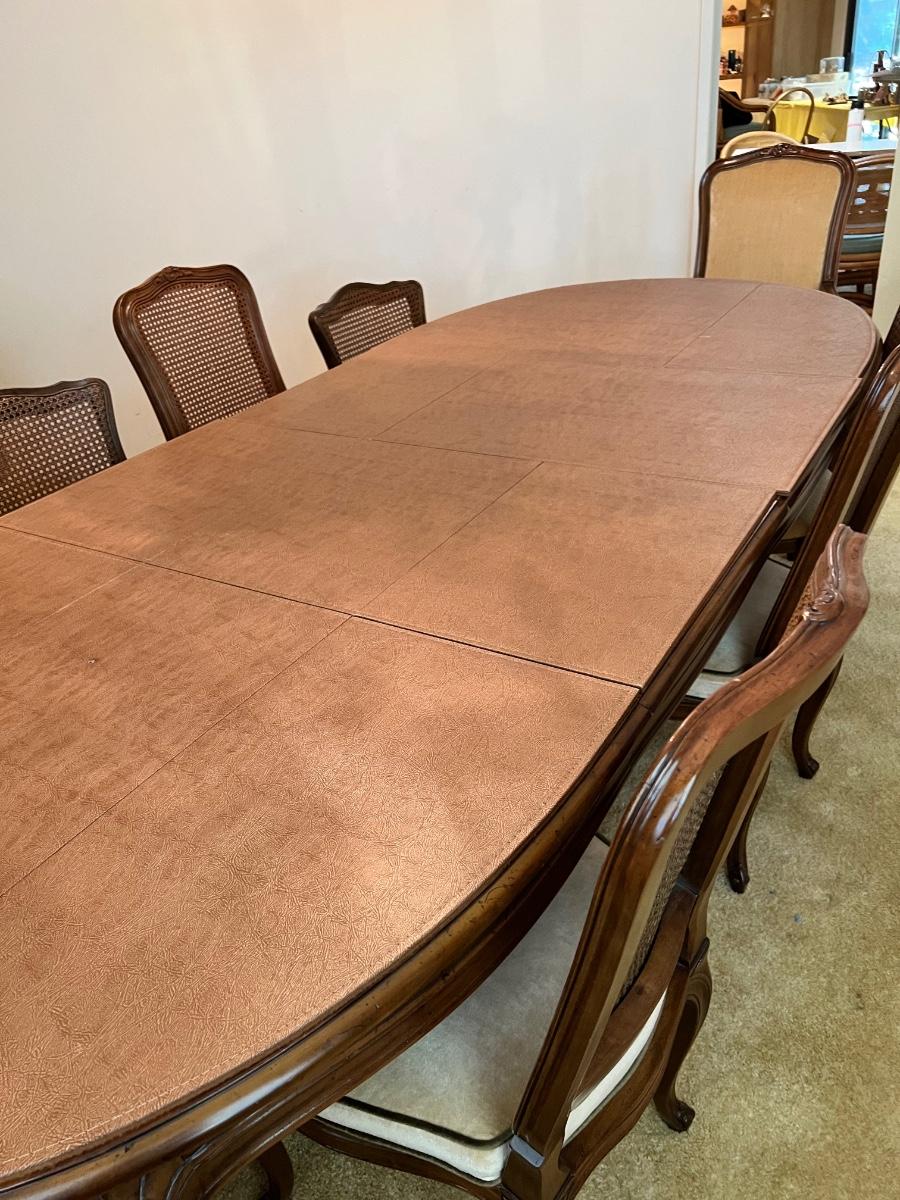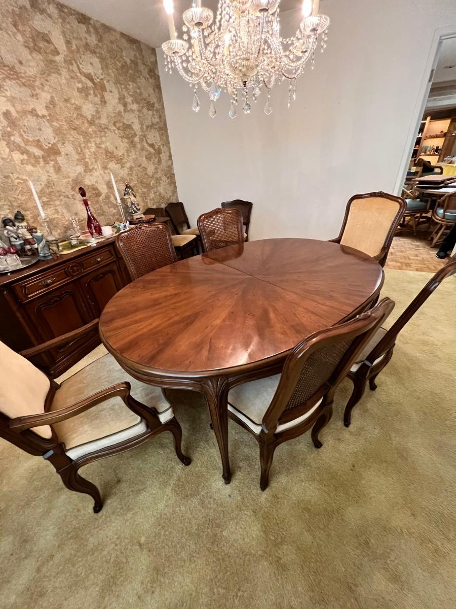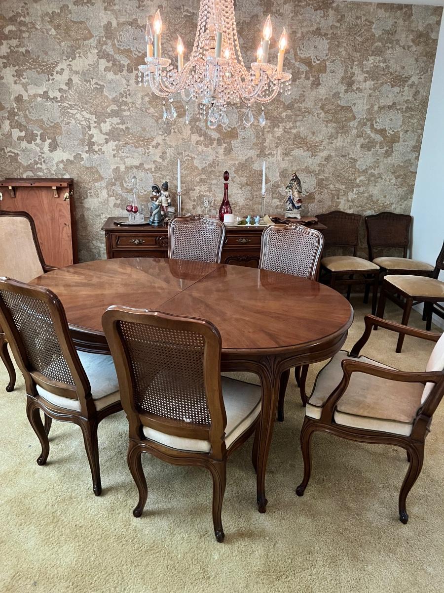 Herendon walnut table with natural finish French Louis the 16th style including hundred inch long oval table measurements include two leaves eight chairs. Leaves in able to table to go from a six seater to a 12 Seater. Reserve