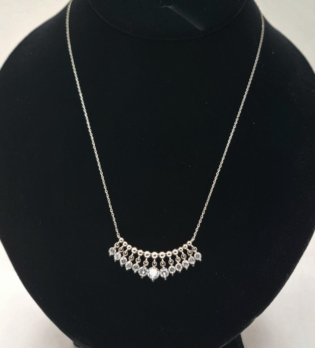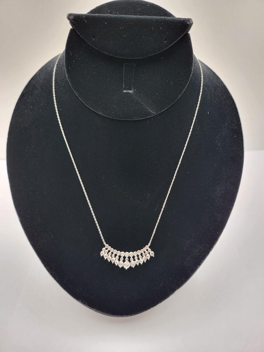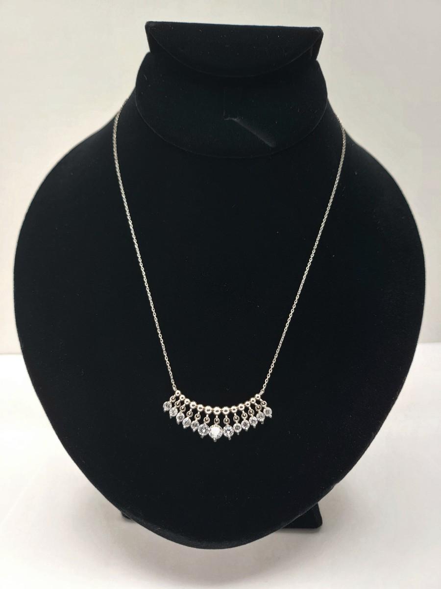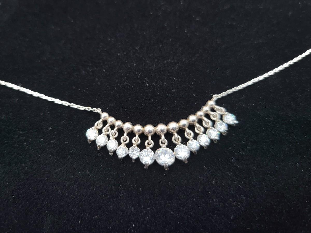 Add a touch of elegance to your ensemble with this vintage silver necklace. Twelve sparkly stones dangle from a beaded bar-style pendant on a 17" chain. The pendant is 1.5" long x .25" tall. Graduated CZ stones are open back to showcase their sparkle. Total weight 4.7 grams.