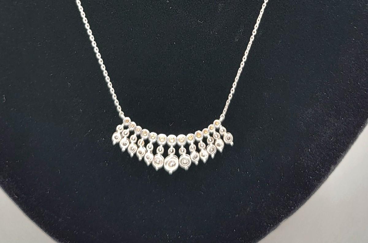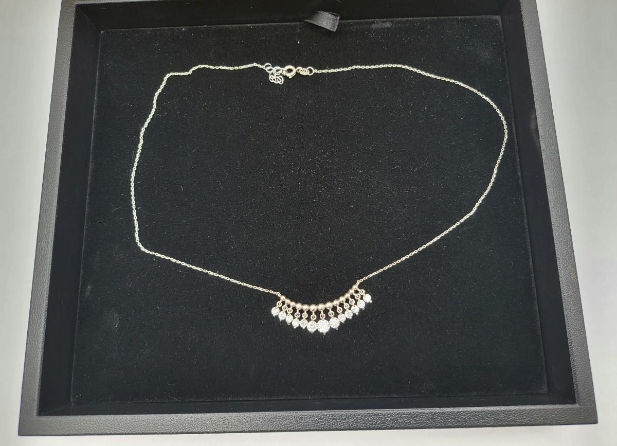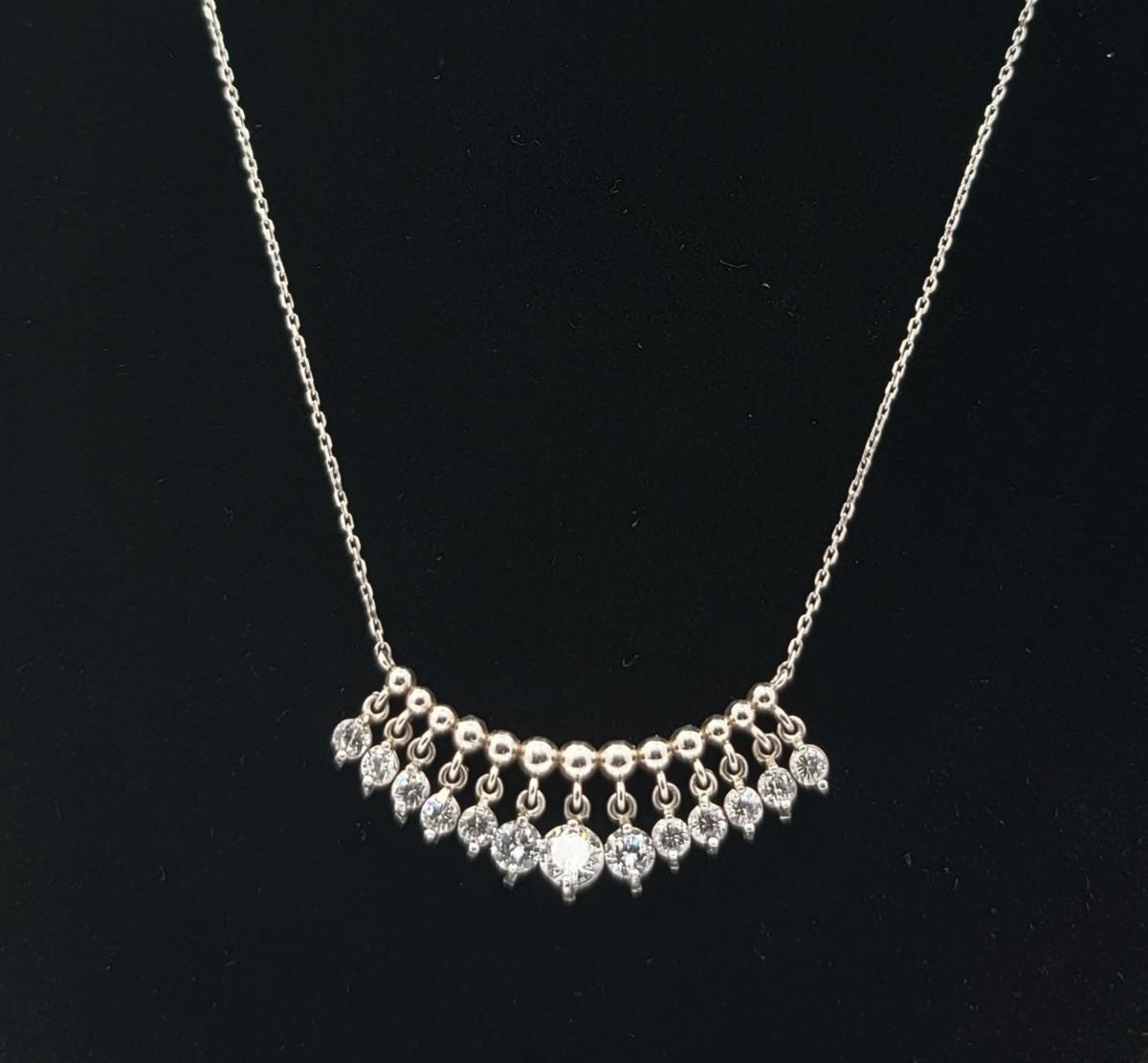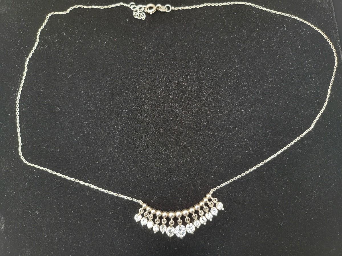 Add a touch of elegance to your ensemble with this vintage silver necklace. Twelve sparkly stones dangle from a beaded bar-style pendant on a 17" chain. The pendant is 1.5" long x .25" tall. Graduated CZ stones are open back to showcase their sparkle. Total weight 4.7 grams.