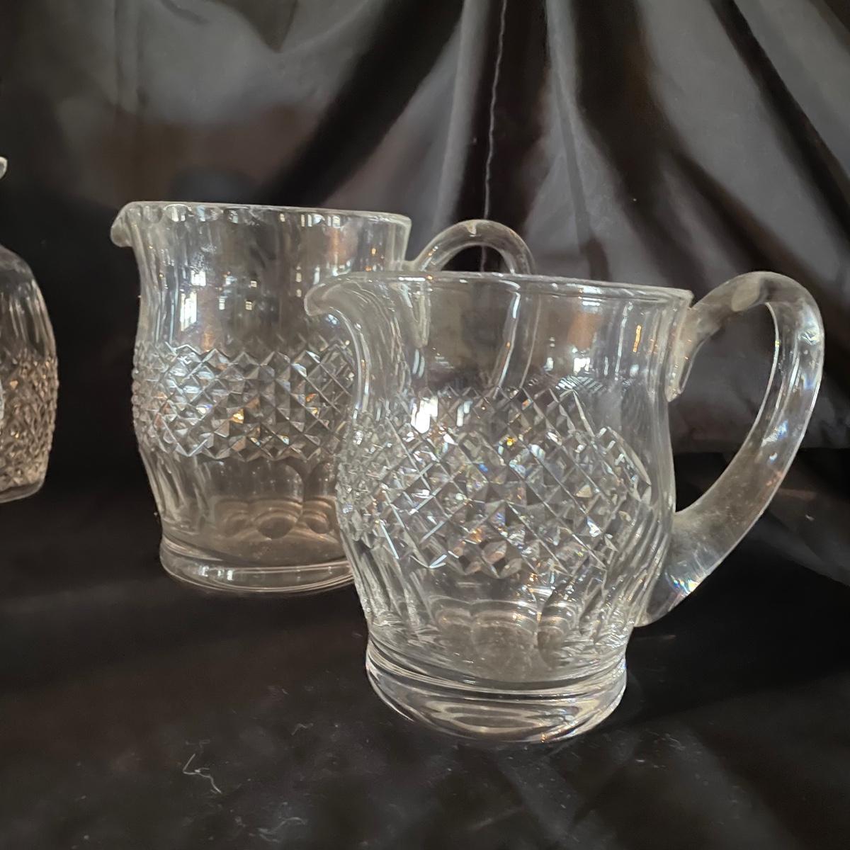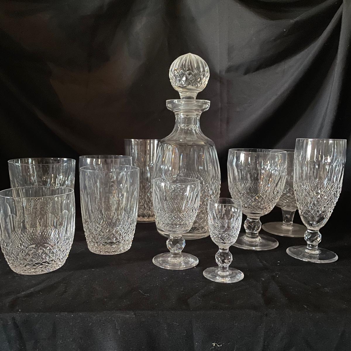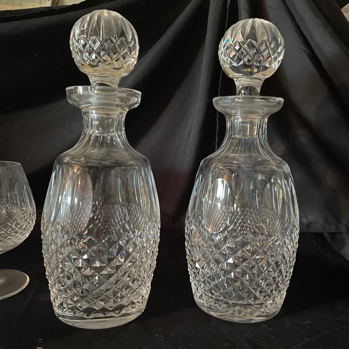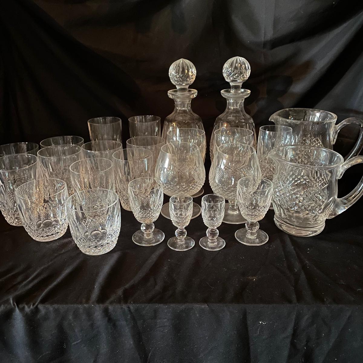 All twenty five pieces bear the Waterford mark. Two decanters along with two pitchers and a variety of glasses from sherry to water make up this matching set. This set is in great condition, just a little dust that currently dulls the glass in some images.