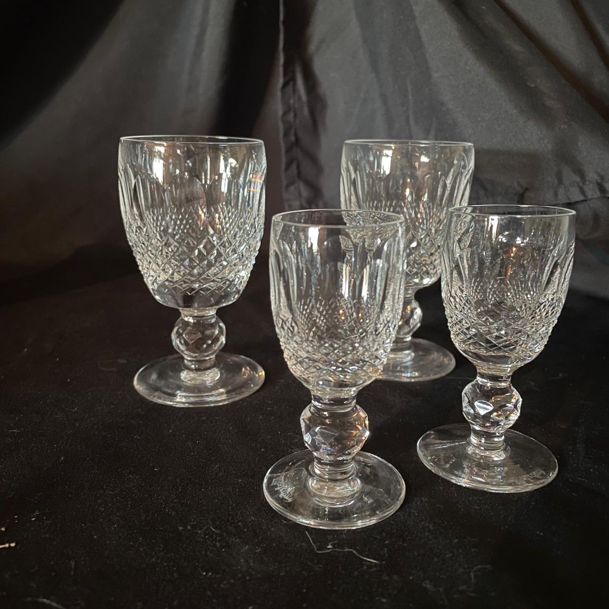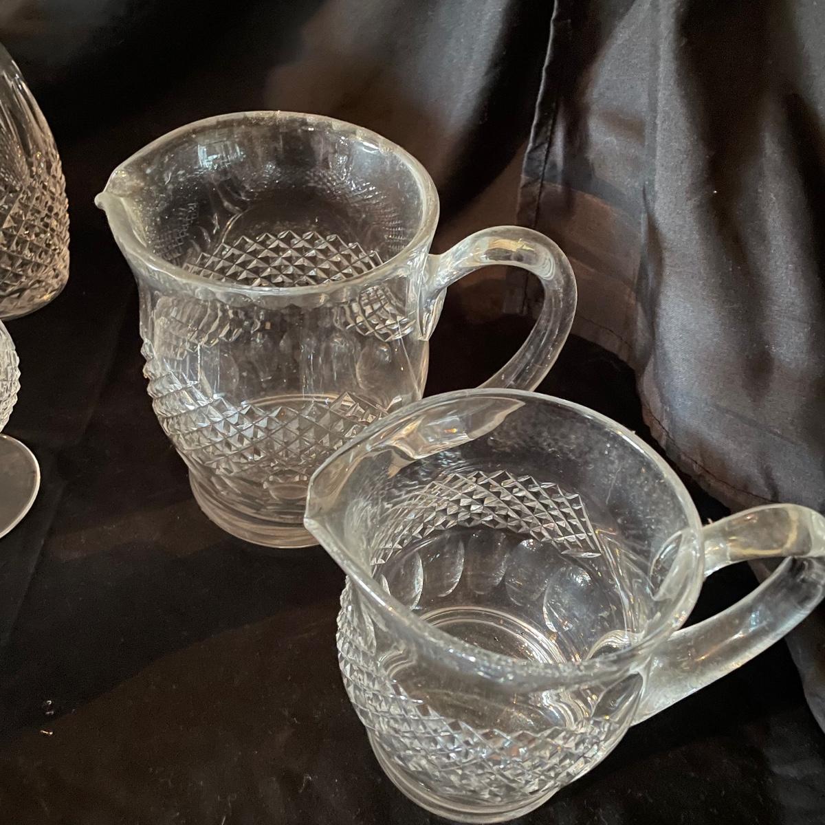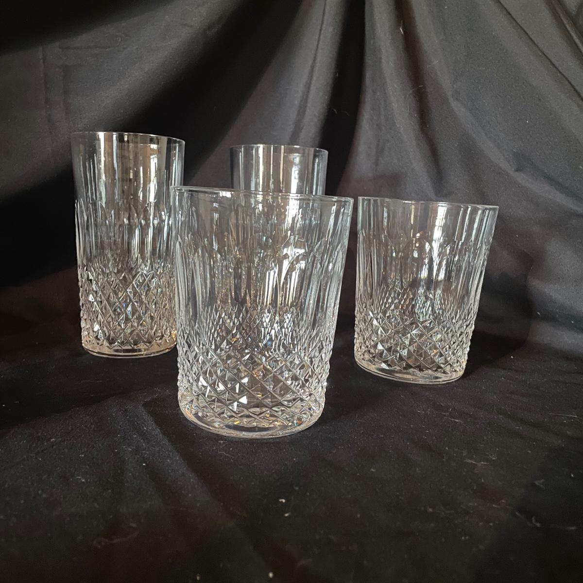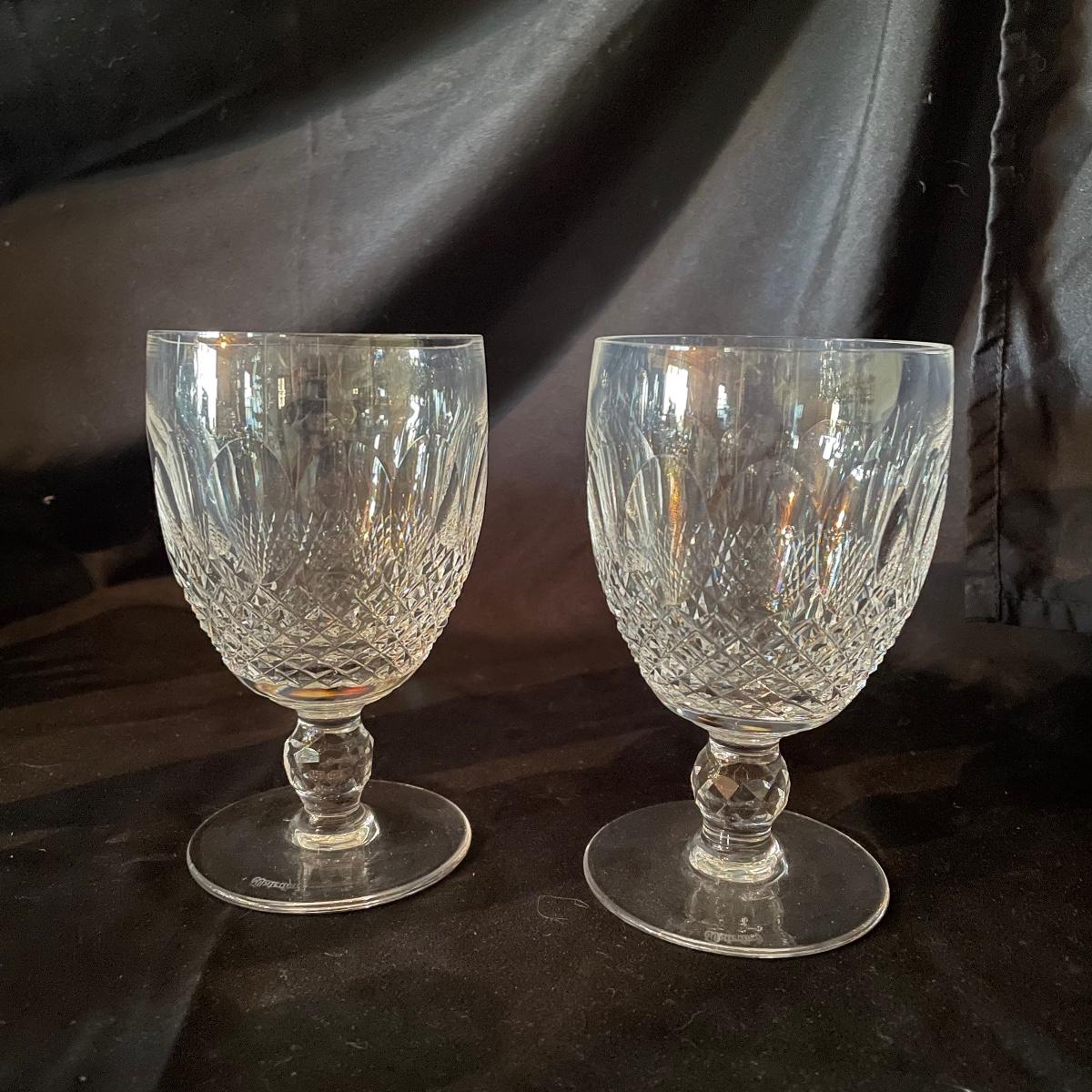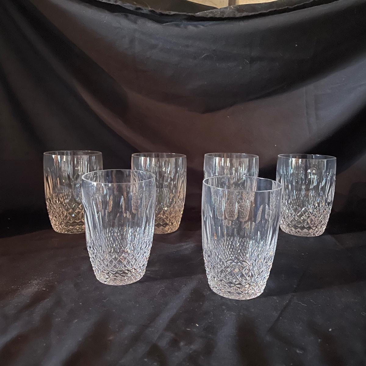 All twenty five pieces bear the Waterford mark. Two decanters along with two pitchers and a variety of glasses from sherry to water make up this matching set. This set is in great condition, just a little dust that currently dulls the glass in some images.
