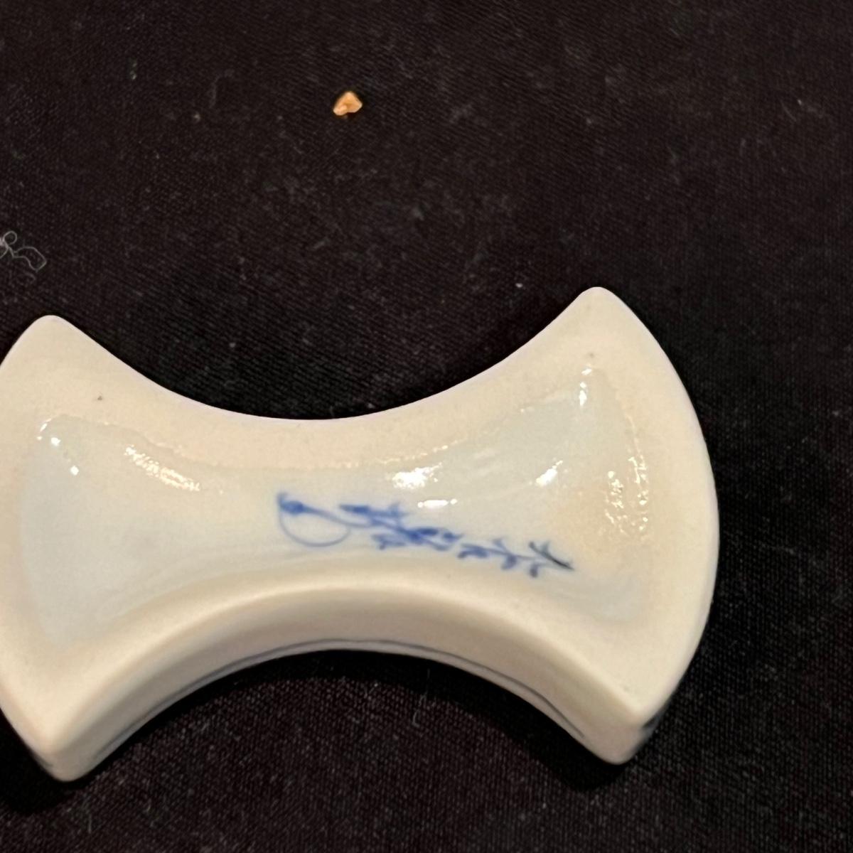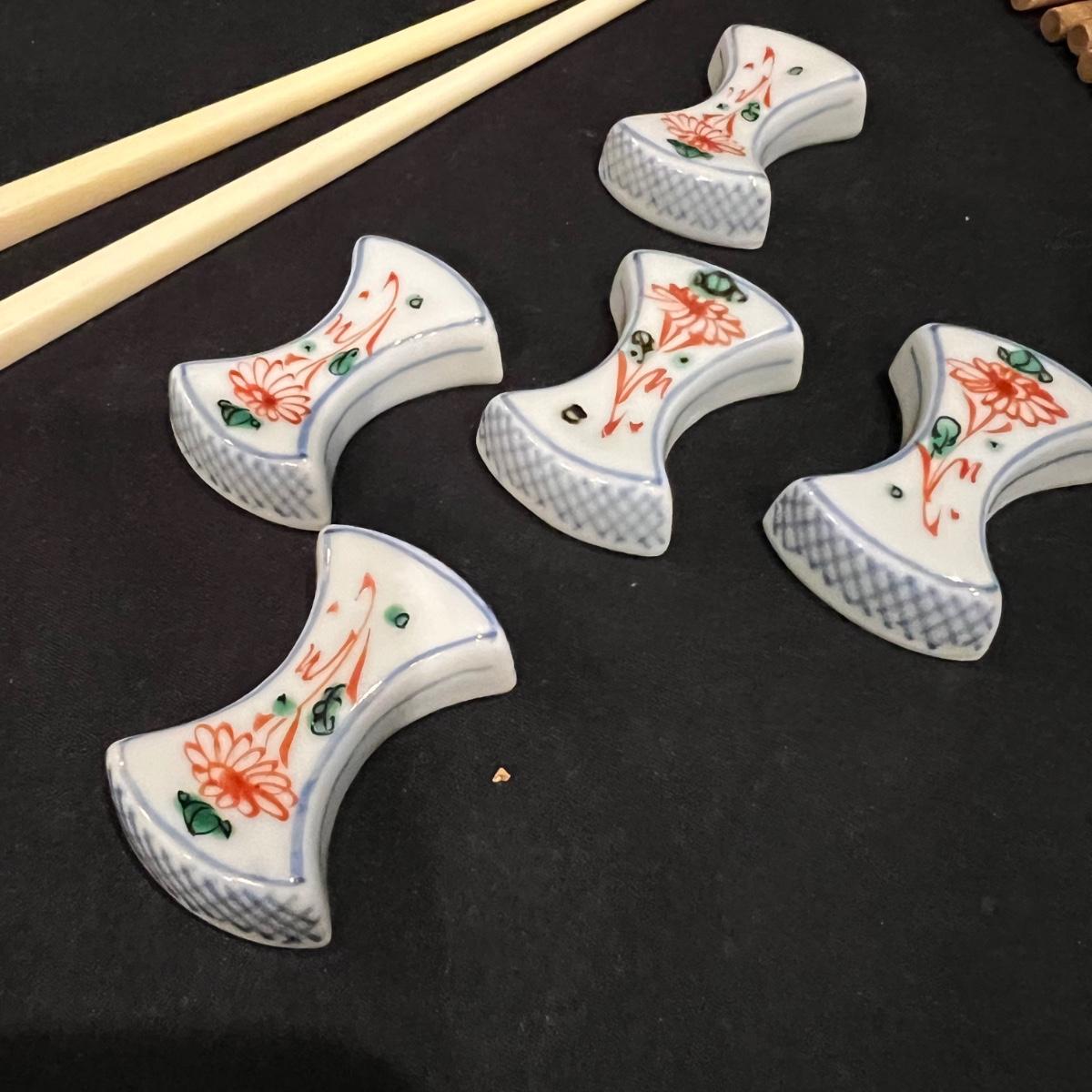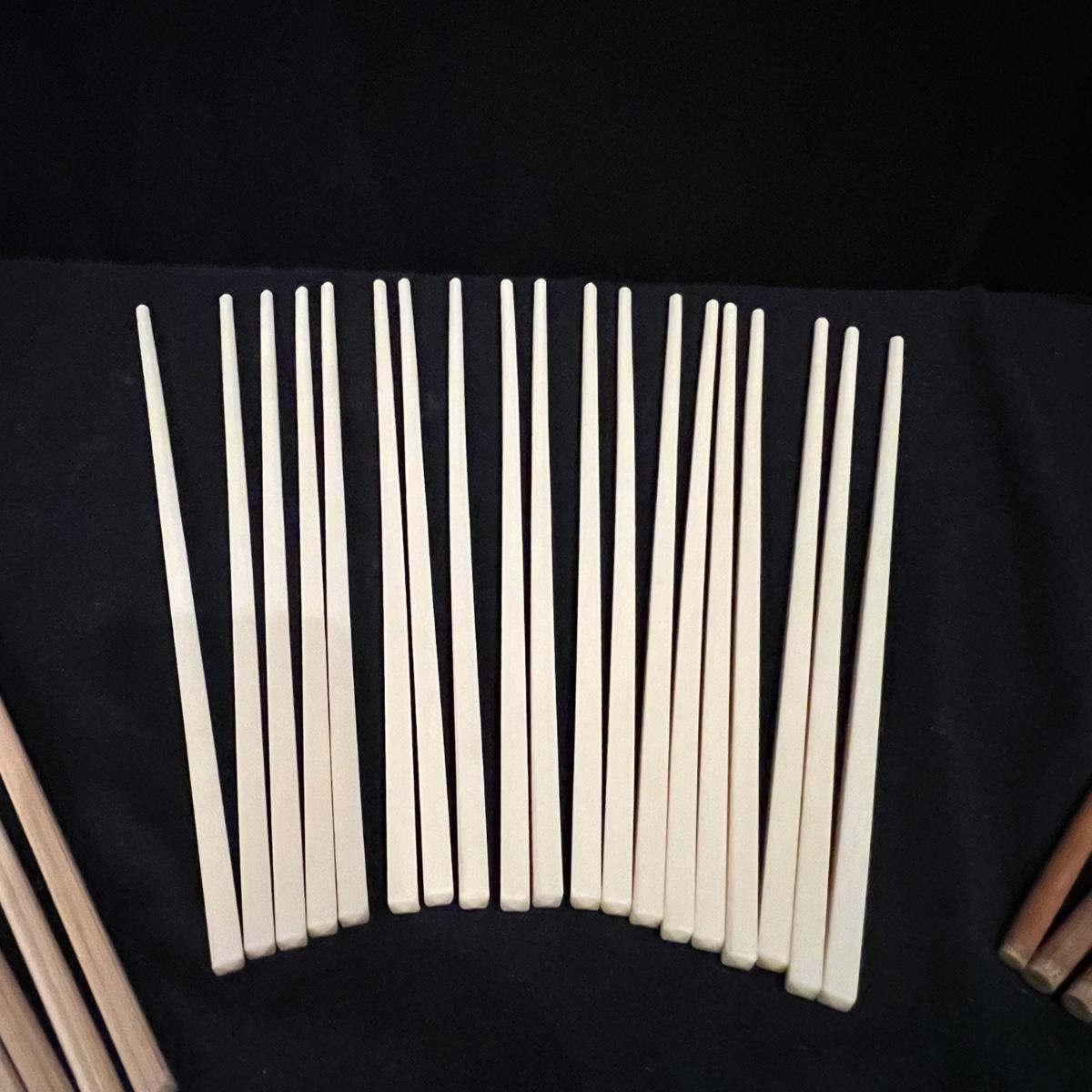 Three large sets of chopsticks includes two sets that are wood, the other set is plastic. Two more individual pairs included as well as five porcelain chopstick holders; they measure 1” x 2” x 0.5🔔H.