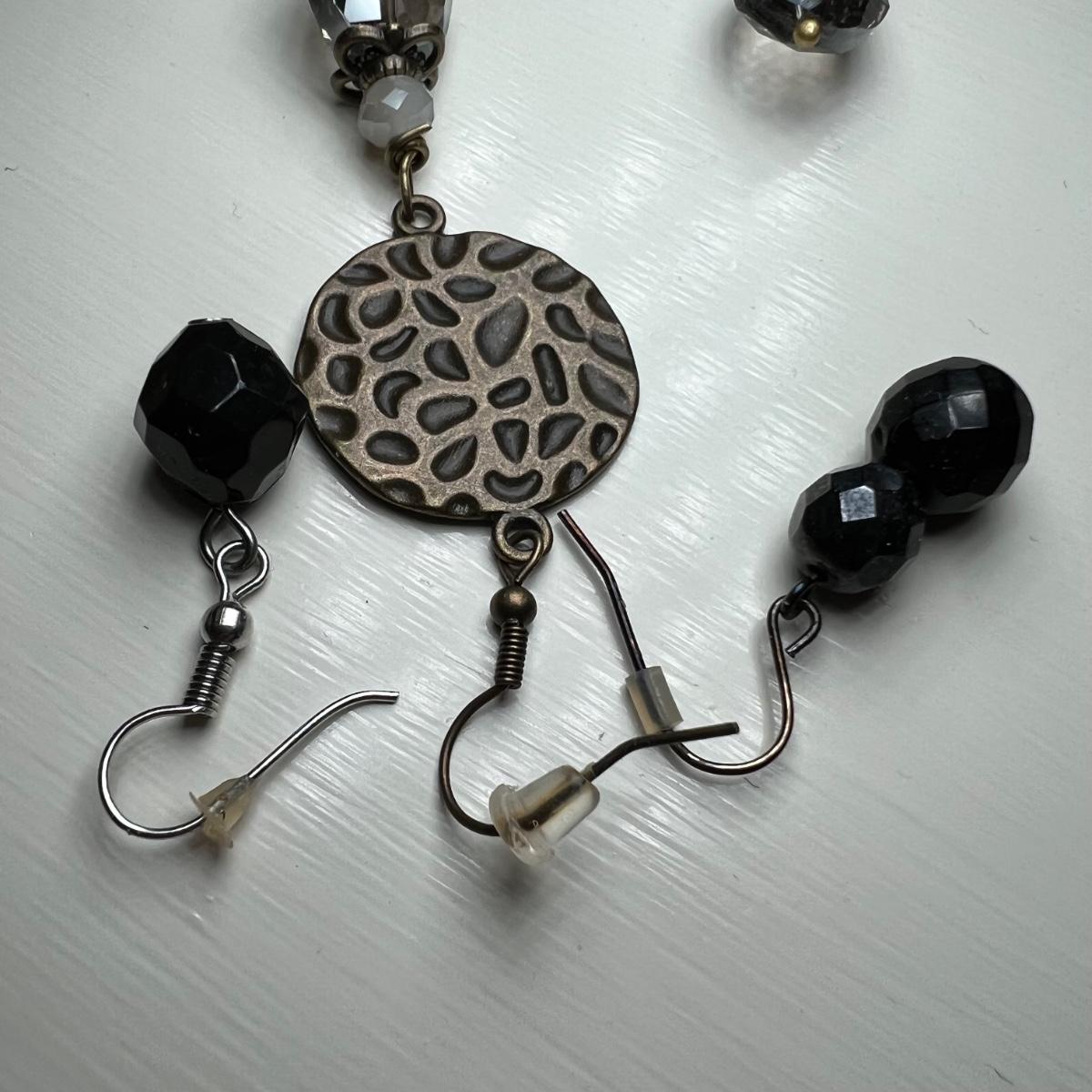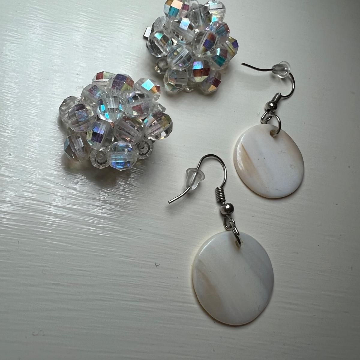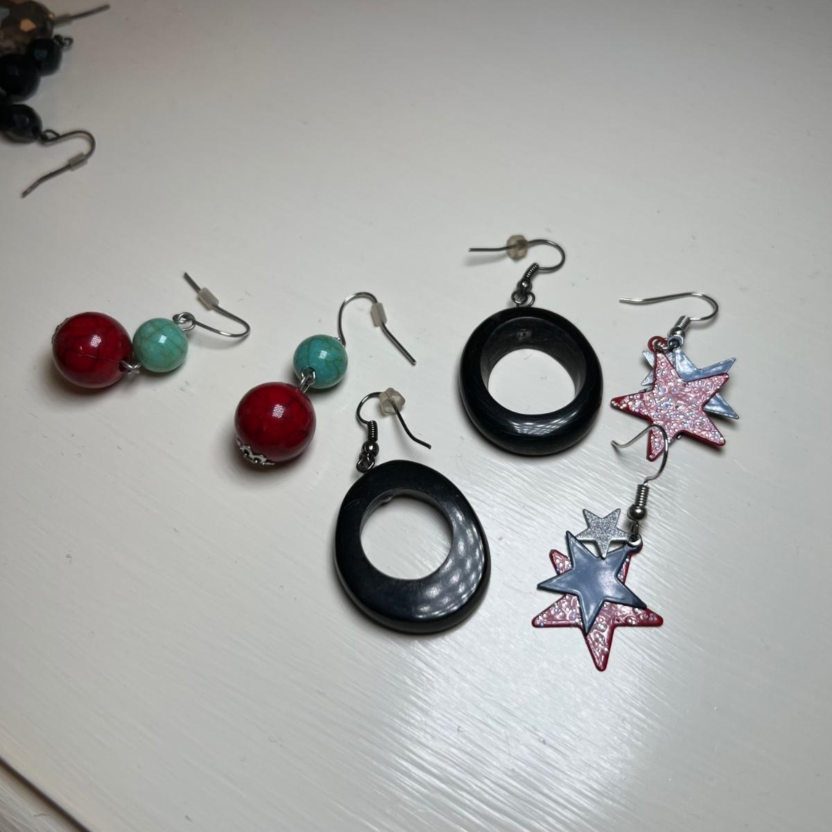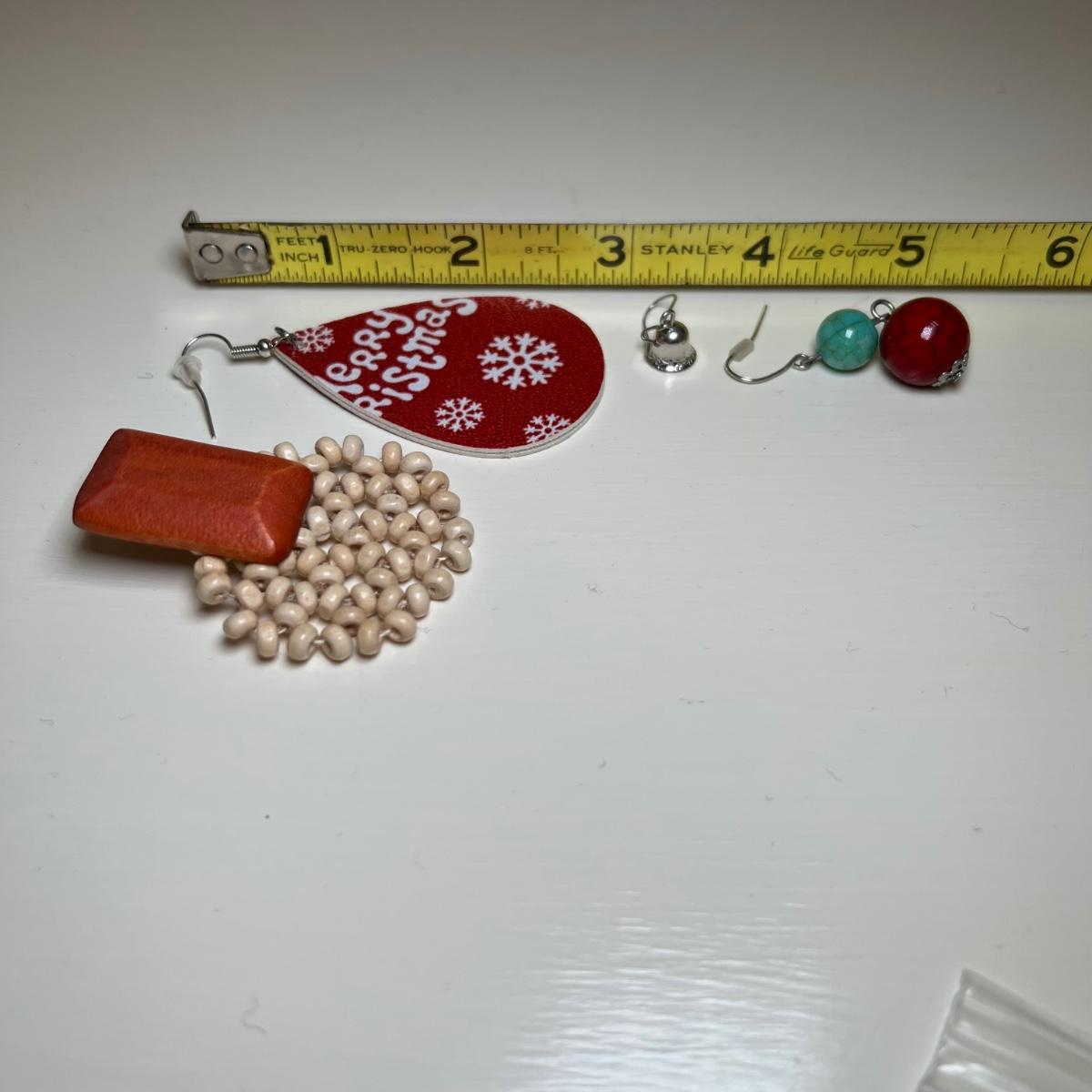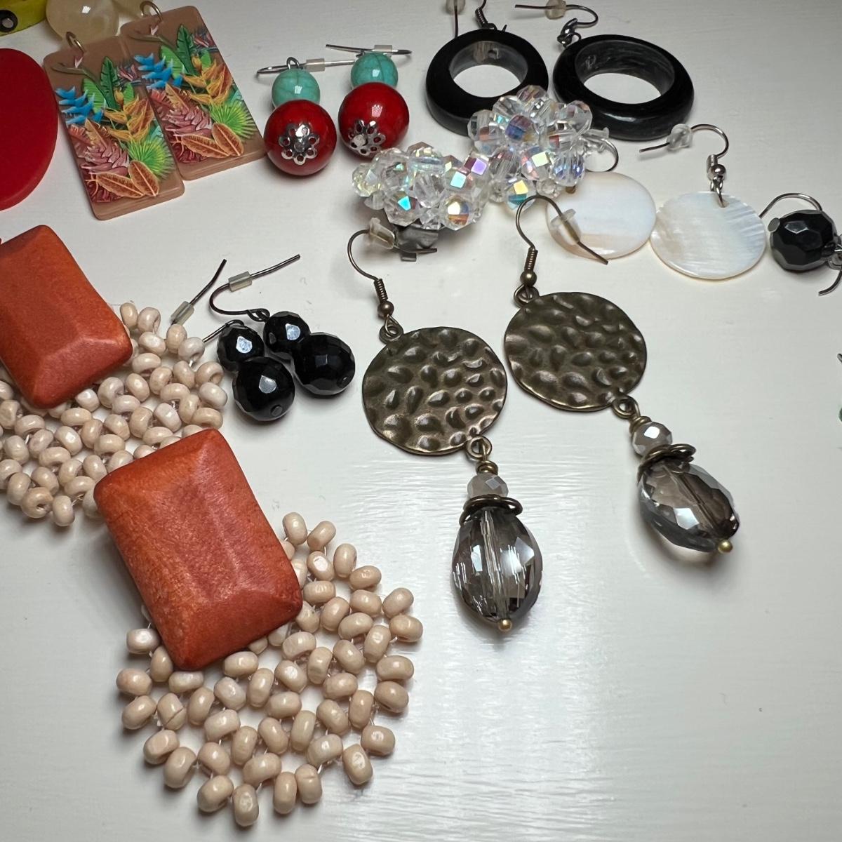 All but one of these twenty plus earrings are for pierced ears. The glass like flower earrings are the clip-on pair. A handful of the pairs are Xmas themed, the rest are a mix of colors and materials. A small bag of earring backs are included.