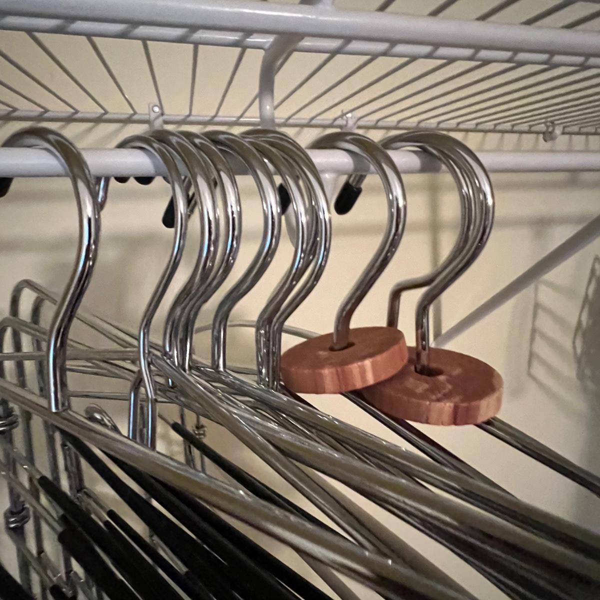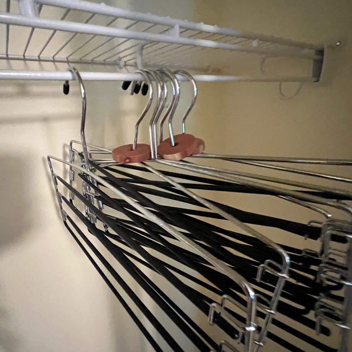 Great space saving metal hangers in this lot of 20 plus. Includes four and five pants to a hanger plus shirt hangers and a belt hanger. Lot also includes cedar blocks and rings.