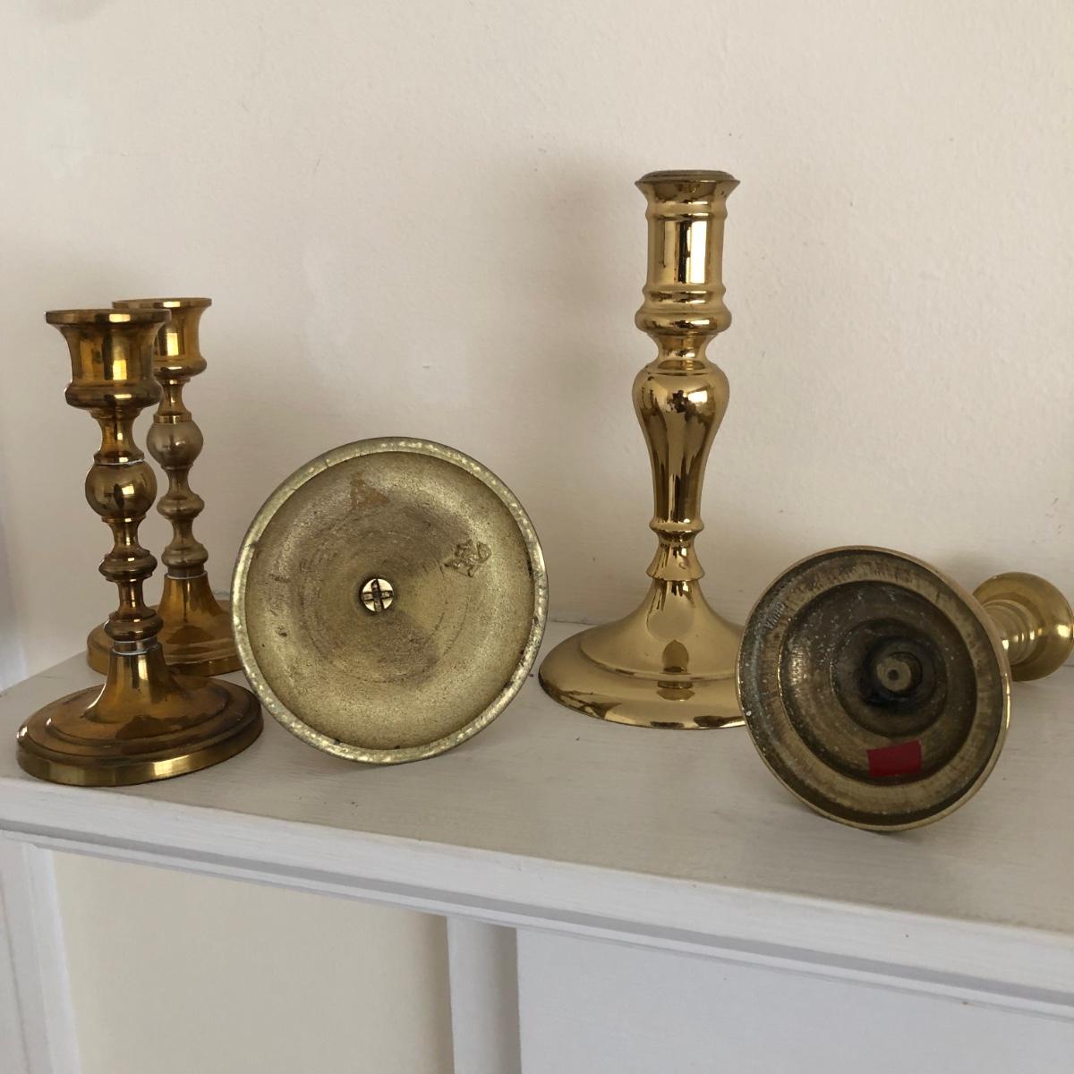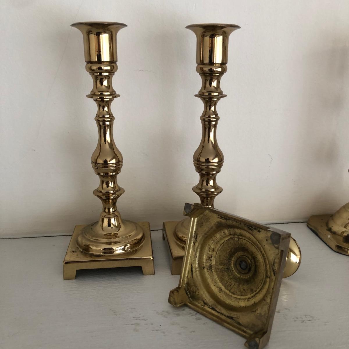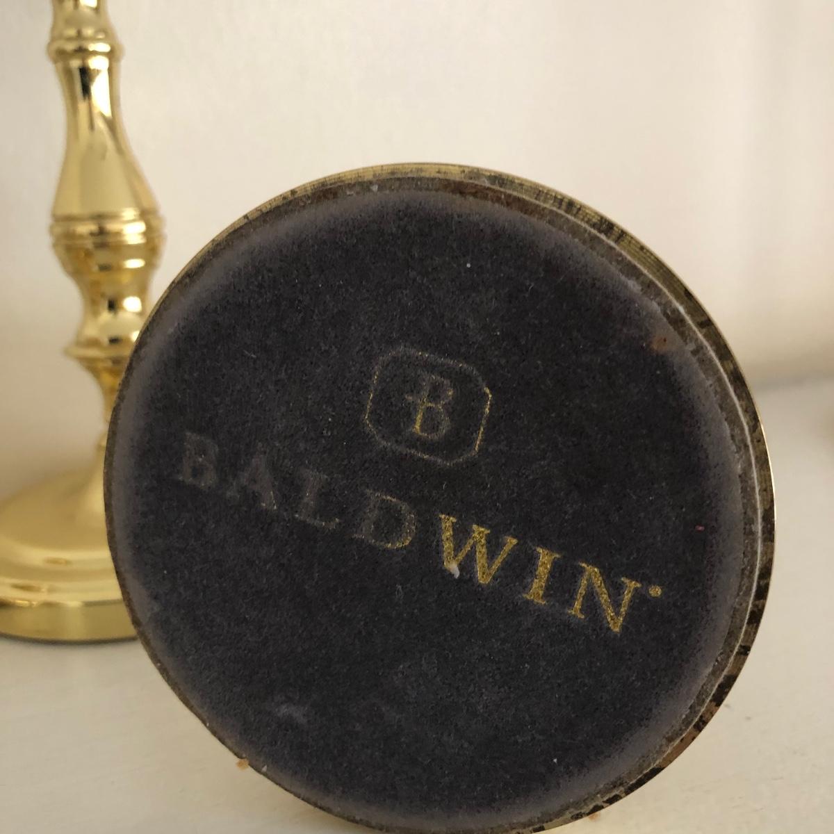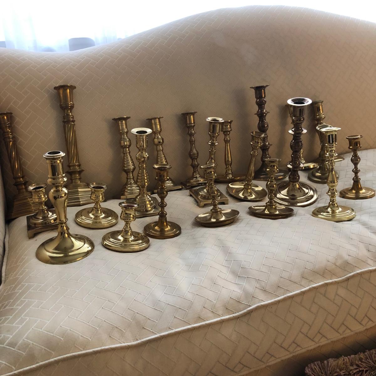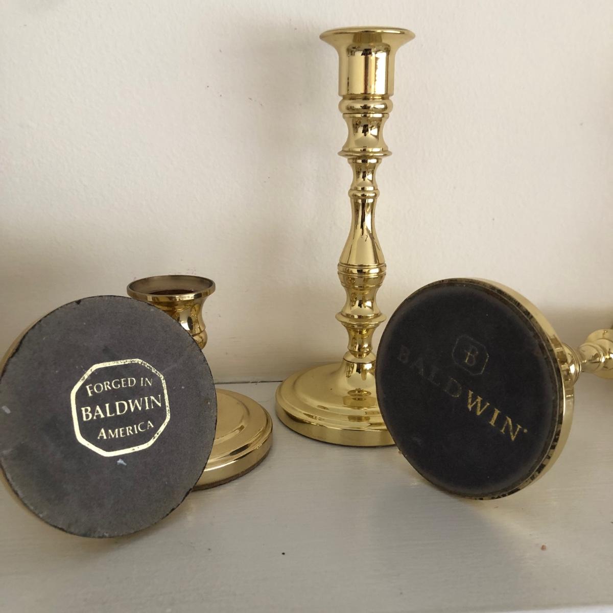 In this lot of twenty-three brass candlesticks, there are six with square bases, two candlesticks with octagonal bases, and fifteen candlesticks with round bases. The tallest candlesticks measure 10.5” tall and the shortest 3.5”. Note the four Baldwin and two Carolina Brass candlesticks. Local pick up only.