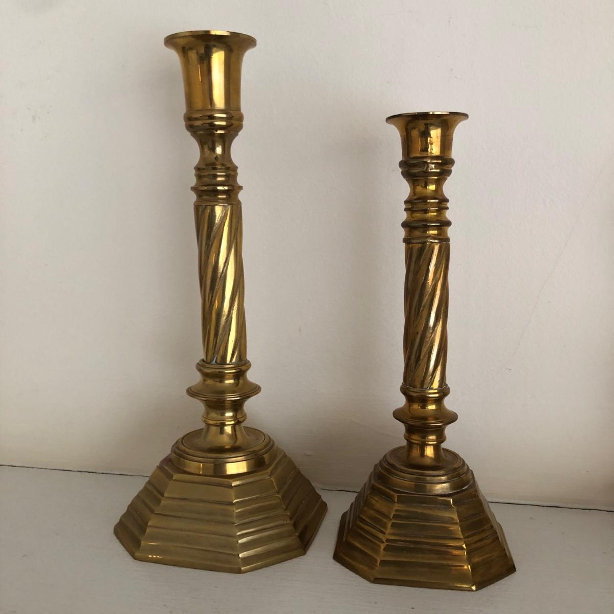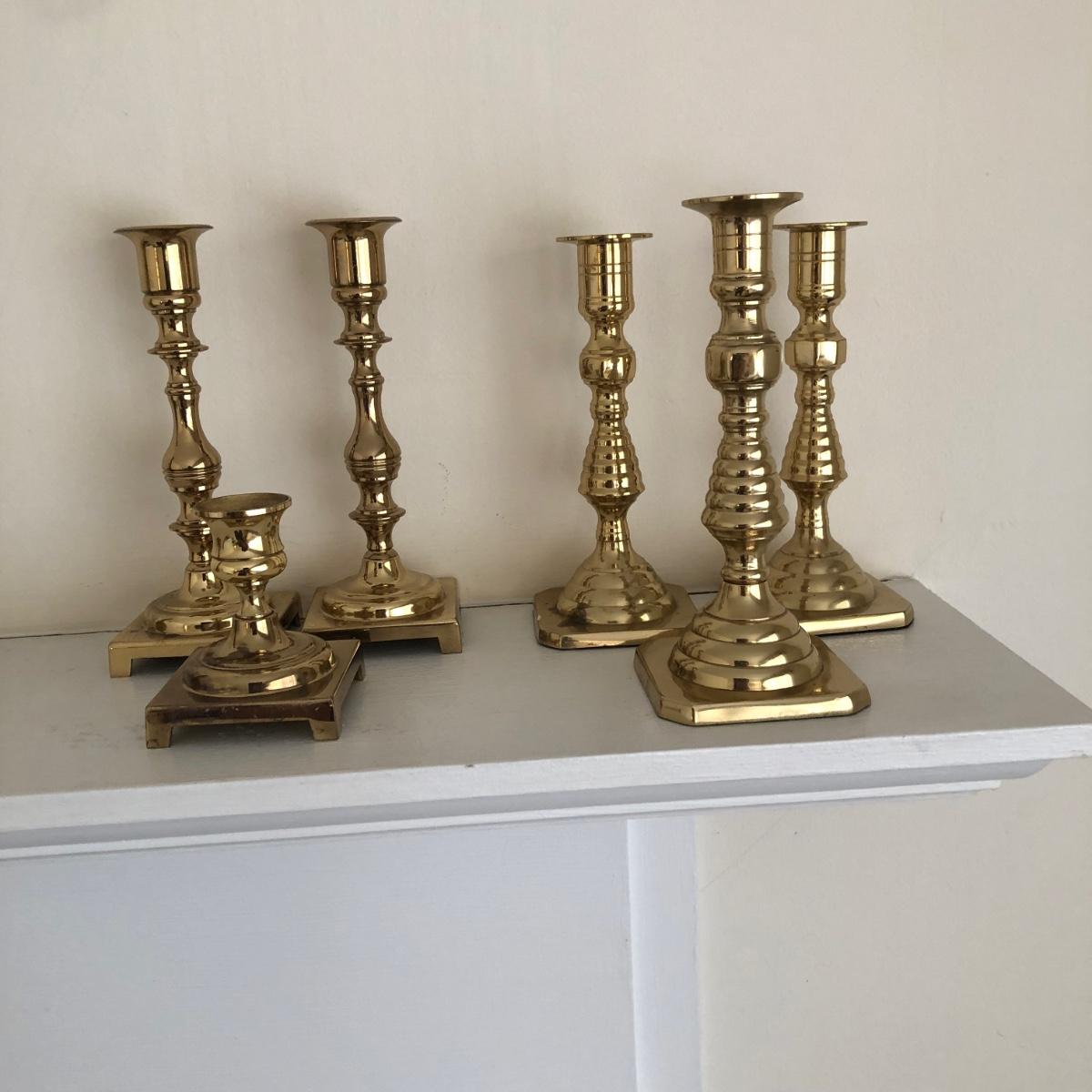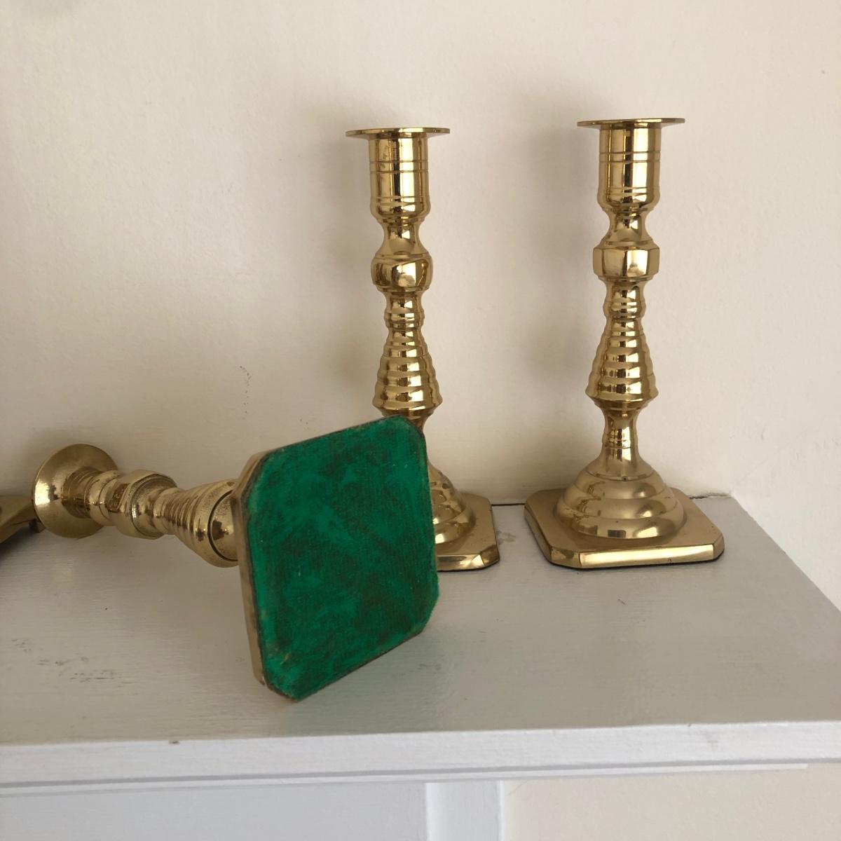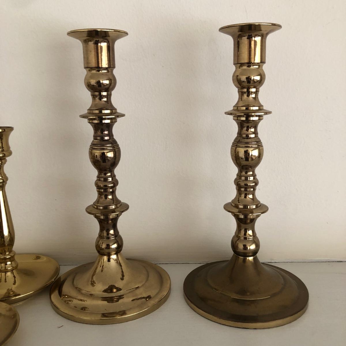 In this lot of twenty-three brass candlesticks, there are six with square bases, two candlesticks with octagonal bases, and fifteen candlesticks with round bases. The tallest candlesticks measure 10.5” tall and the shortest 3.5”. Note the four Baldwin and two Carolina Brass candlesticks. Local pick up only.