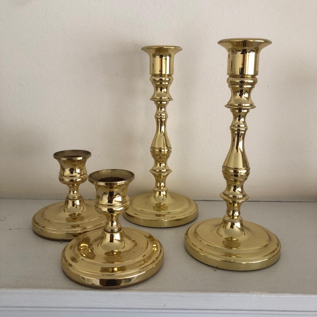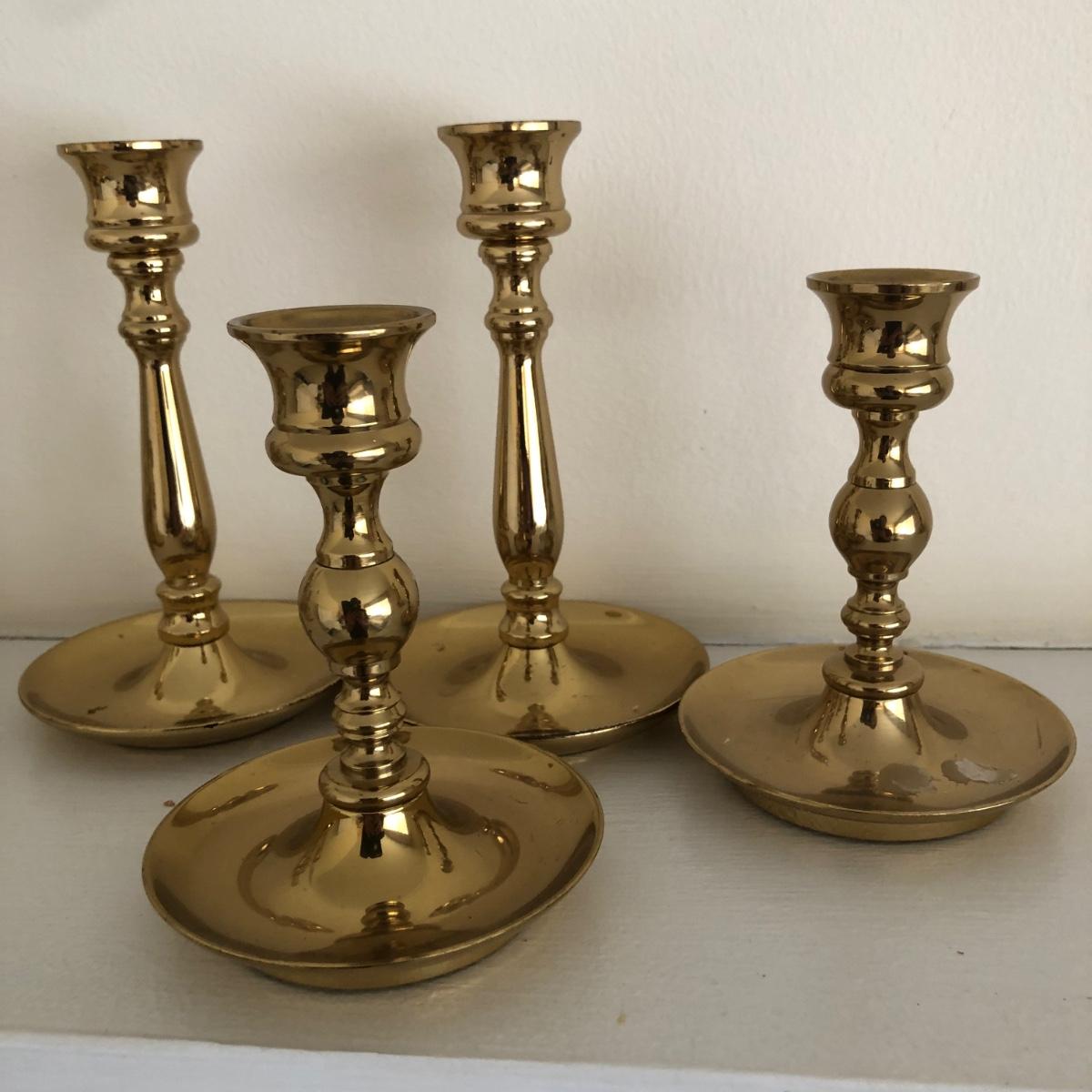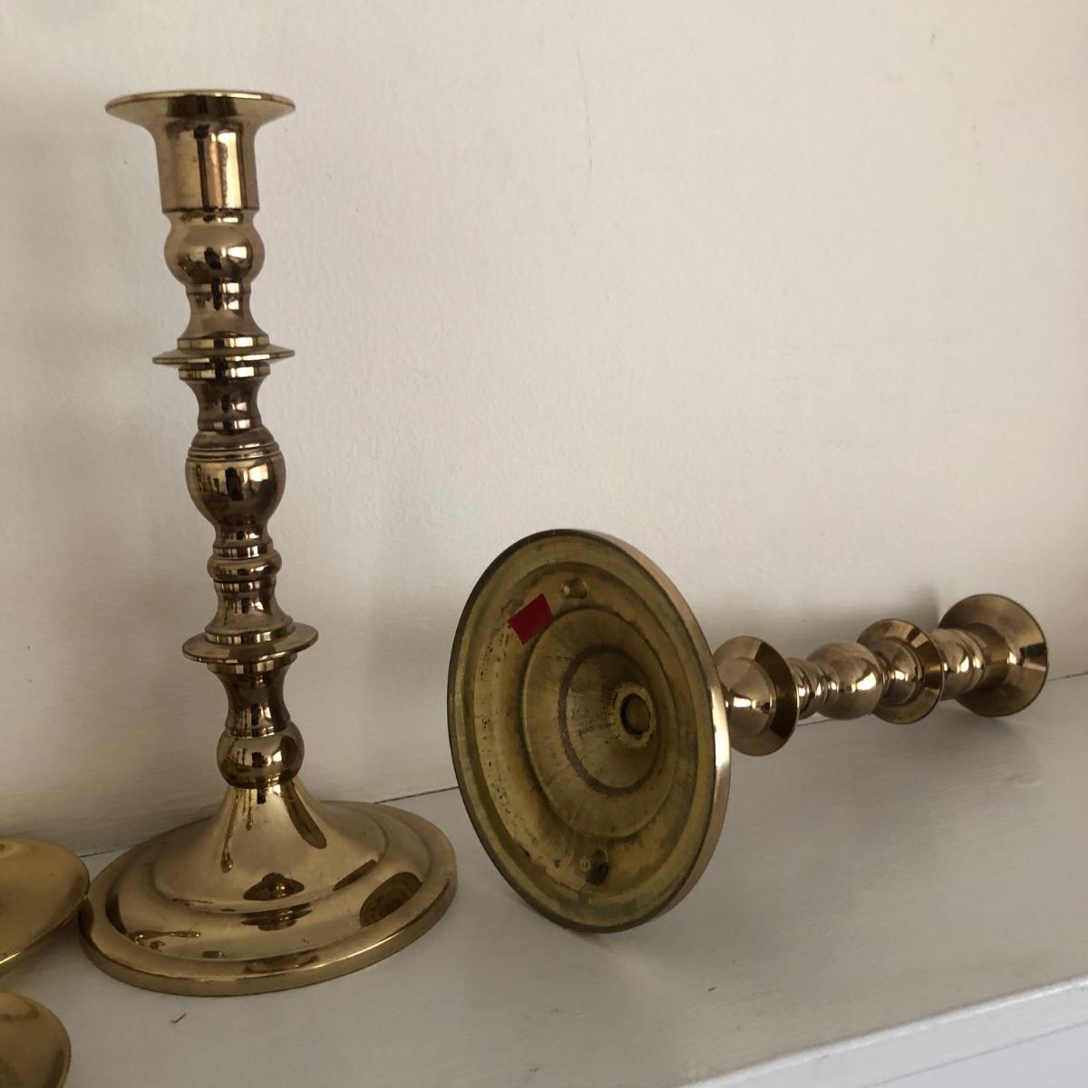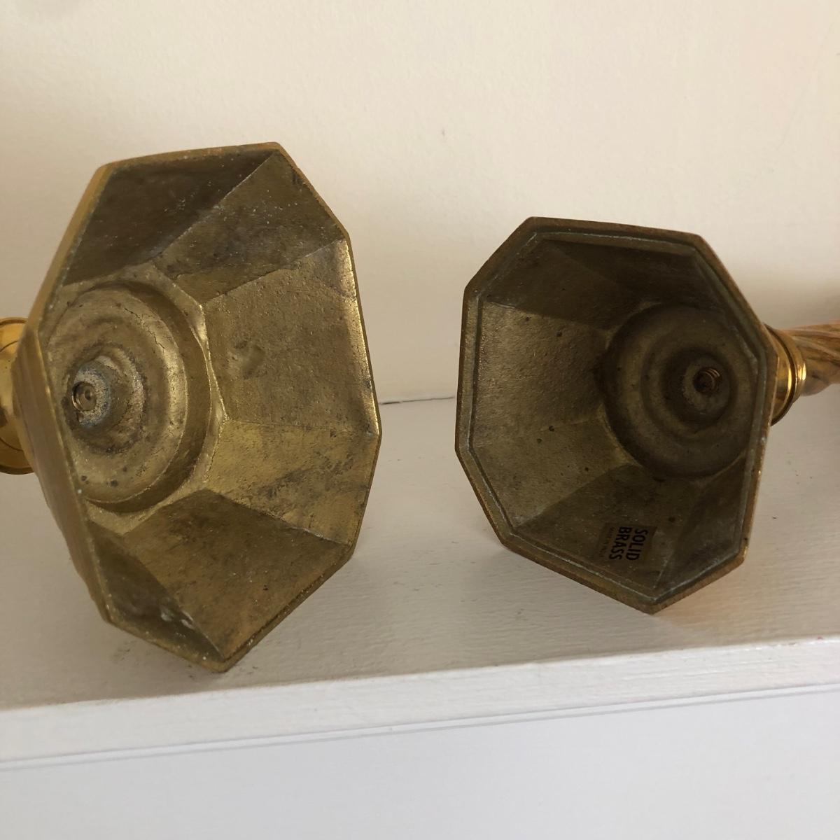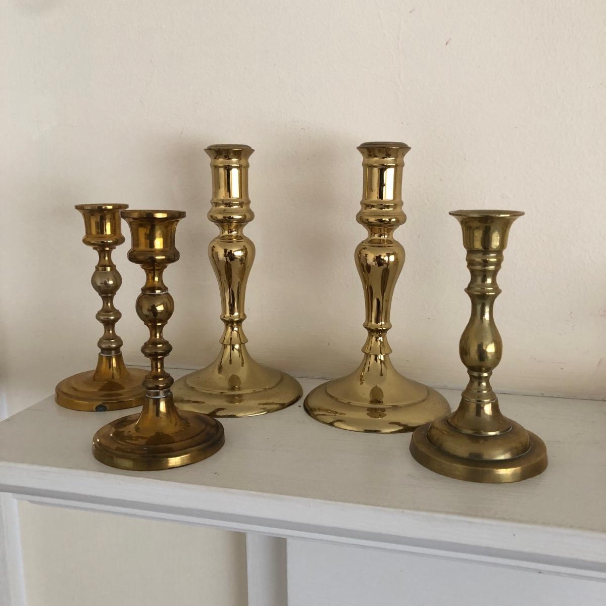 In this lot of twenty-three brass candlesticks, there are six with square bases, two candlesticks with octagonal bases, and fifteen candlesticks with round bases. The tallest candlesticks measure 10.5” tall and the shortest 3.5”. Note the four Baldwin and two Carolina Brass candlesticks. Local pick up only.