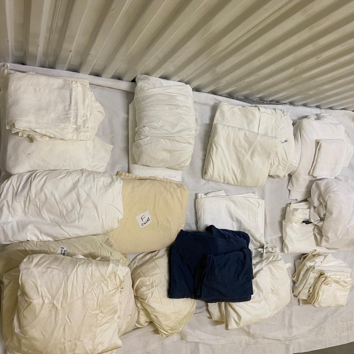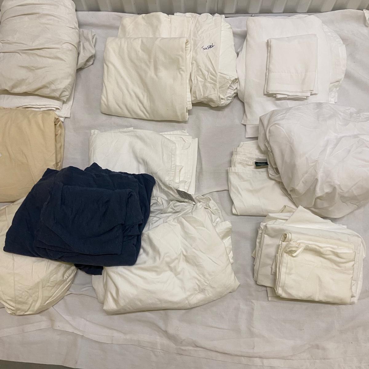 This lot contains oodles of twin and full sheets. There are six sets of fitted and top sheets and many more single sheets without a partner. Most are white but there are a couple patterned and one navy set. This lot also includes some extra pillowcases and duvet covers, again all size twin or full. Some brand names includes “Court of Versailles” and “Ralph Lauren”. Local pickup only.