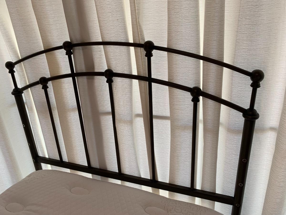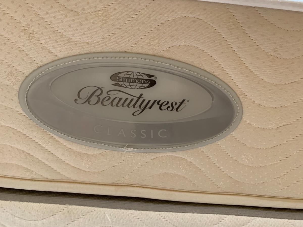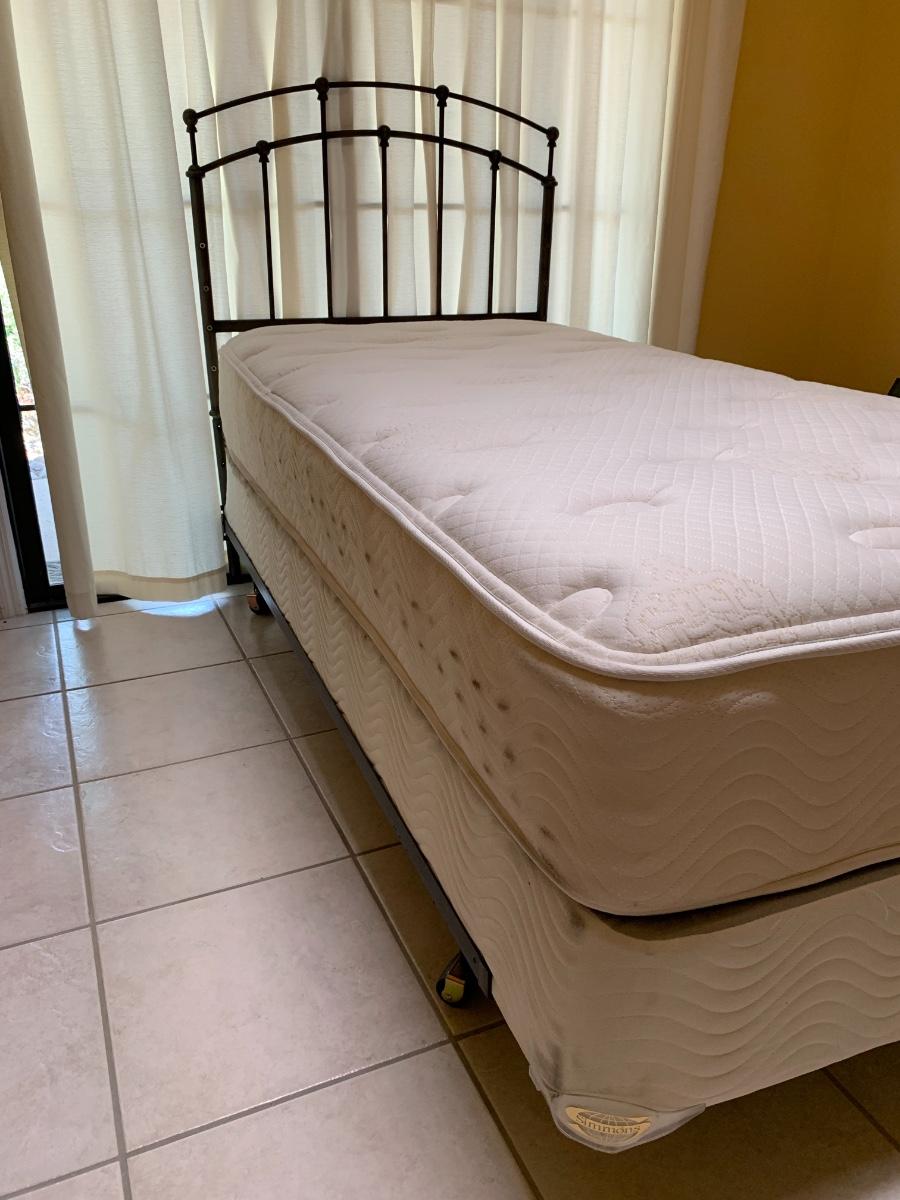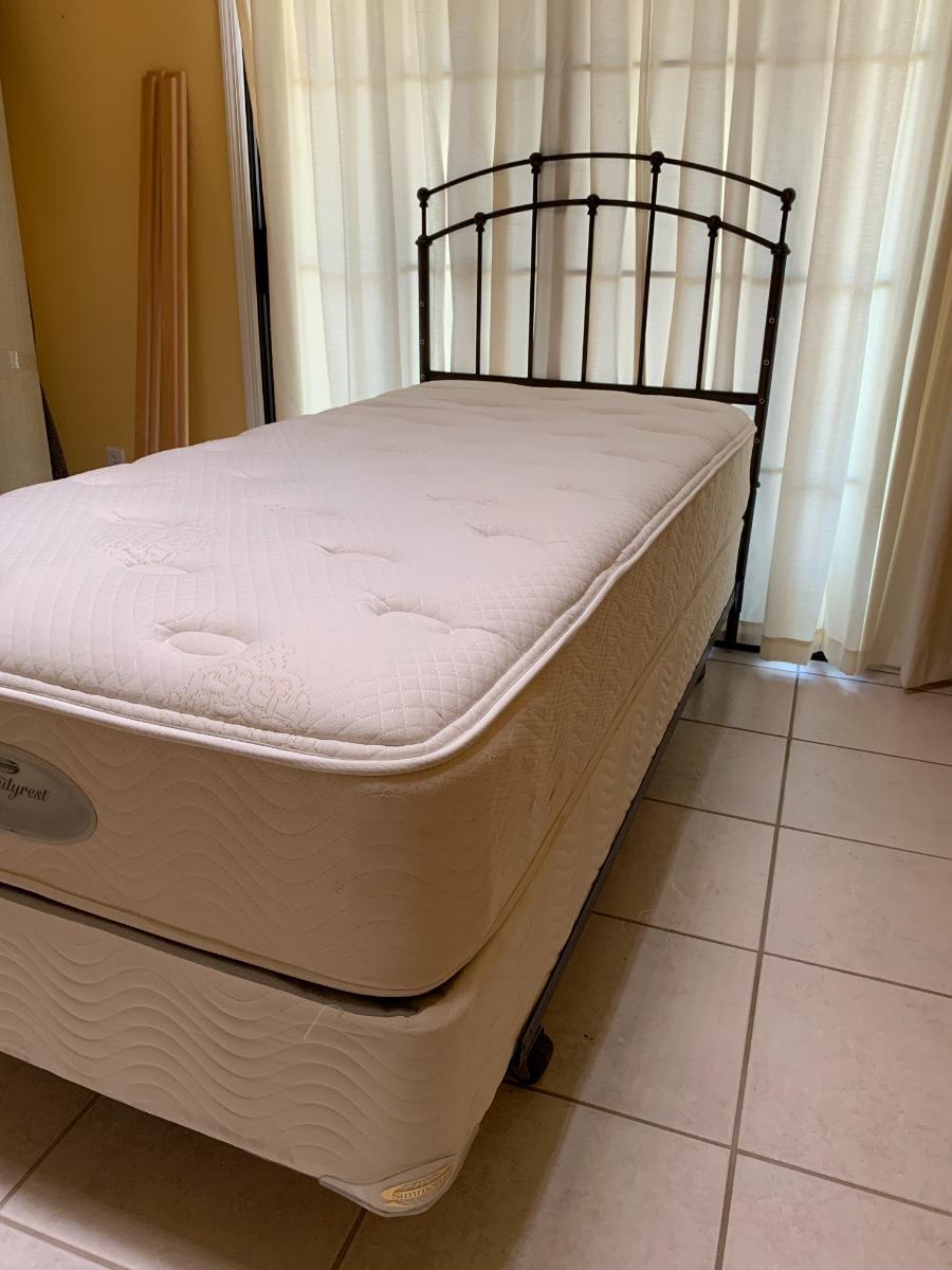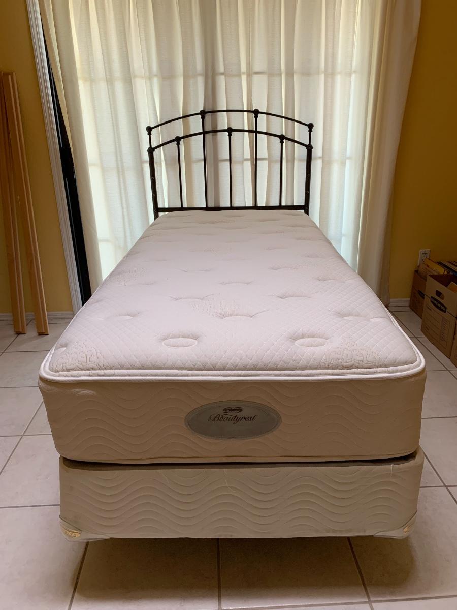 Beauty Rest Simmons twin bed with metal headboard. Includes box spring and frame with wheels.