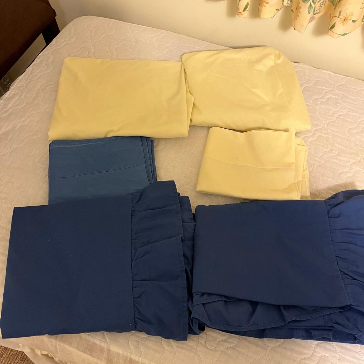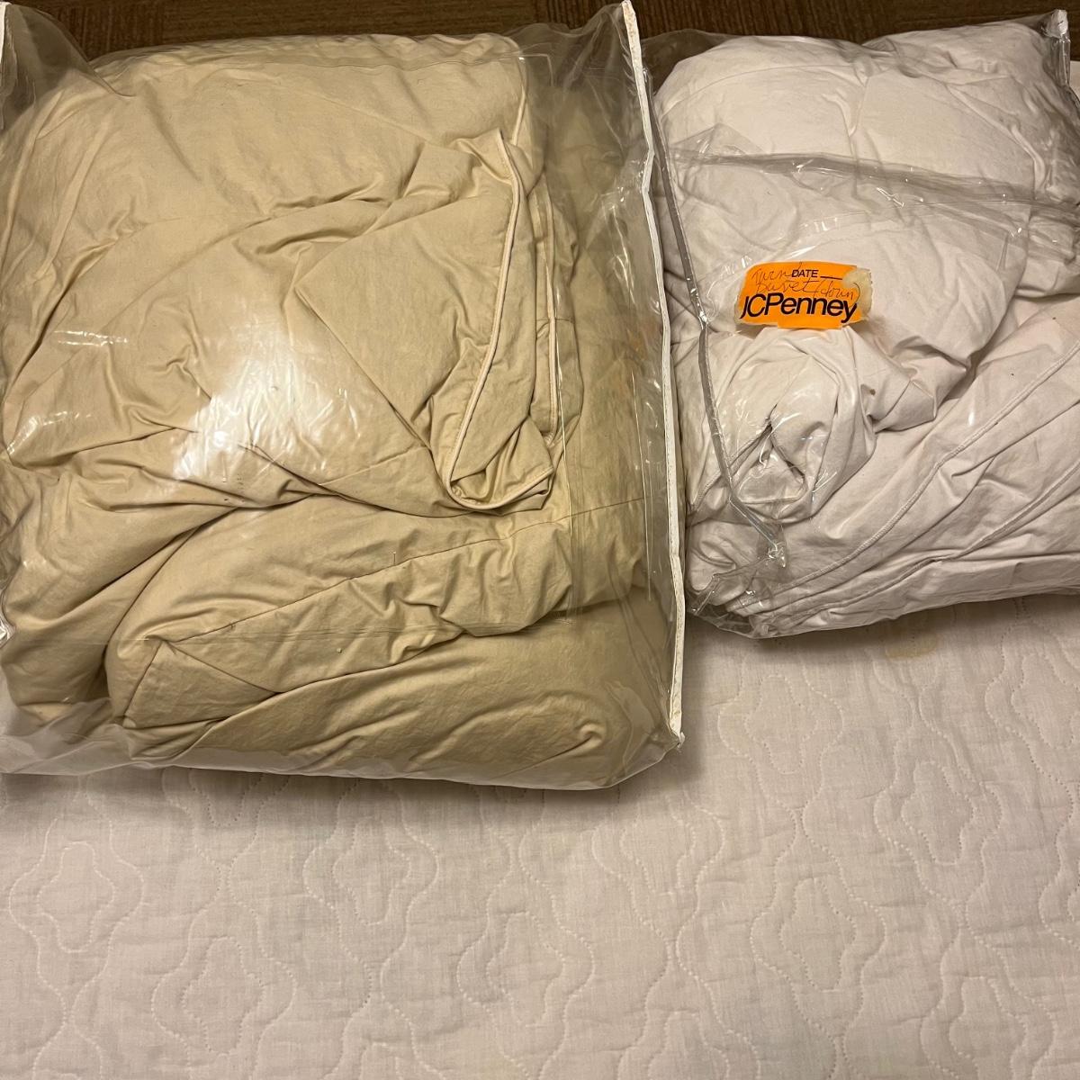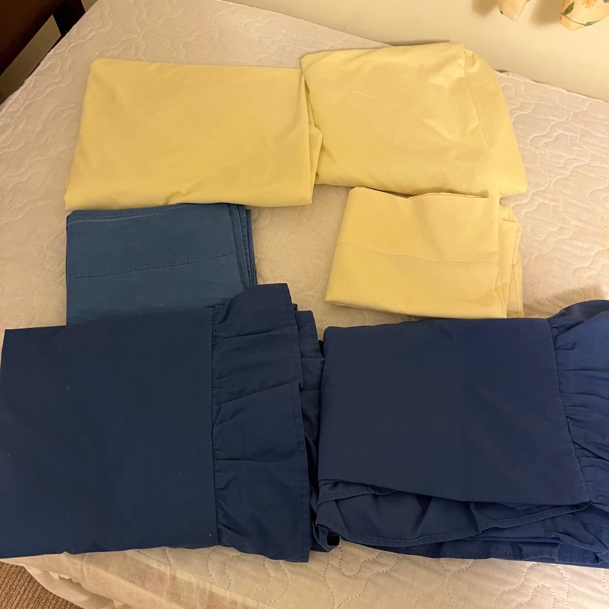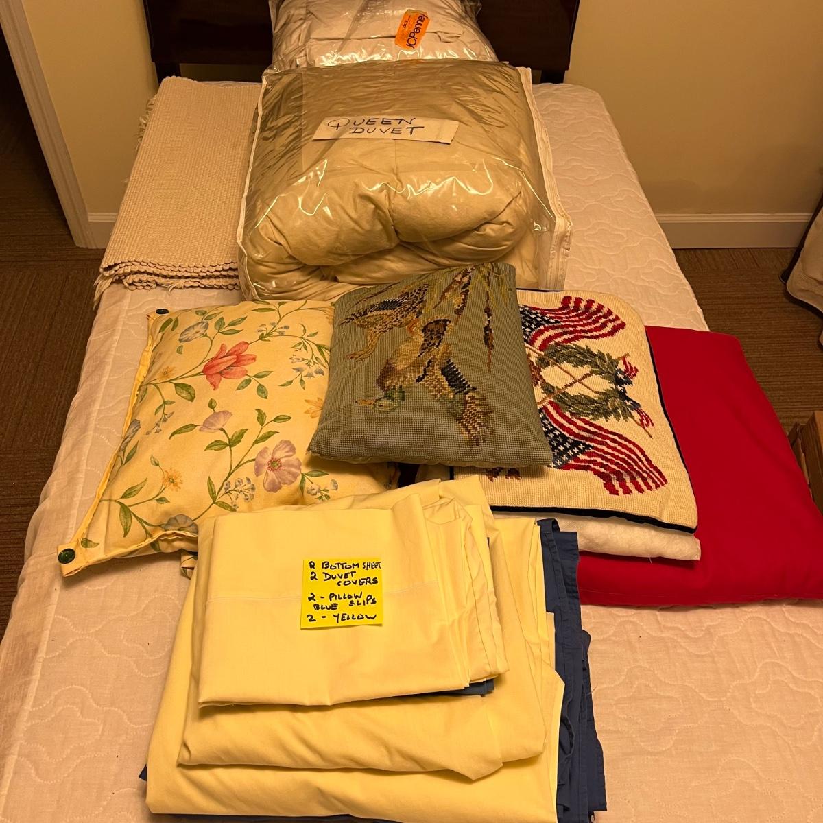 Lot includes two twin duvets, two twin duvet covers, two flat and two fitted twin sheets, embroidered pillow and embroidered pillow cover and two fabric pillows.