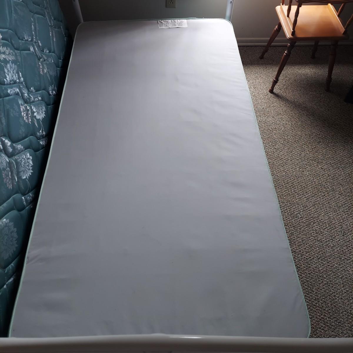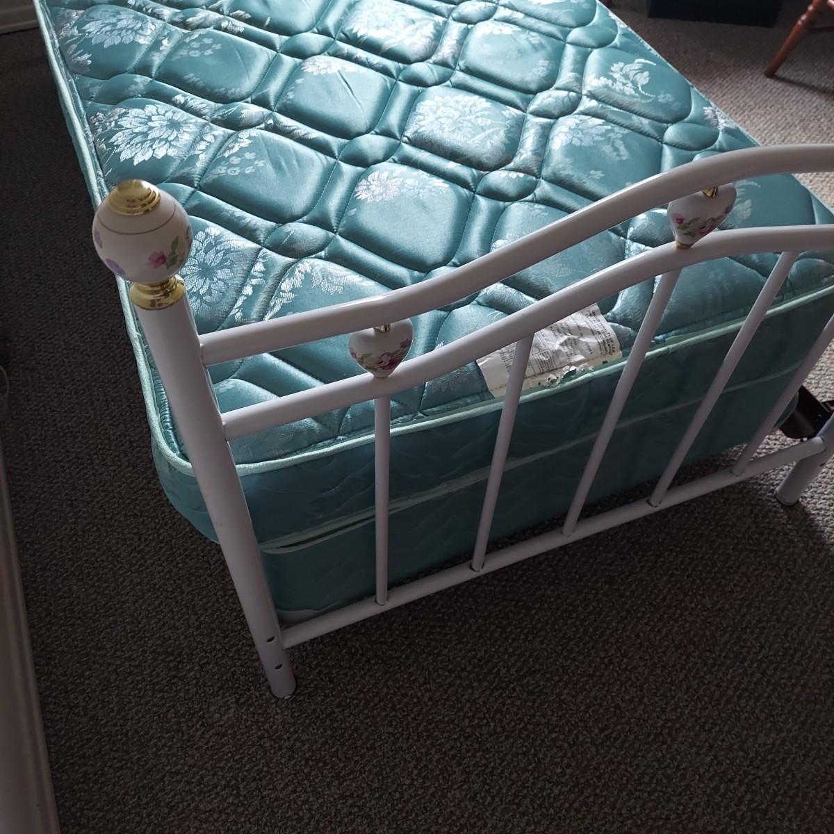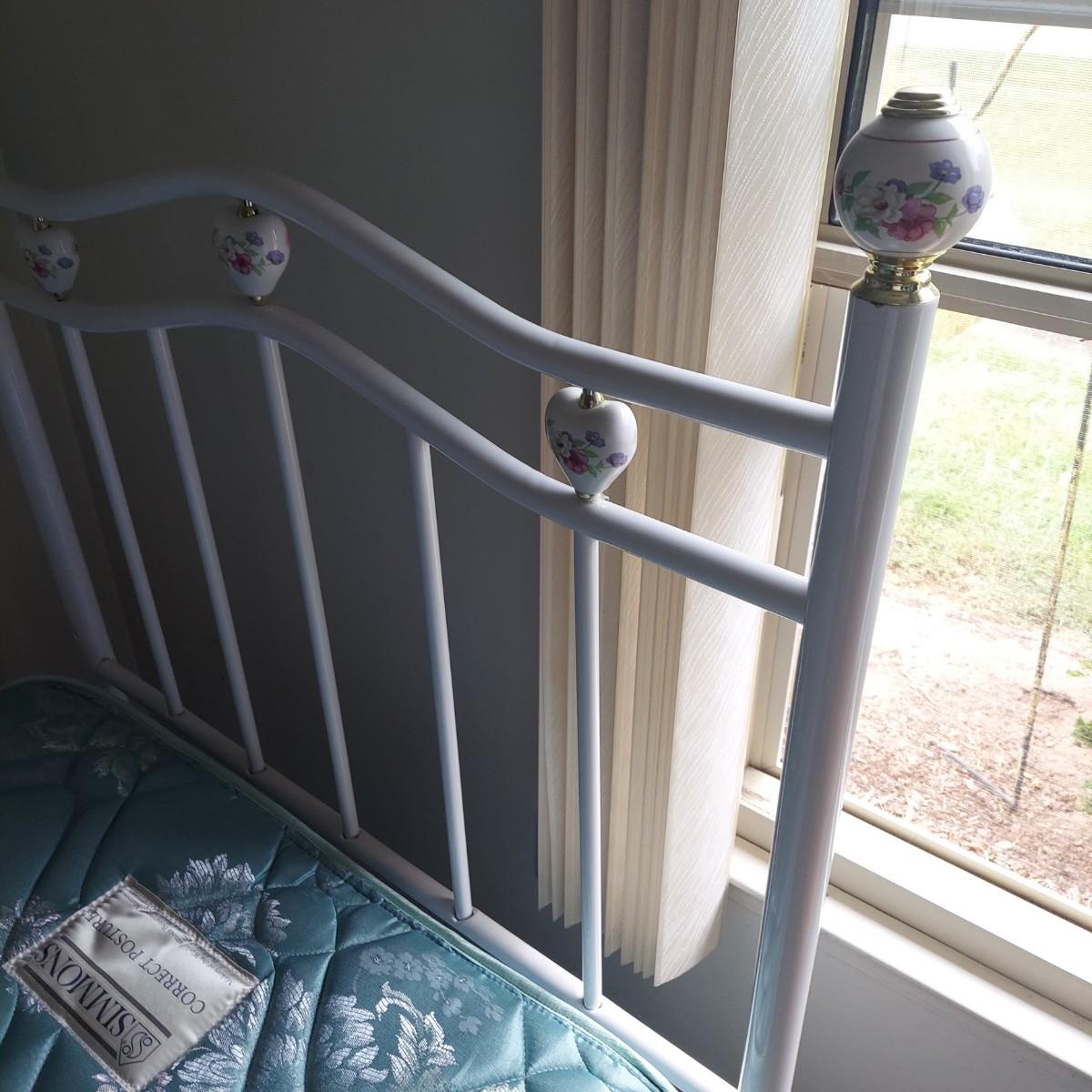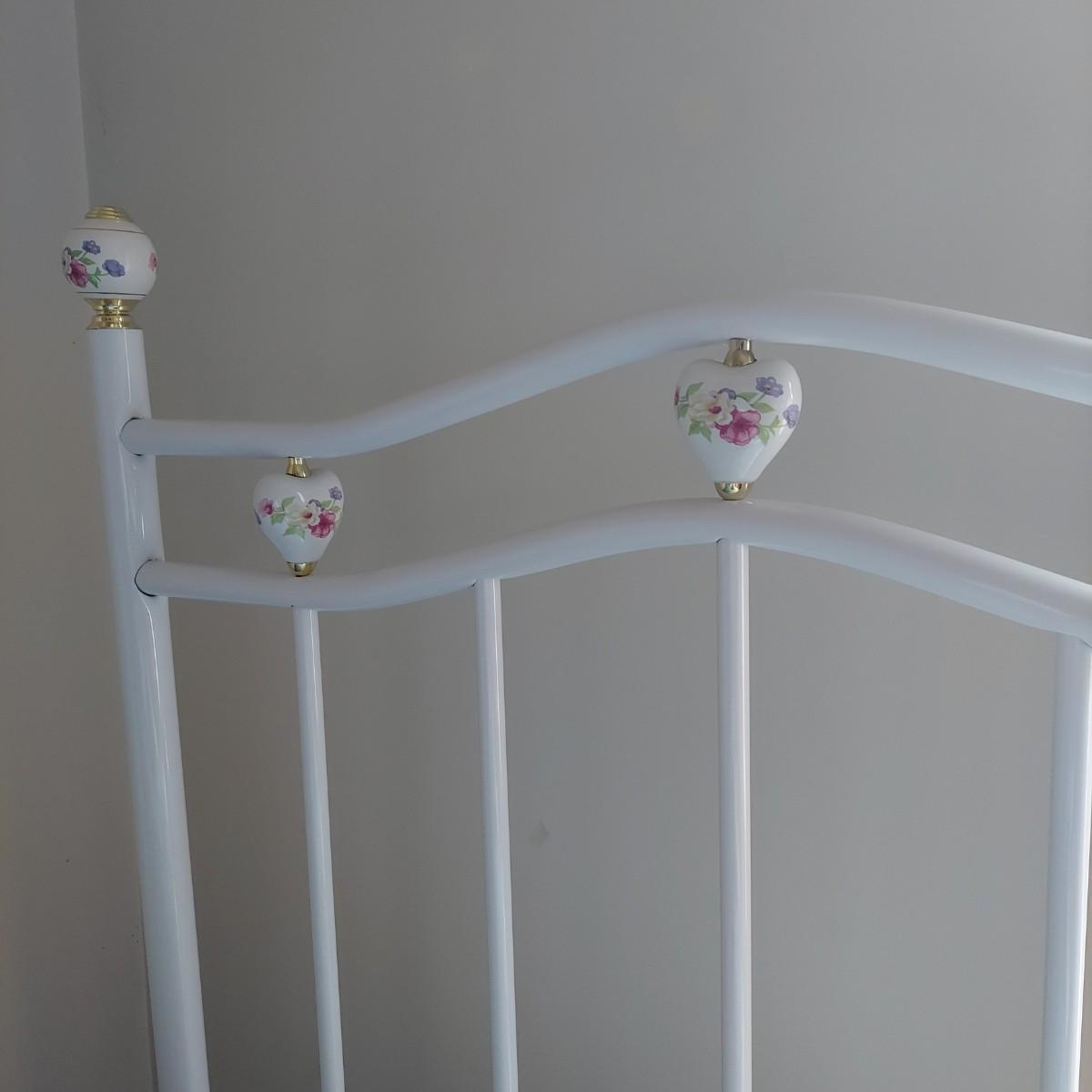 Twin size metal bed frame with some brass tone accents. There's floral detail on the bedknobs that carries over onto the heart accents as well. The frame measures approximately 39" x 79" x 50"H. The mattress is available to the winning bidder if desired, but the winning bidder is not required to take it. Please be prepared to take the frame apart when item is picked up. Local Pickup Only.