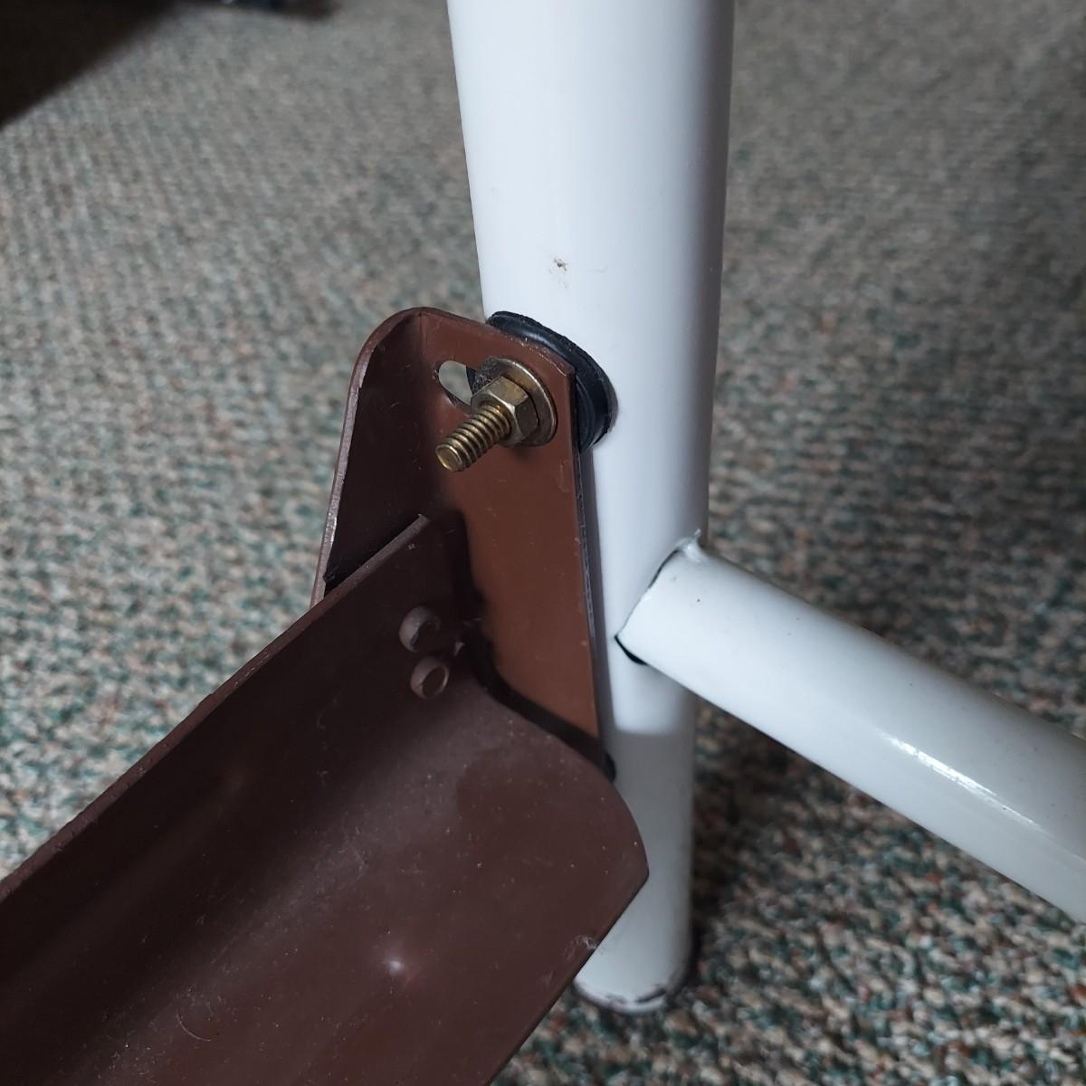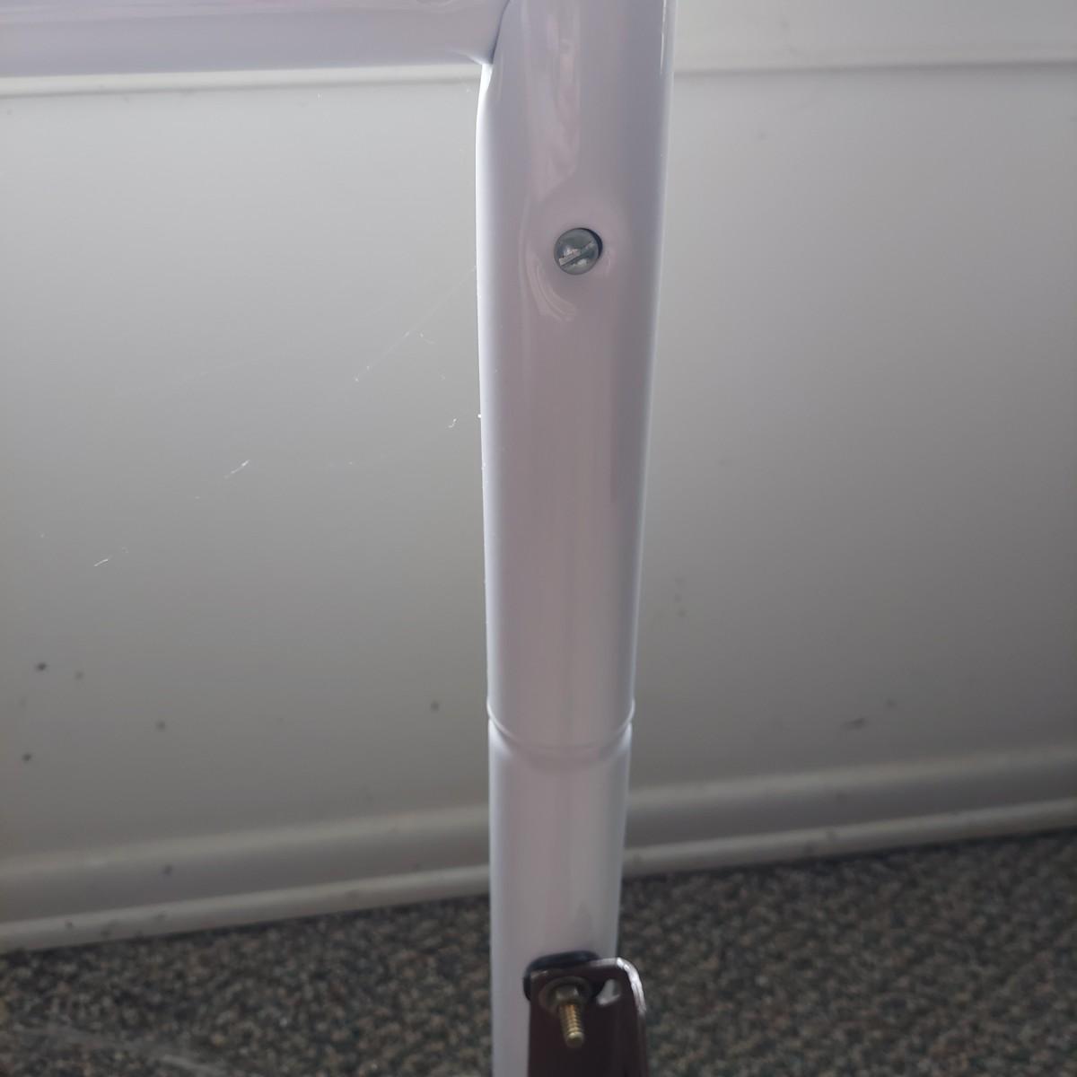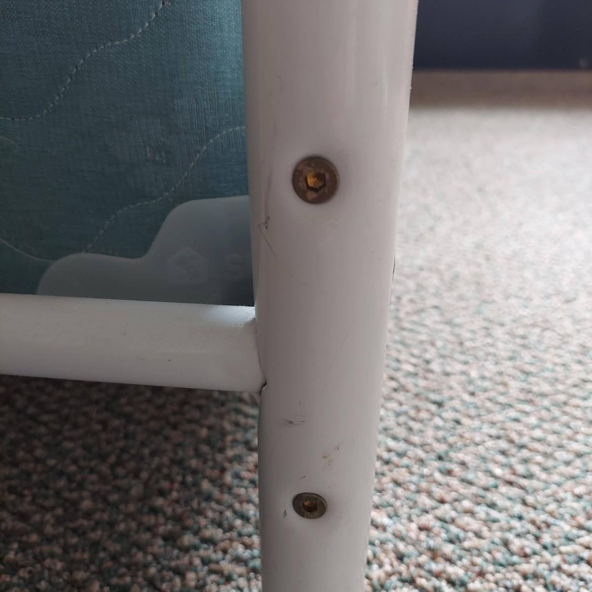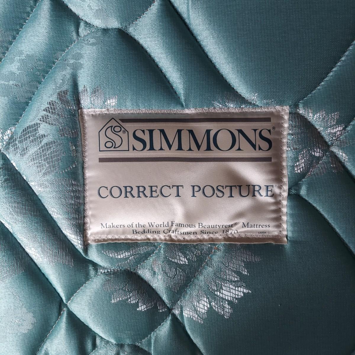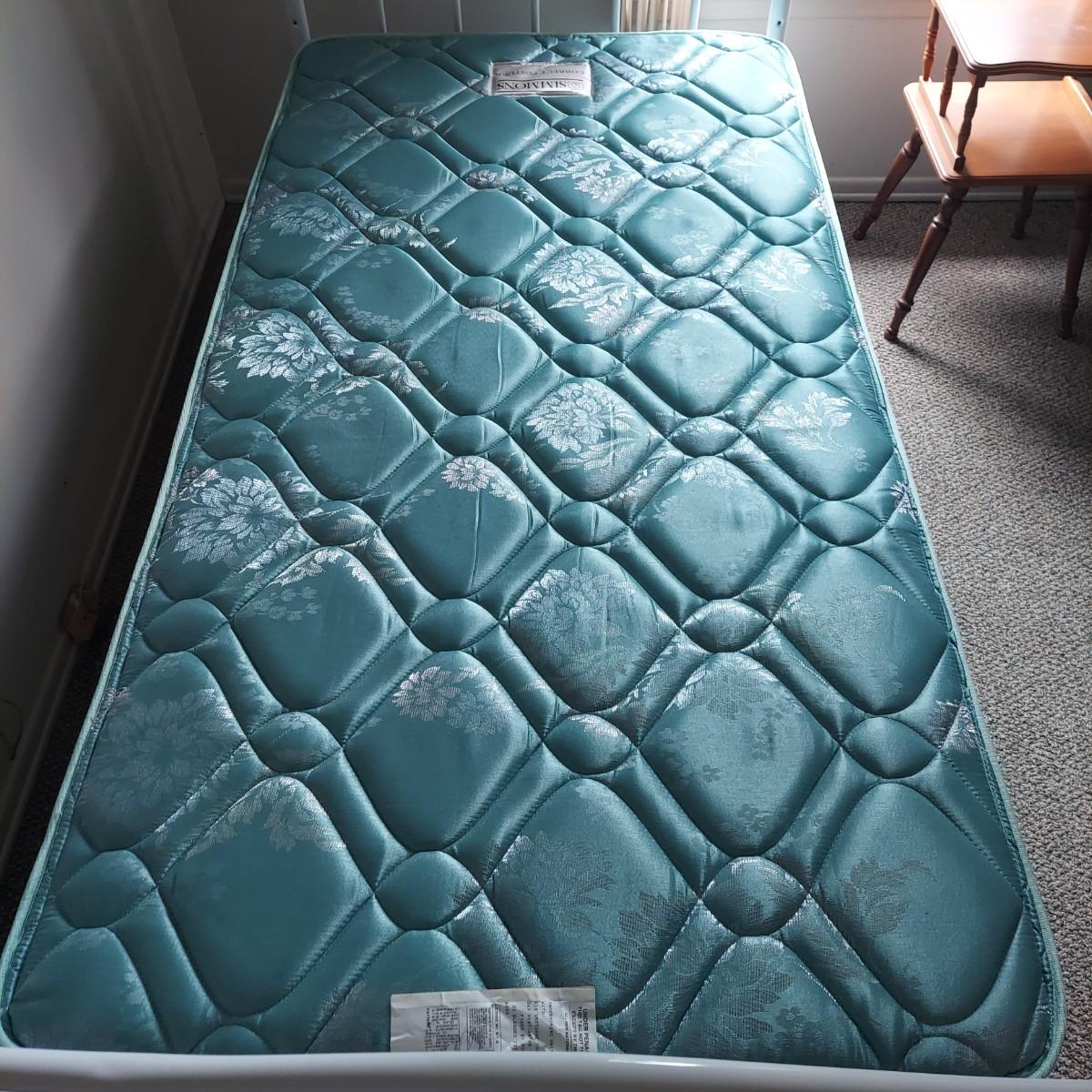 Twin size metal bed frame with some brass tone accents. There's floral detail on the bedknobs that carries over onto the heart accents as well. The frame measures approximately 39" x 79" x 50"H. The mattress is available to the winning bidder if desired, but the winning bidder is not required to take it. Please be prepared to take the frame apart when item is picked up. Local Pickup Only.