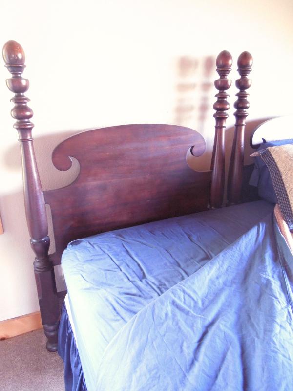 Bed includes two 39" x 75" beds pushed together on a steel rolling frame with stunning early american dark walnut poster headboards. Matress is King size Beauty Sleep by Simmons in excellent condition with no stains. Includes mattress cover. Supporting box springs are two twin size. Mattress manufactured 2009.