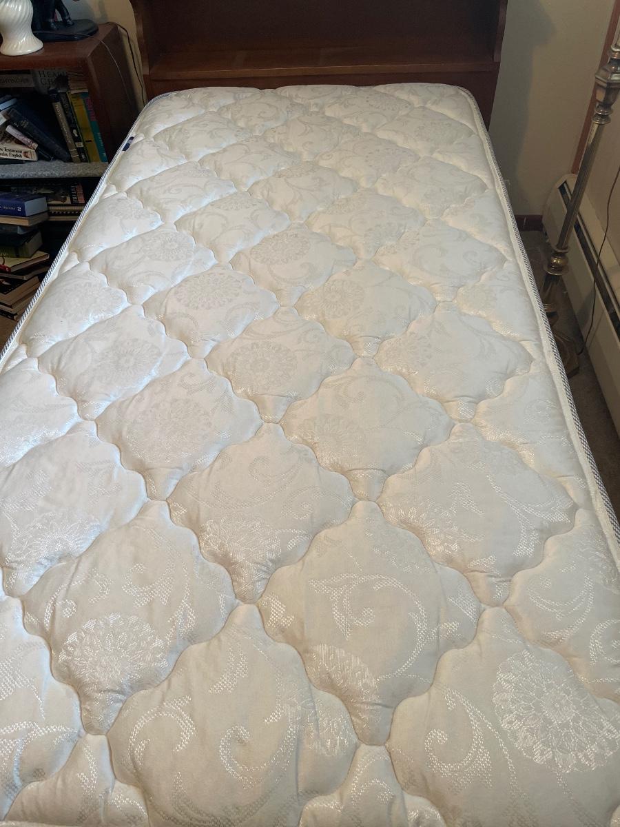 Nice clean twin mattress, frame and wood headboard