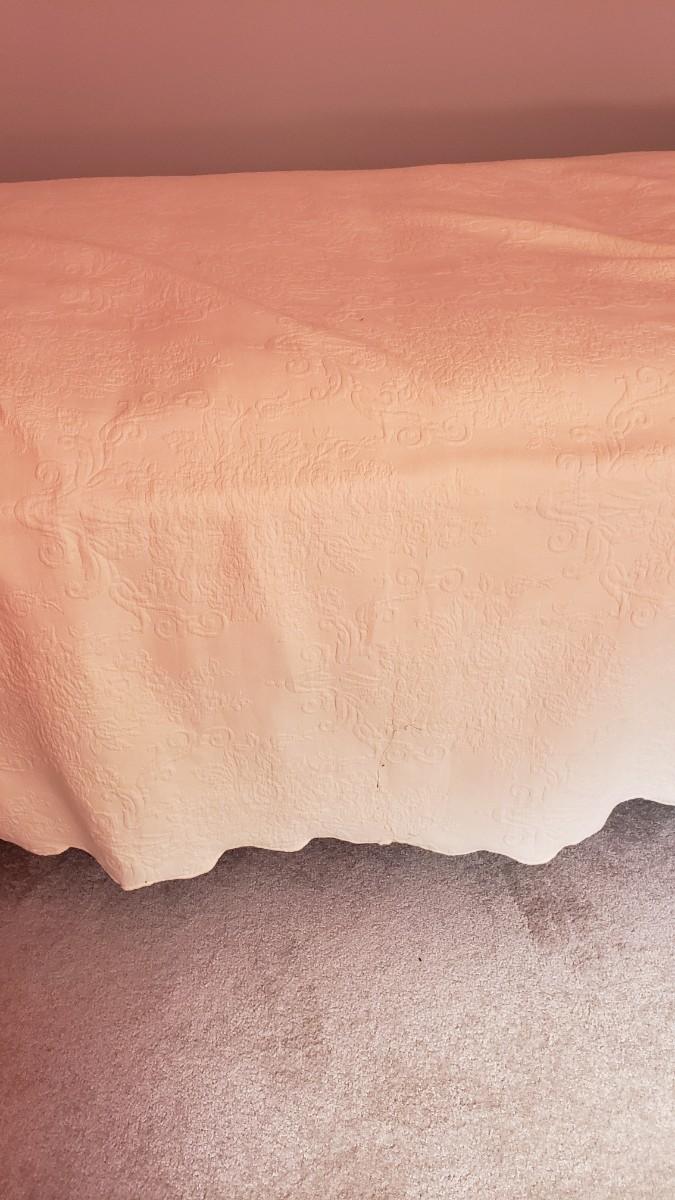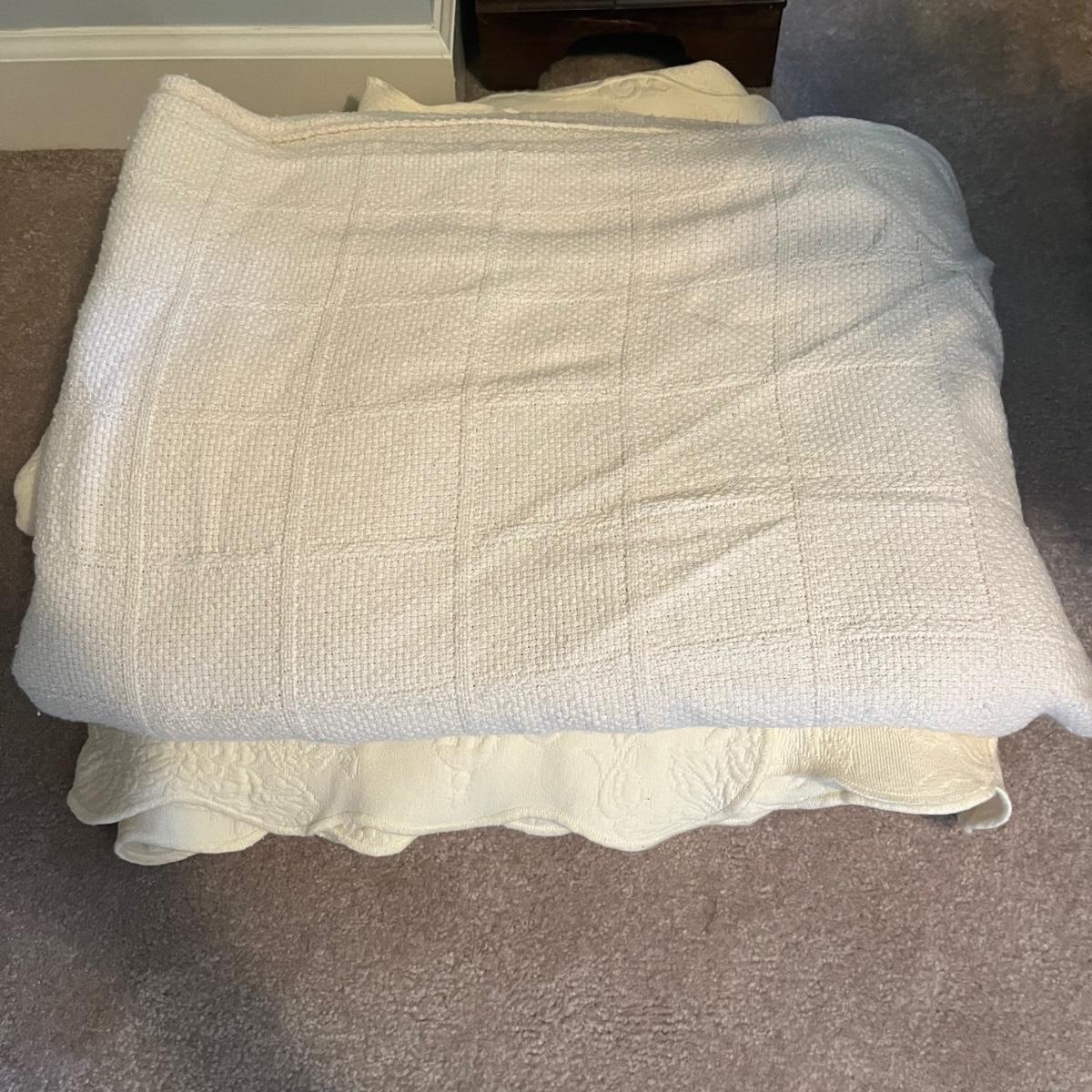This lot has two identical cream colored twin bed spreads from the JC Penny Home Collection. They are made from 100% cotton and appear to be in good condition. Also included are two sets of Columbia twin sheets, with a fitted, flat and one pillow case each. Finally included is a Ralph Lauren twin size cotton blanket. The last three pictures show the cream color of bed spreads, the first four are not the true color.